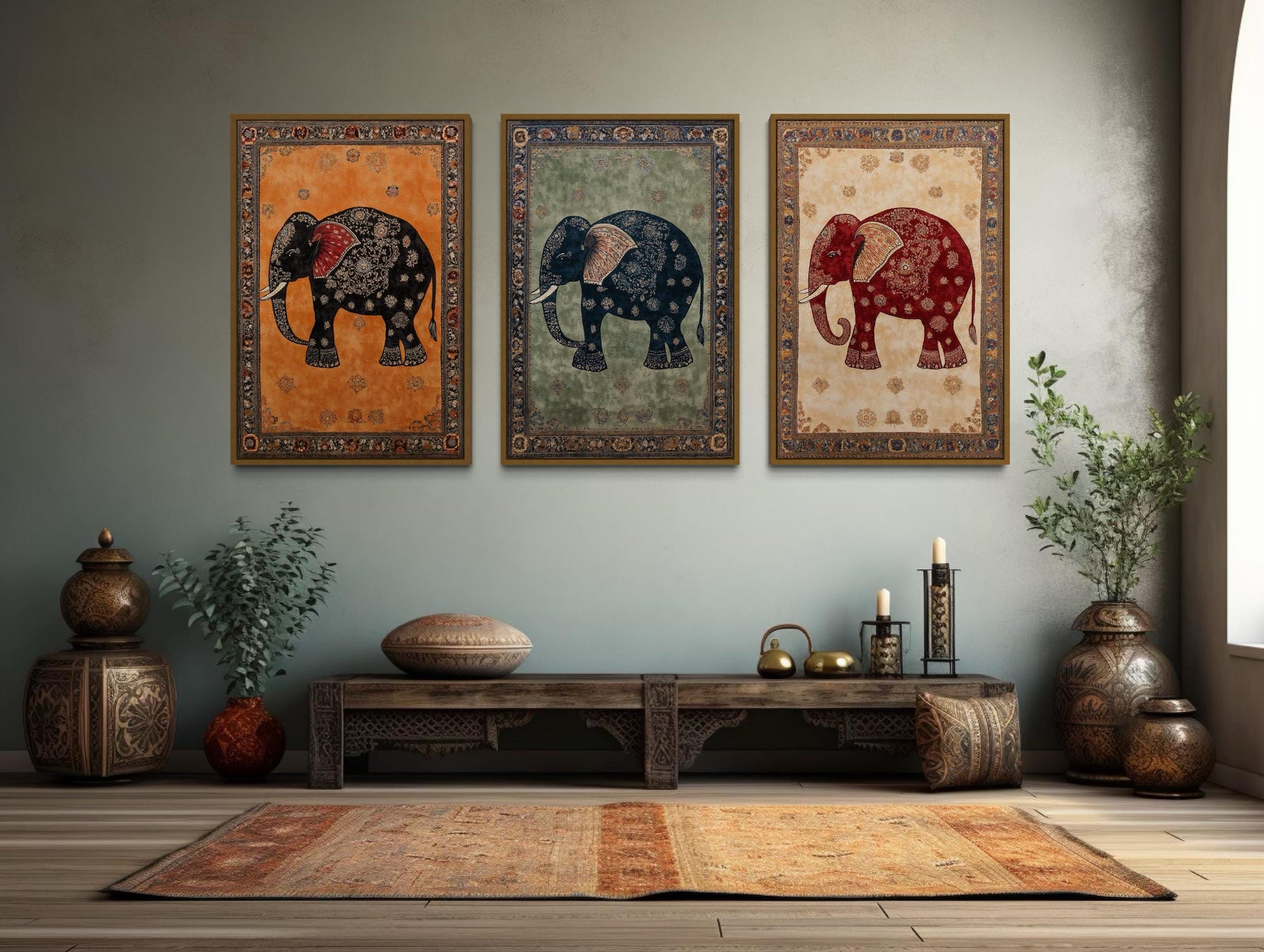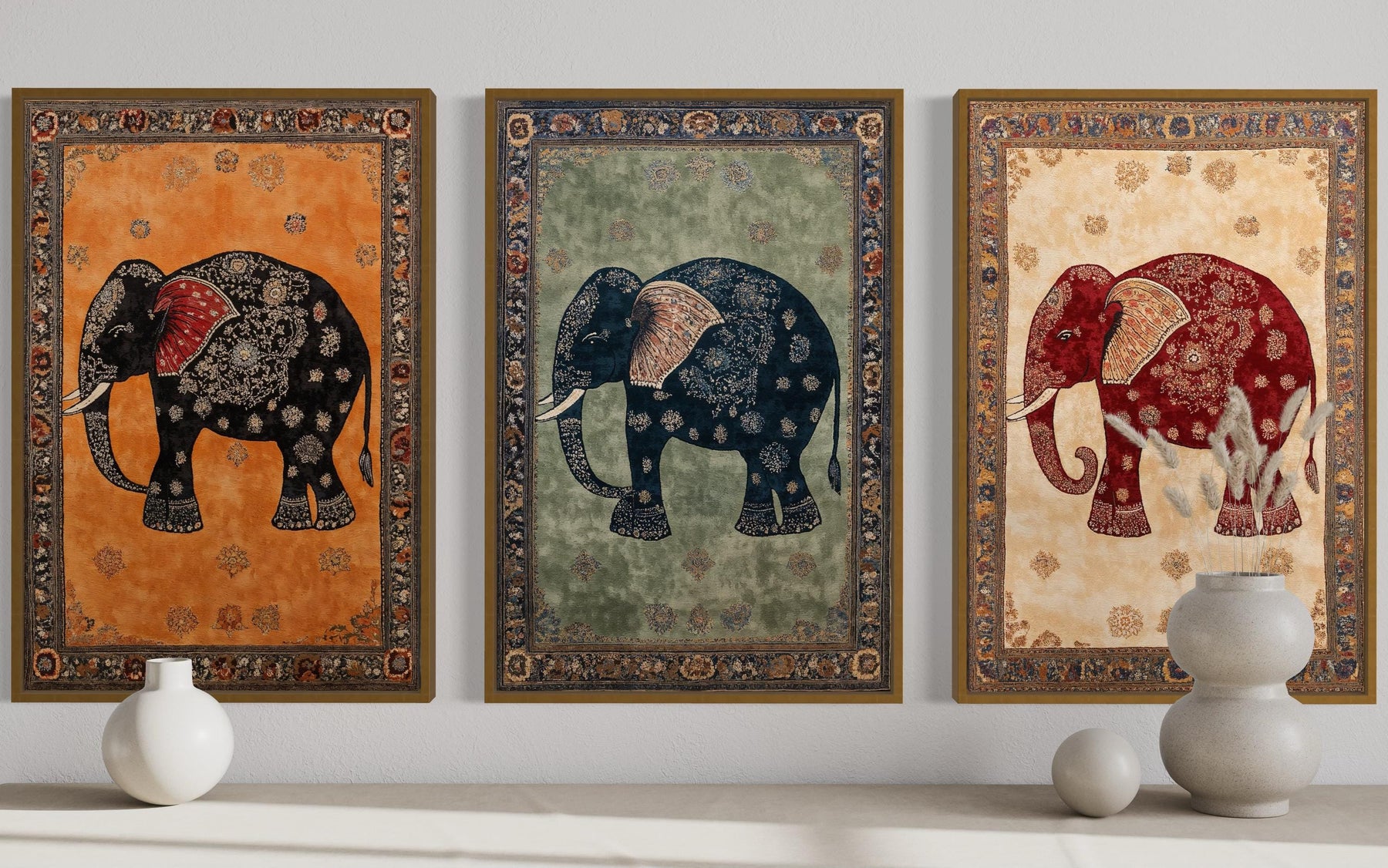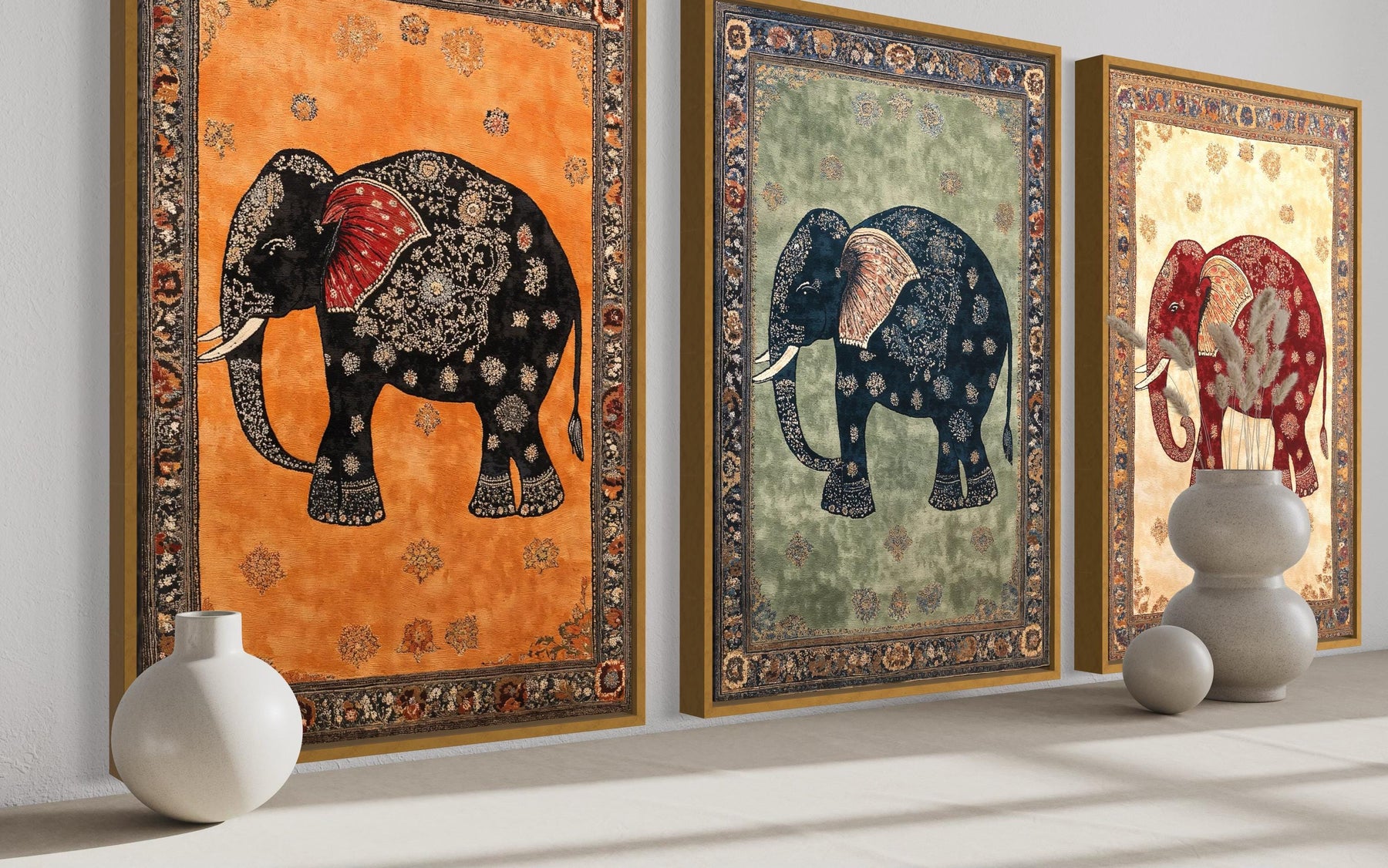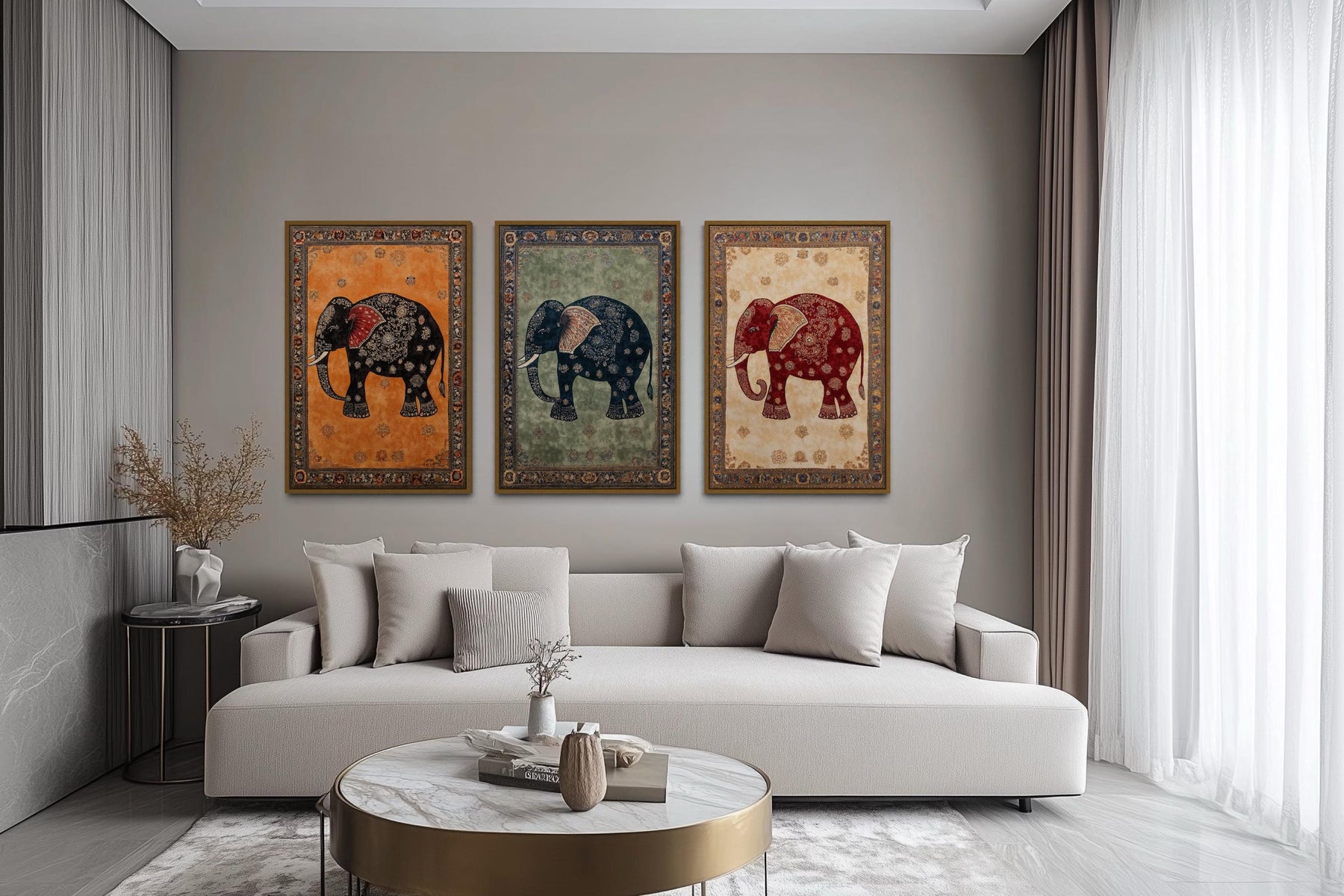 Our Indian Madhubani Elephant canvas wall art set of 3 brings the vibrant traditions of Indian folk art into modern homes with stunning color and intricate design. Each canvas print in this three-piece set showcases an elegantly decorated elephant, inspired by the centuries-old Madhubani style known for its detailed patterns and bold natural hues. The elephants appear regal and full of life, adorned with elaborate ornaments and framed by intricate floral borders that seem to dance across the surface. Earthy backgrounds in rich oranges, rustic browns, and deep greens provide a warm foundation, making each panel a masterpiece on its own and even more striking as a coordinated trio. The fine linework and symmetrical motifs reflect the careful handwork of traditional artisans, while the high-quality canvas print preserves every detail in crisp, enduring color. The vertical format of each panel makes this set ideal for creating a dramatic gallery wall or filling a tall, narrow space with rich cultural energy. Together, the three pieces tell a story of heritage and strength, celebrating elephants as symbols of wisdom, good fortune, and stability. From the first glance to the lasting impression, our Indian Madhubani Elephant wall art offers a powerful fusion of tradition and contemporary elegance in one extraordinary Indian Madhubani Elephant canvas print.