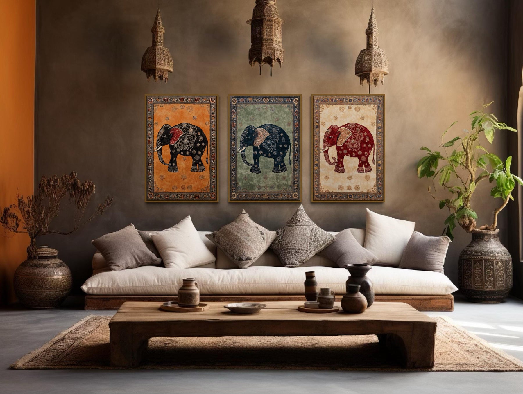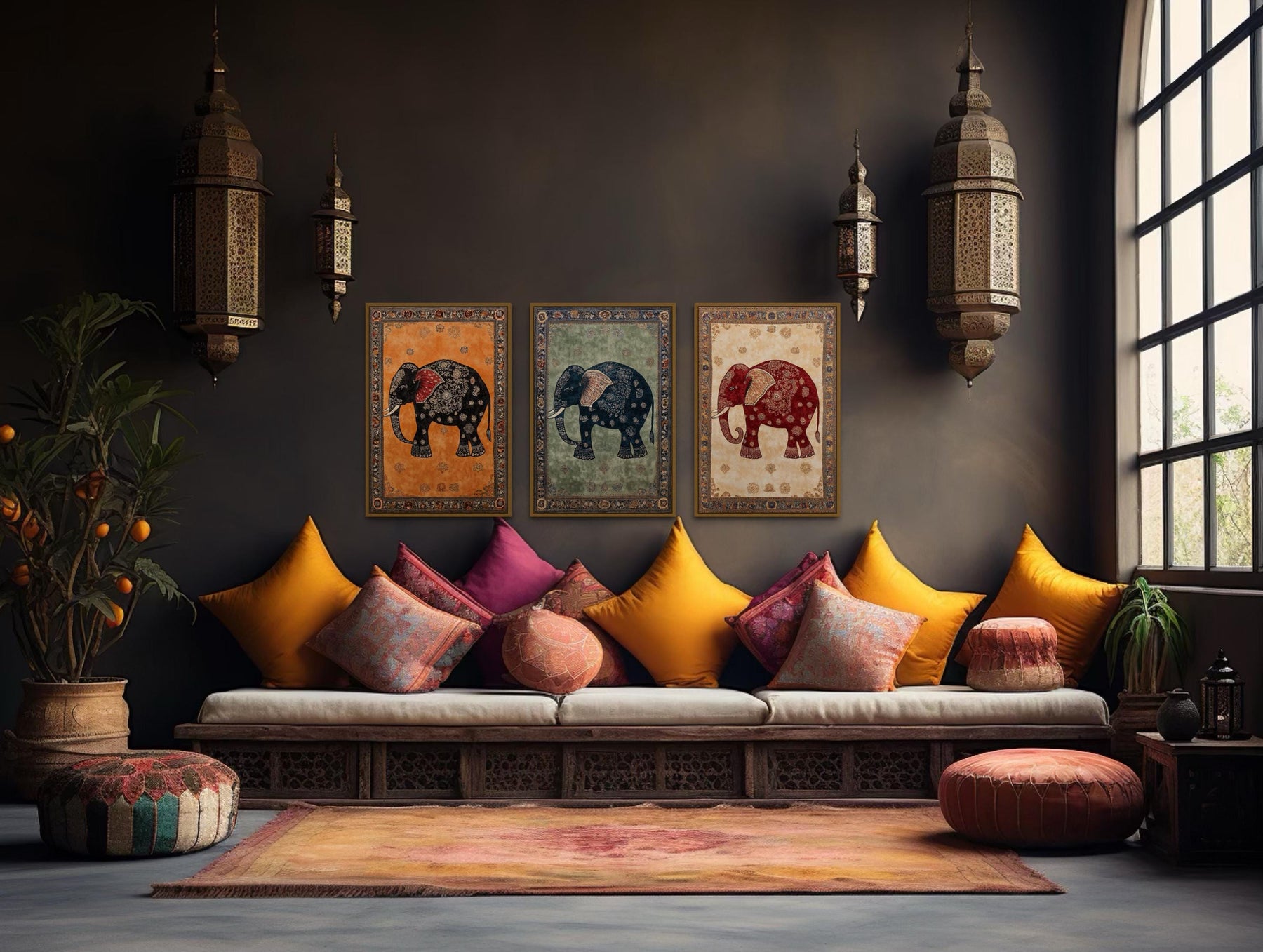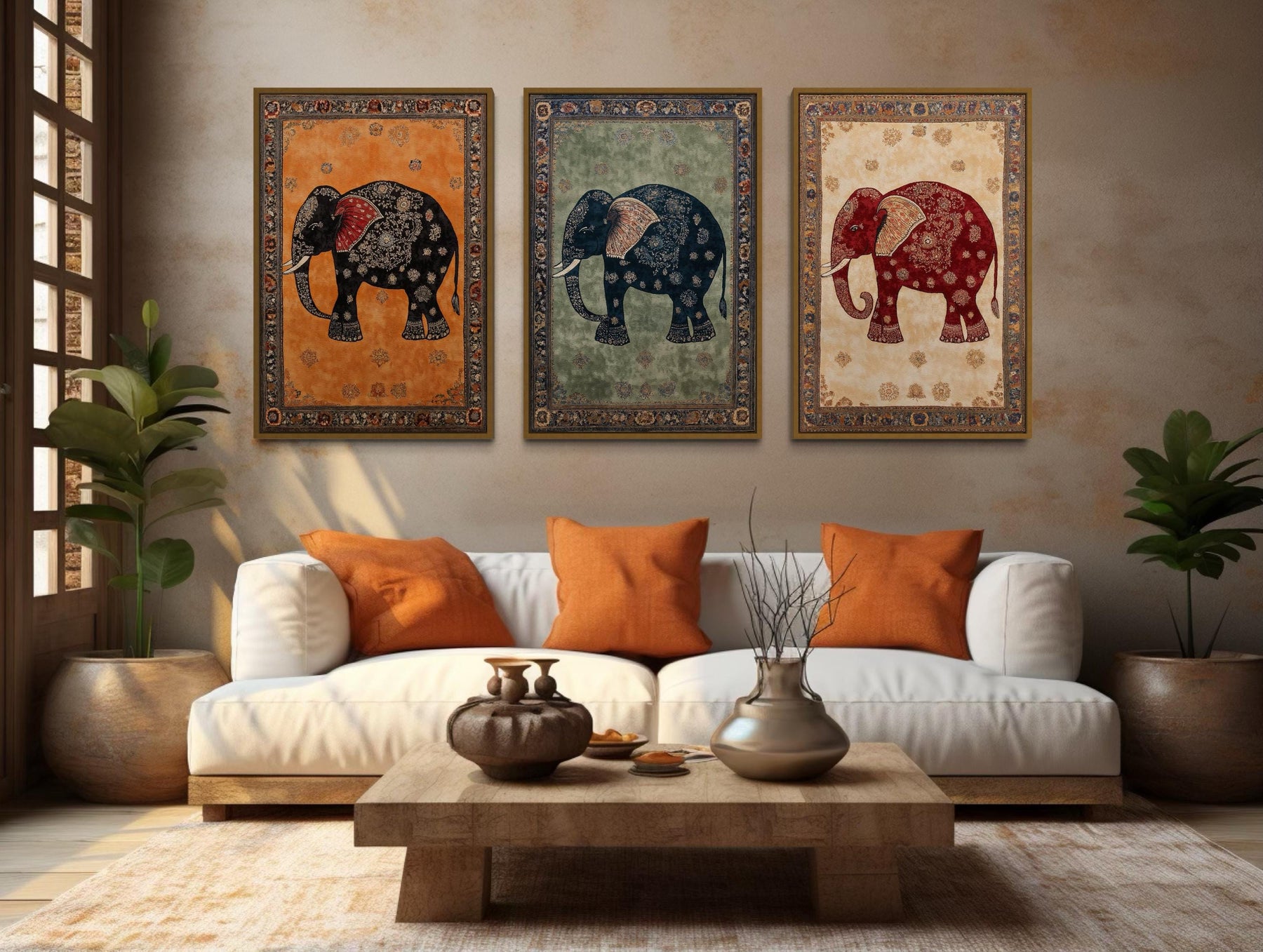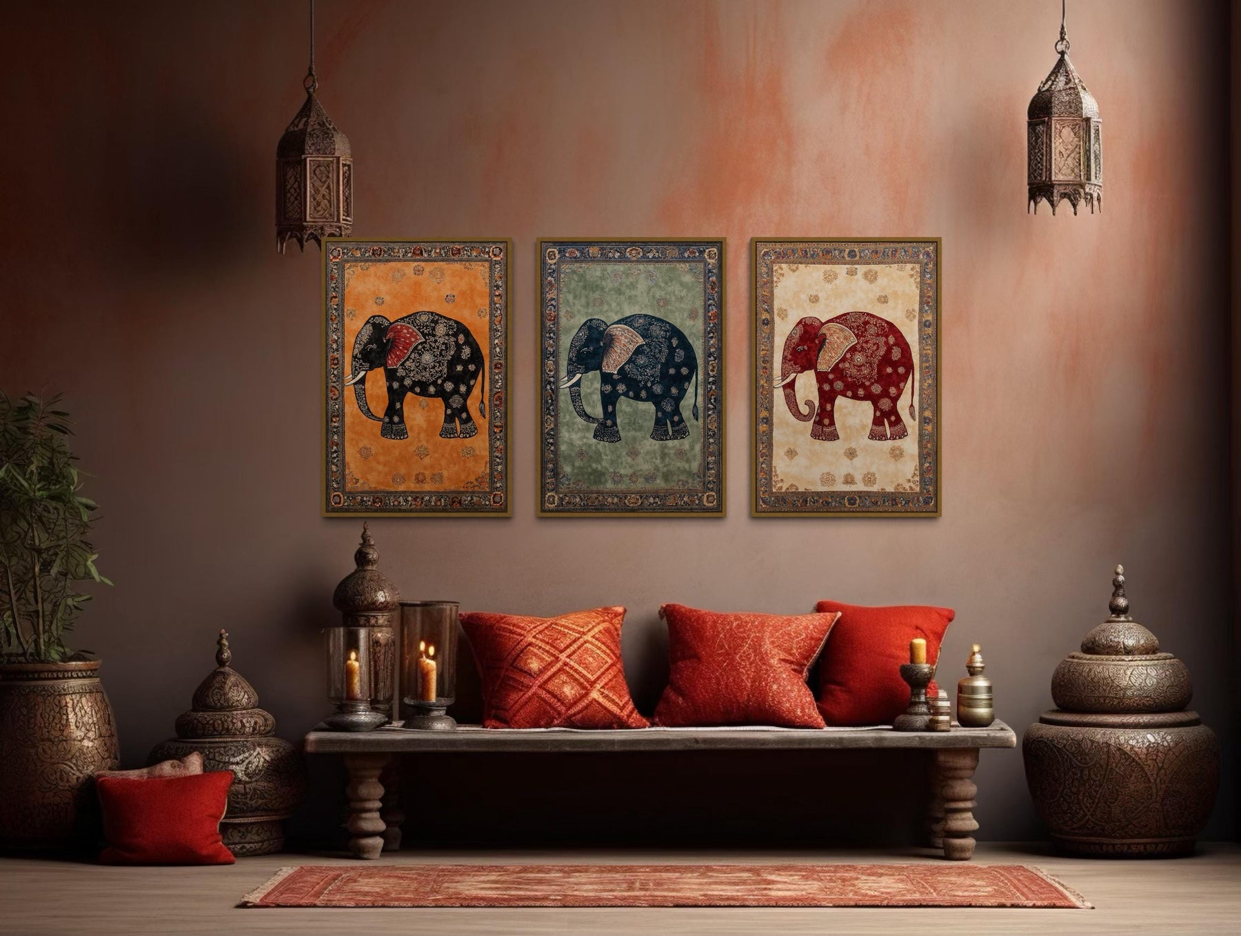 This Indian Madhubani Elephant canvas wall art set of 3 is perfect for interiors that celebrate world culture and artistic craftsmanship, making it an inspired choice for bohemian living rooms and serene meditation spaces. In a bohemian living room filled with layered textiles, handcrafted furniture, and global accents, the vibrant elephants harmonize effortlessly while adding a captivating focal point. Meditation rooms or yoga studios benefit from the elephants’ symbolism of wisdom and peace, creating a tranquil atmosphere that encourages focus and spiritual reflection. The tall, slim proportions of each panel make them easy to arrange vertically for dramatic height or horizontally for a gallery-style display. Their earthy tones and bold patterns pair beautifully with natural wood, woven rugs, and indoor greenery, enhancing the organic warmth of any globally inspired setting. Contemporary homes also gain cultural depth as these traditional designs provide contrast and storytelling against modern minimalist backdrops. Installation is quick with ready-to-hang hardware, while durable canvas construction ensures effortless maintenance for years of enjoyment. Whether displayed as a complete set or creatively separated to grace multiple walls, this artwork invites conversation and appreciation for the rich visual heritage of India. Collectors who value authentic world art will find this set a meaningful and lasting addition to their decor. Concluding with timeless elegance and vibrant tradition, our Indian Madhubani Elephant wall art completes any culturally inspired home with enduring beauty.