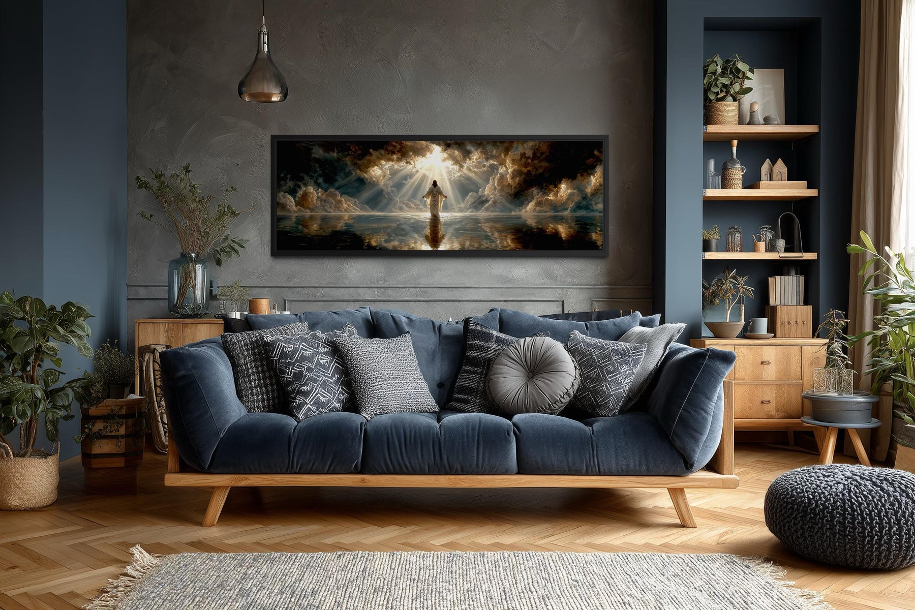 Panoramic canvas print of Jesus walking on water displayed above a blue sofa in a modern living room.