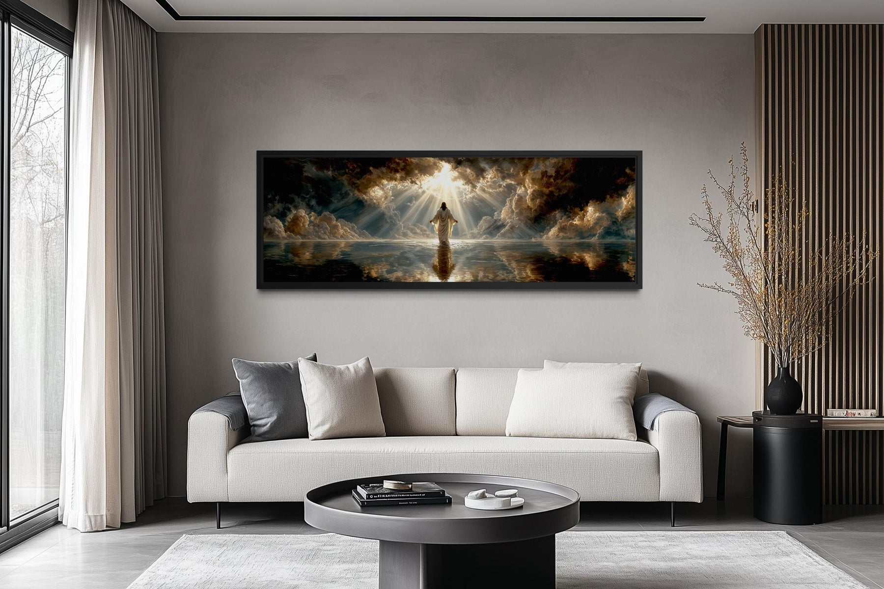 Panoramic canvas print of Jesus walking on water displayed above a modern sofa in a living room.