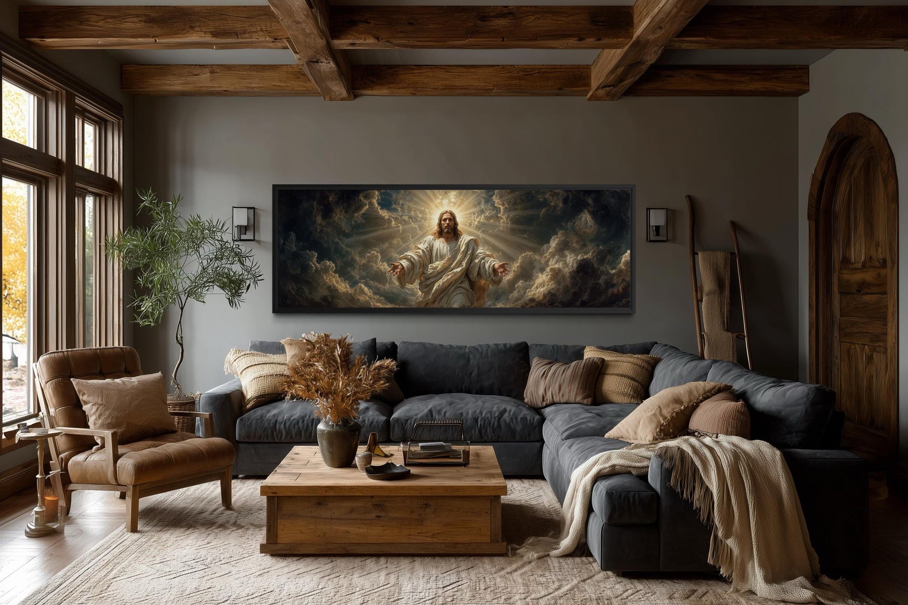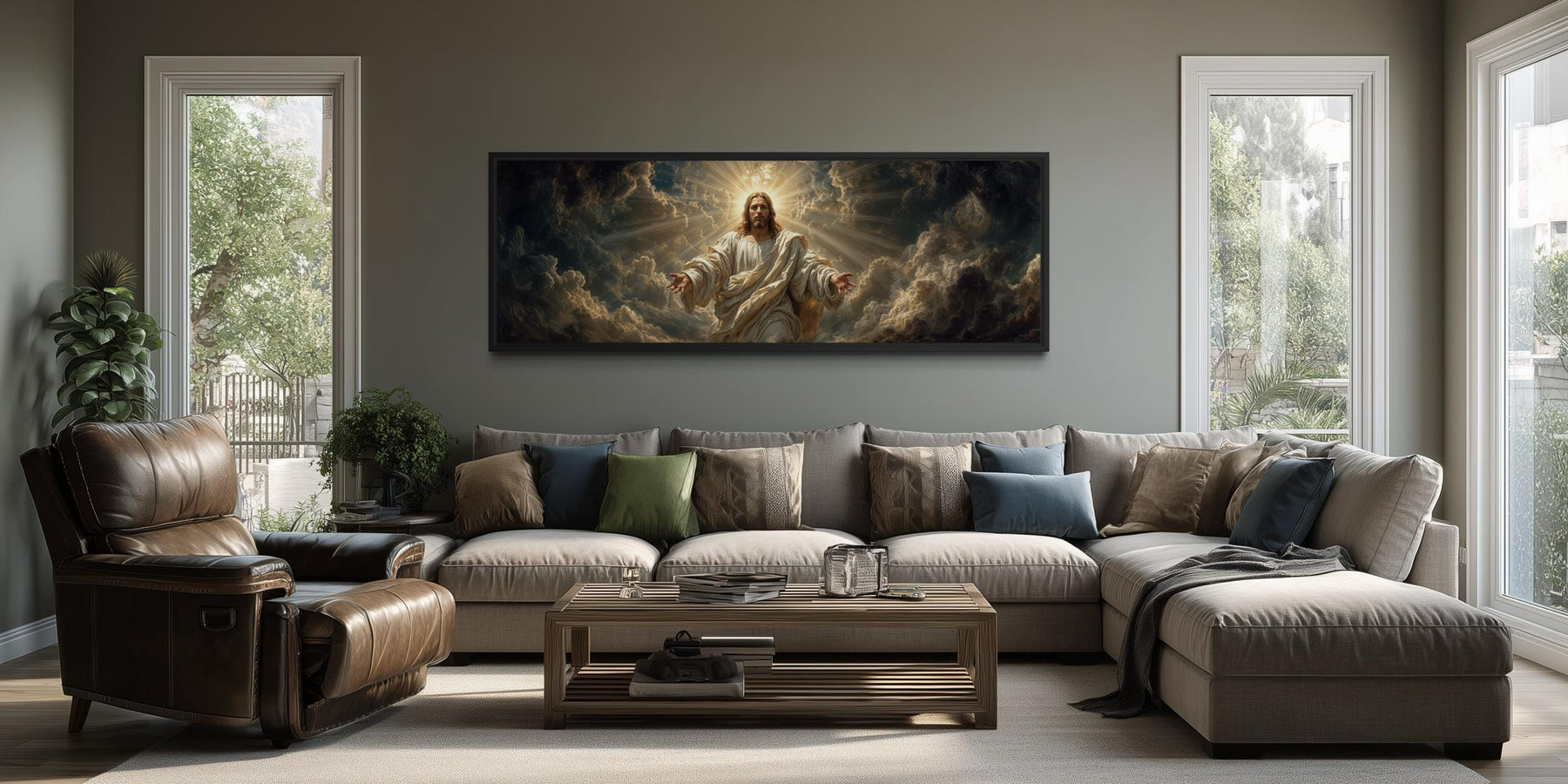Our Jesus wall decor is especially well suited for Christian homes and prayer-focused spaces where faith is an intentional part of daily life. This artwork works beautifully as a focal piece above a sofa, console, or altar area where it can be viewed without visual distractions. It is ideal for spaces designed for reflection, worship, or quiet moments rather than high-traffic or purely decorative rooms. The panoramic format complements wider wall areas commonly found in living rooms dedicated to family gatherings rooted in faith. In a prayer room, it reinforces a sense of peace and spiritual grounding without feeling overwhelming. The artwork also fits naturally into traditional Christian interiors that use warm woods, neutral textiles, and classic furnishings. It does not try to adapt to every possible style, but instead confidently supports faith-centered environments. The open-armed posture of Jesus creates an inviting presence that feels comforting and intentional within these spaces. This piece is meant to be lived with, reflected upon, and spiritually experienced rather than simply admired. The final impression it leaves is one of reassurance and devotion, anchored by Jesus wall art canvas wall art.