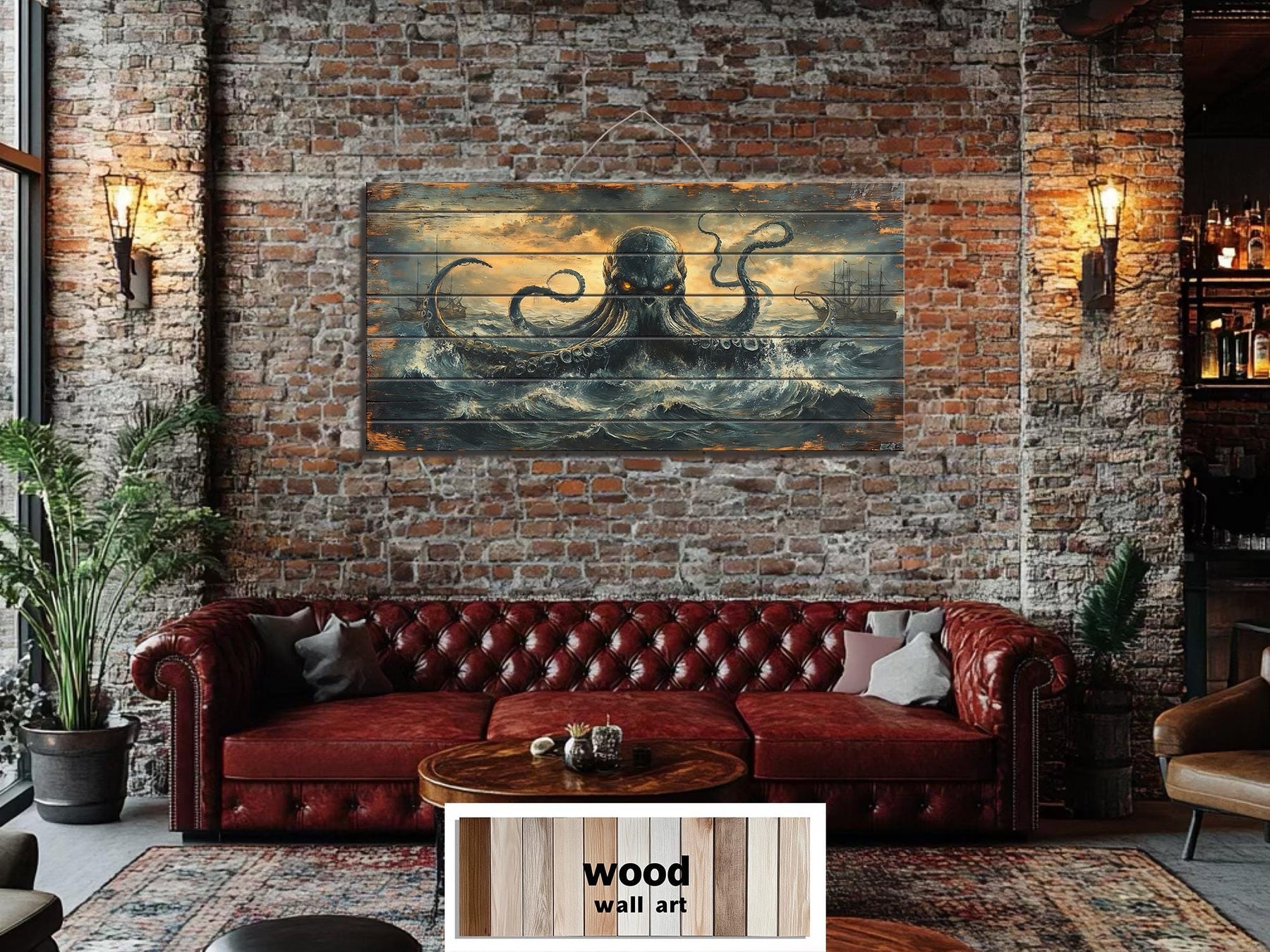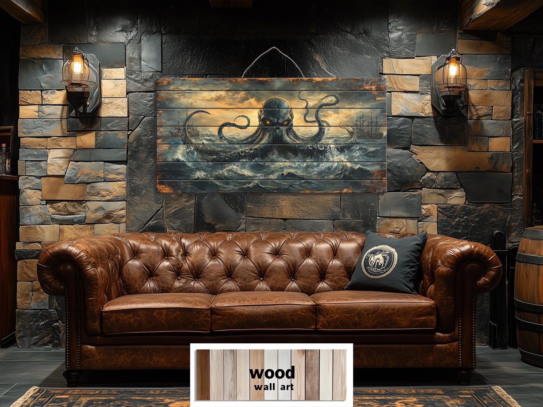 Our Kraken In Ocean artwork is ideal for masculine interior spaces such as man caves or rugged entertainment rooms where dramatic and adventurous themes feel at home. The ocean-beast subject matter fits perfectly in spaces decorated with nautical elements, dark woods, metals, or maritime collectibles. It also works incredibly well in cabins, lake houses, or coastal homes with a rustic or adventurous feel. Man caves with leather seating and darker color palettes benefit from the bold motion and cinematic drama of the piece. Its distressed painted look on new wooden planks adds texture that complements industrial, rustic, or Western-nautical design. Game rooms or basements with dim lighting can use the warm highlights in the artwork to build atmosphere. Offices or workspaces for ocean lovers or mythology fans gain a deep sense of personality when this artwork is displayed prominently. It adds energy and visual storytelling to rooms that rely on strong focal points. Spaces with stone, reclaimed-style finishes, or weathered décor will blend especially well with the distressed nautical look. The best match for this piece is a rugged man cave with nautical influence, ending with Kraken In Ocean wall art.