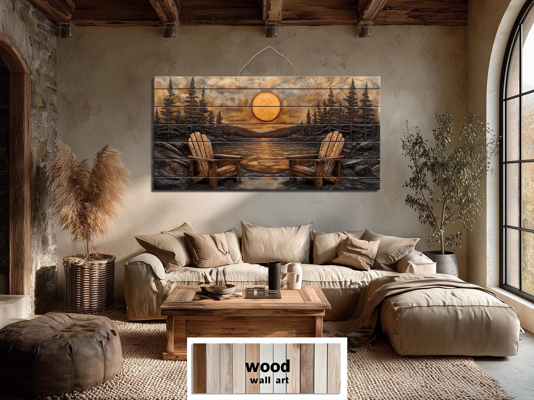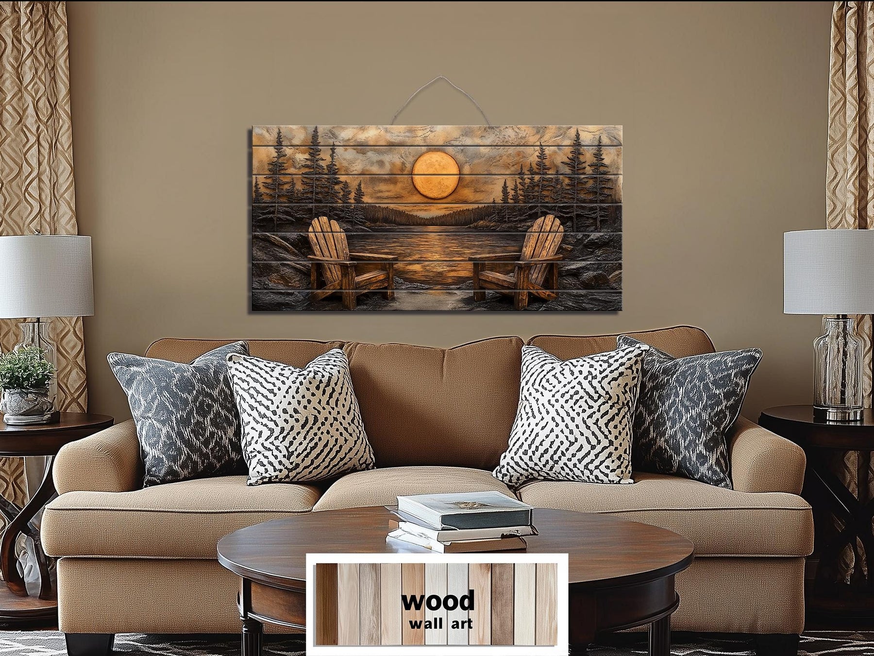 This Lake House wall decor is especially suited for cabin interiors and lakeside homes where natural landscapes and relaxed living define the personality of the space. In a rustic cabin living room with wood beams, stone fireplaces, and comfortable seating, the artwork becomes an immediate focal point that reflects the peaceful outdoor setting surrounding the home. The lake scene resonates strongly with people who enjoy fishing cabins, woodland retreats, and quiet evenings beside the water. Placed above a sofa, fireplace mantel, or along a feature wall, the distressed wood wall art reinforces the relaxed environment of cabin life. The sunset landscape pairs beautifully with interiors that use reclaimed wood furniture, plaid blankets, lantern lighting, and natural textures. The Adirondack chairs in the scene echo the same outdoor furniture commonly found on lake docks and cabin porches, strengthening the connection between the artwork and the lifestyle it represents. Because the painting is printed on new wood with a distressed design, it fits naturally into rustic spaces while still looking clean and intentional. The warm sunset tones complement cabins decorated with earthy browns, warm neutrals, and woodland colors. Lake homes and forest lodges benefit especially from this imagery because it mirrors the peaceful views often found outside the windows. For anyone who enjoys quiet evenings beside the water, this Lake House distressed wood wall art completes the atmosphere of cabin inspired Lake House wall art.