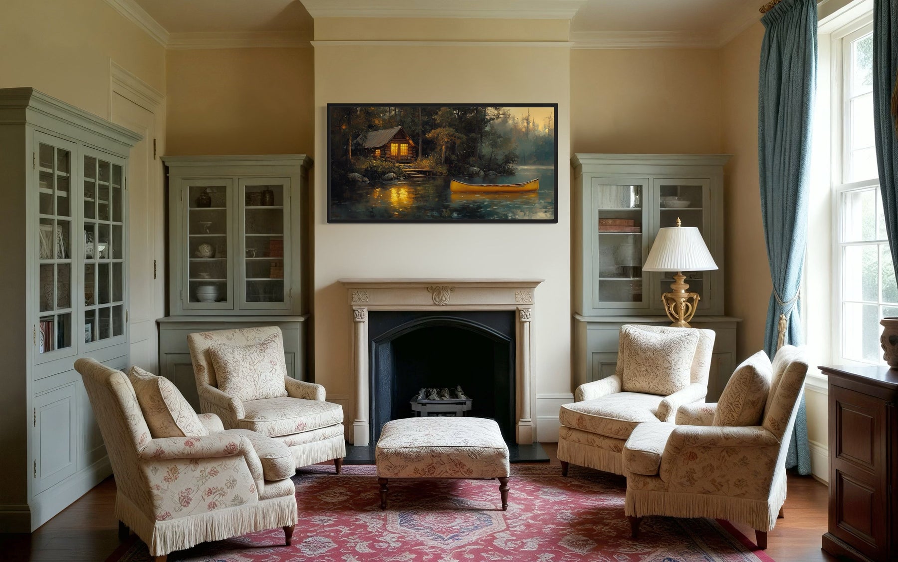 The color palette of this lake house with yellow canoe painting blends nature's finest hues, offering a soothing yet vibrant visual experience. Deep greens of the surrounding forest create a lush backdrop, complemented by the serene blue tones of the lake’s reflective surface. Warm golden sunlight filters through the trees, adding an ethereal glow that enhances the painting’s inviting atmosphere. The bold yellow of the canoe stands out vividly, injecting energy and balance into the otherwise tranquil scene. Soft earthy browns and tans of the lake house add grounding, rustic charm, while subtle shades of gray in the shadows provide depth and dimension. This palette celebrates the beauty of nature with a combination of earthy and vibrant tones. Whether viewed up close or from afar, the colors radiate a sense of harmony and peace. Let this lake house wall decor enrich your space with its naturally inspired color scheme.