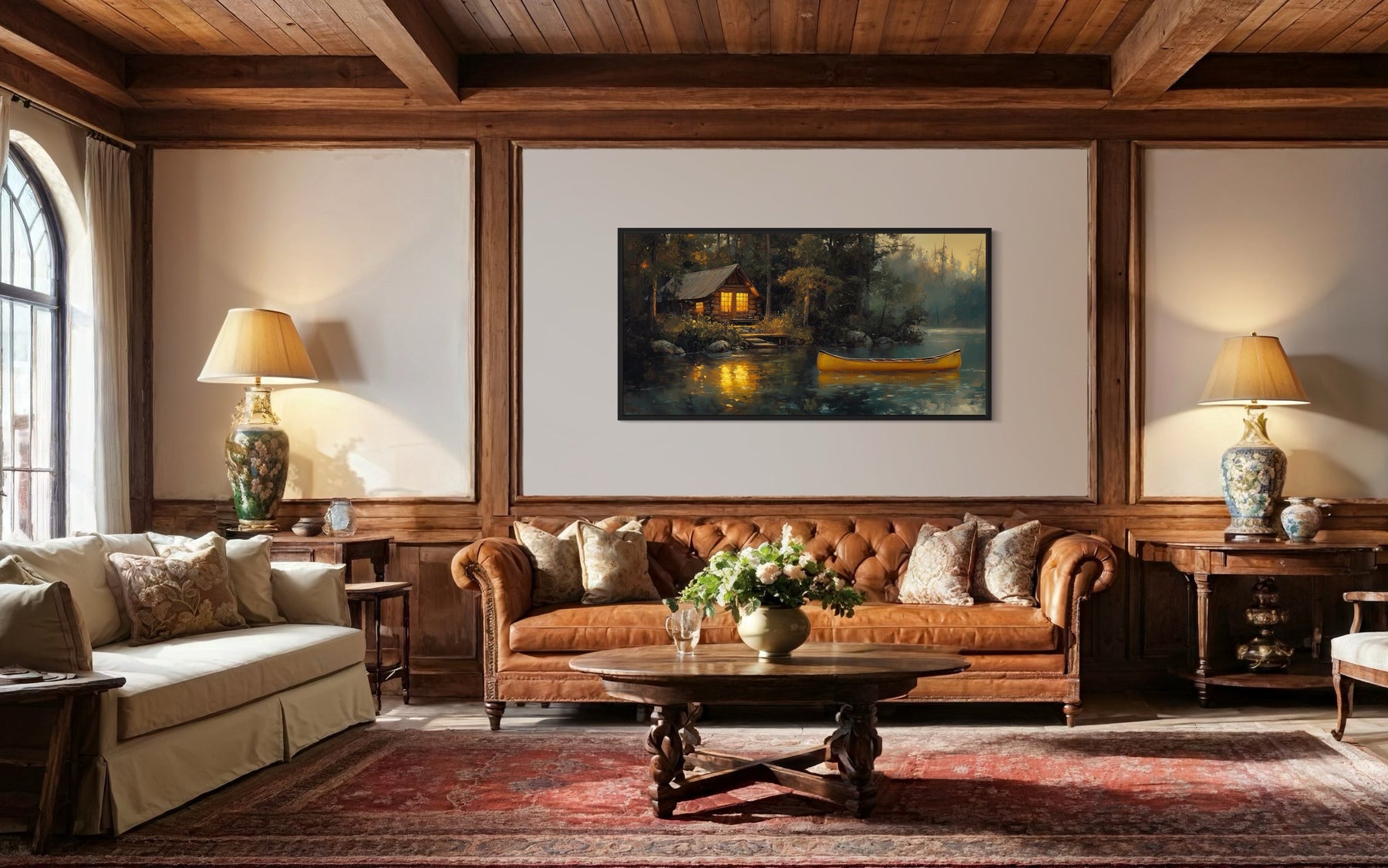 This lake house canvas print is an excellent addition to homes that embrace rustic, cabin, or lake house decor styles. Perfect for a living room with earthy tones or a dining area that connects with the beauty of the outdoors, it creates a peaceful focal point. It’s particularly suited for spaces designed as retreats, such as vacation homes or lakeside cabins, where its imagery evokes cherished summer memories. The framed design adds an elegant touch, ensuring it fits seamlessly into both traditional and modern rustic interiors. Ideal for nature lovers, this artwork brings the calming influence of a serene lakeside scene to your home. It also complements rooms with natural wood furnishings or soft, neutral palettes, enhancing the overall coziness of the space. Whether displayed above a fireplace or as a centerpiece in a reading nook, this lake house with yellow canoe wall decor transforms your space into a haven of tranquility.