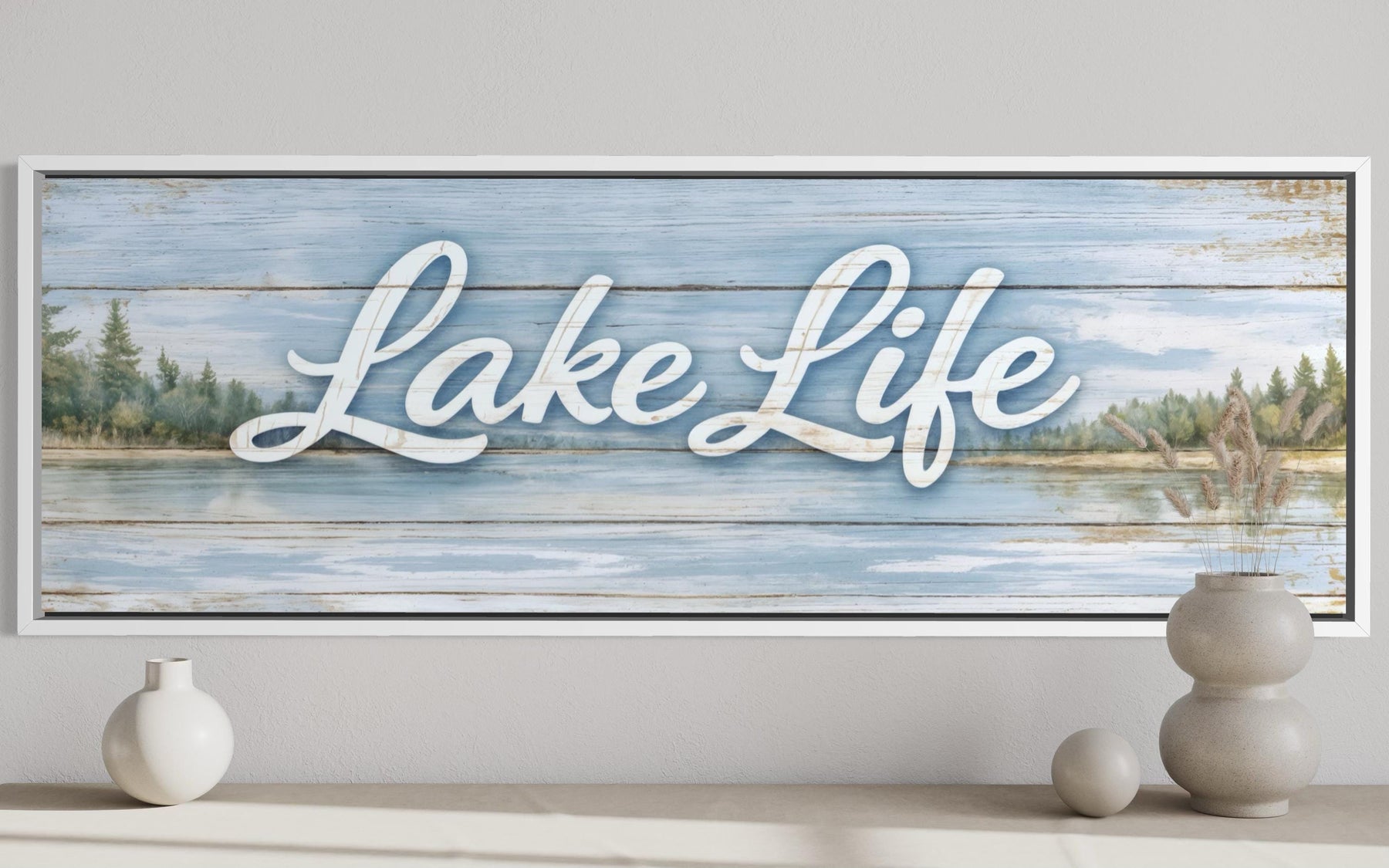 Our Lake Life canvas wall art was made for the lake house and the cabin — the kind of retreat home where the whole point is to slow down, breathe deeply, and remember what matters most. This piece belongs above the bed in a lake house master bedroom, where its wide panoramic format fills the wall with calm and its message sets the tone for every morning spent waking up to the sound of water. It is an equally natural fit for the lake house living room, displayed above a sofa dressed in soft blue and white cushions, where it anchors the entire space in the serene, watery aesthetic that lake house interiors do best. The rustic cabin home will find this piece a completely comfortable companion — its natural landscape background and warm script lettering speak the same language as shiplap walls, weathered wood, and the easy, unpretentious warmth of a space built for genuine rest. Lake lovers and water enthusiasts will feel an immediate and deeply personal connection to this piece — for anyone whose best memories are made beside a lake, this canvas is not just art but a daily reminder of the place and the feeling they love most. It also makes a wonderful and deeply personal gift for the lake house owner, the fishing enthusiast, or anyone who has built their life around the water and wants their home to reflect that fully. The light, airy palette means this piece also works in a primary home bedroom or living room designed around soft blues, warm whites, and a coastal or nature-inspired aesthetic that longs for the calm of open water. This is not art for the dark, dramatic, or urban interior — it belongs in a space that is light, open, and genuinely in love with the natural world. Our Lake Life painting is for the home that already knows that the best life is always the lake life.