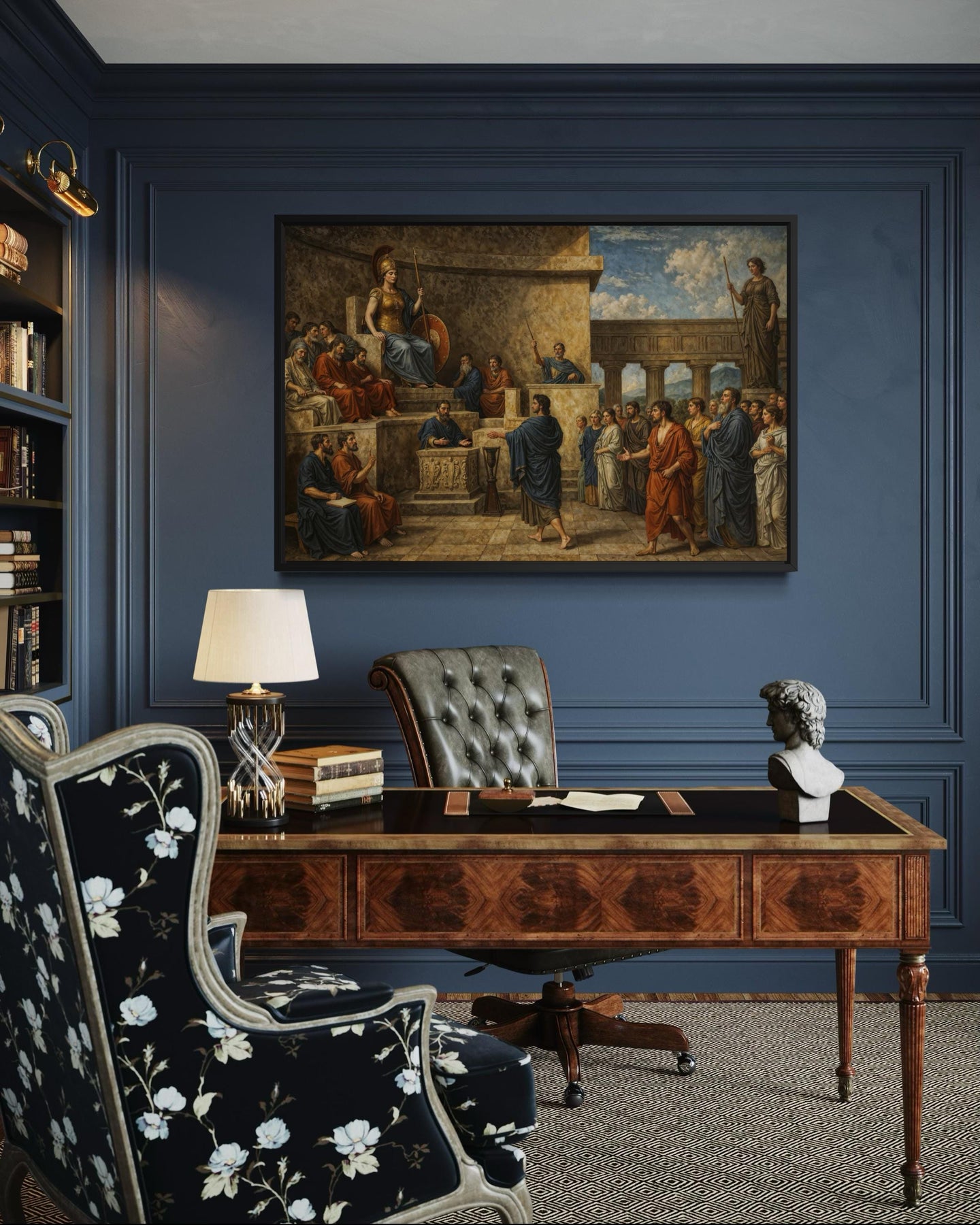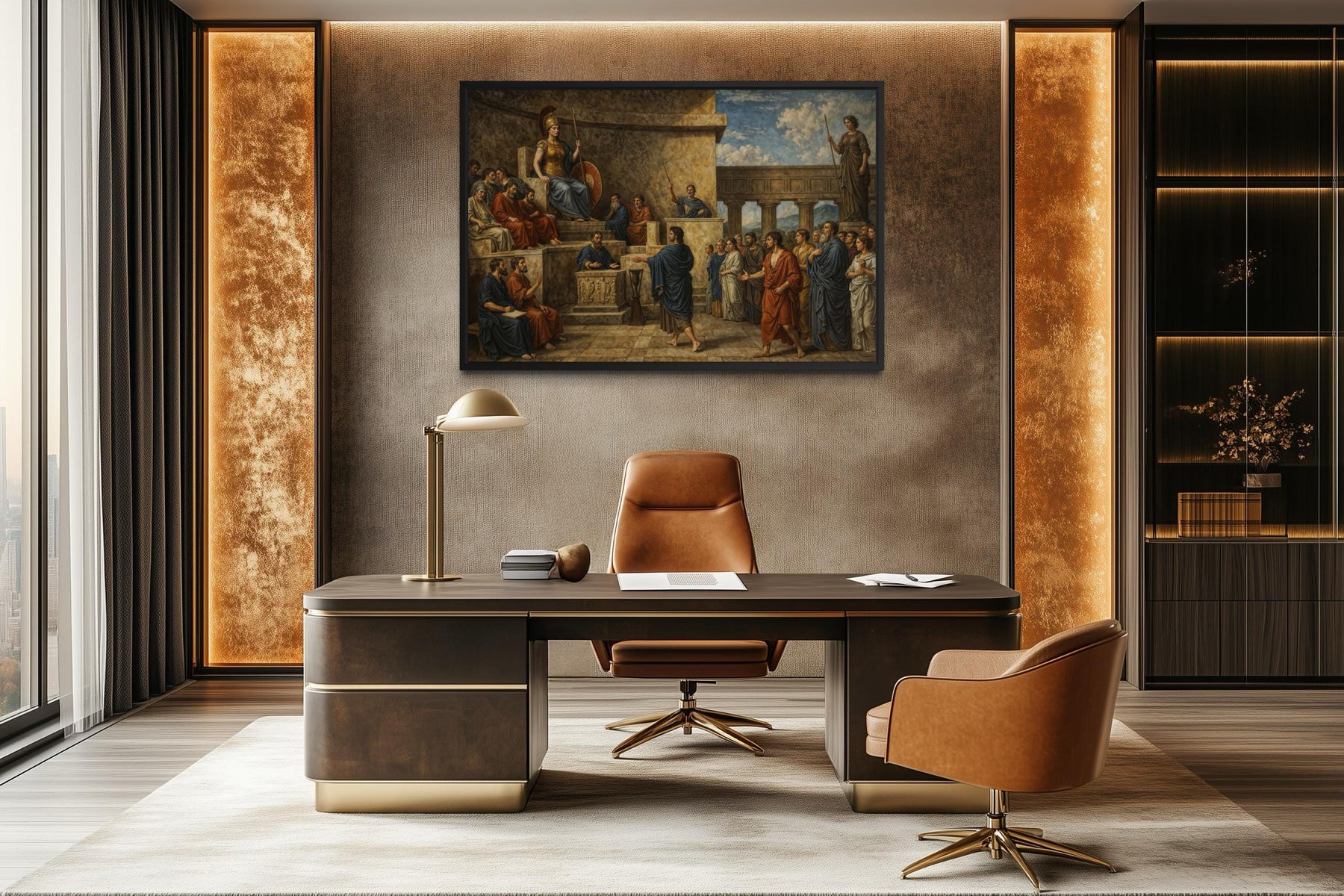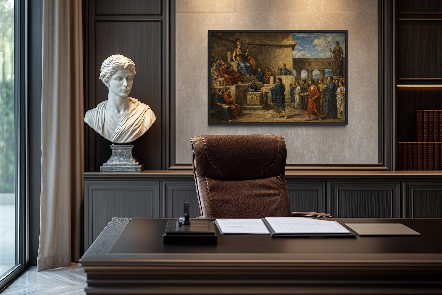 The tones used in this classical courtroom painting are rich, regal, and steeped in antiquity—perfect for environments that value tradition, academia, and storytelling. The overall palette is dominated by warm siennas, deep burgundy, ochre, charcoal gray, and burnished gold, creating an aged and serious atmosphere. Light highlights on the figures’ robes and faces contrast against the shadowy background to draw attention where the emotional focus lies—on Orestes, Apollo, and Athena. Earth tones in the architecture and furnishings further ground the painting, adding gravitas and structure to the emotional weight of the scene. Hints of muted teal, warm bronze, and deep navy appear subtly throughout the figures’ garments and accessories, enriching the palette without overwhelming it. These colors make it exceptionally compatible with leather furniture, wood-paneled offices, and rich-toned libraries or chambers. The golden undertones glow under warm light, while the darker shadows retain their depth in dim settings, making it highly adaptable to various lighting. Overall, the scheme conveys ancient authority and refined elegance, blending perfectly with interior spaces that lean toward intellectual or traditional design. Unlike modern prints with flat colors, this canvas offers visual layers and timeless tonal balance. The richness of this Greek justice canvas lies not only in the story it tells but in the depth of its palette.