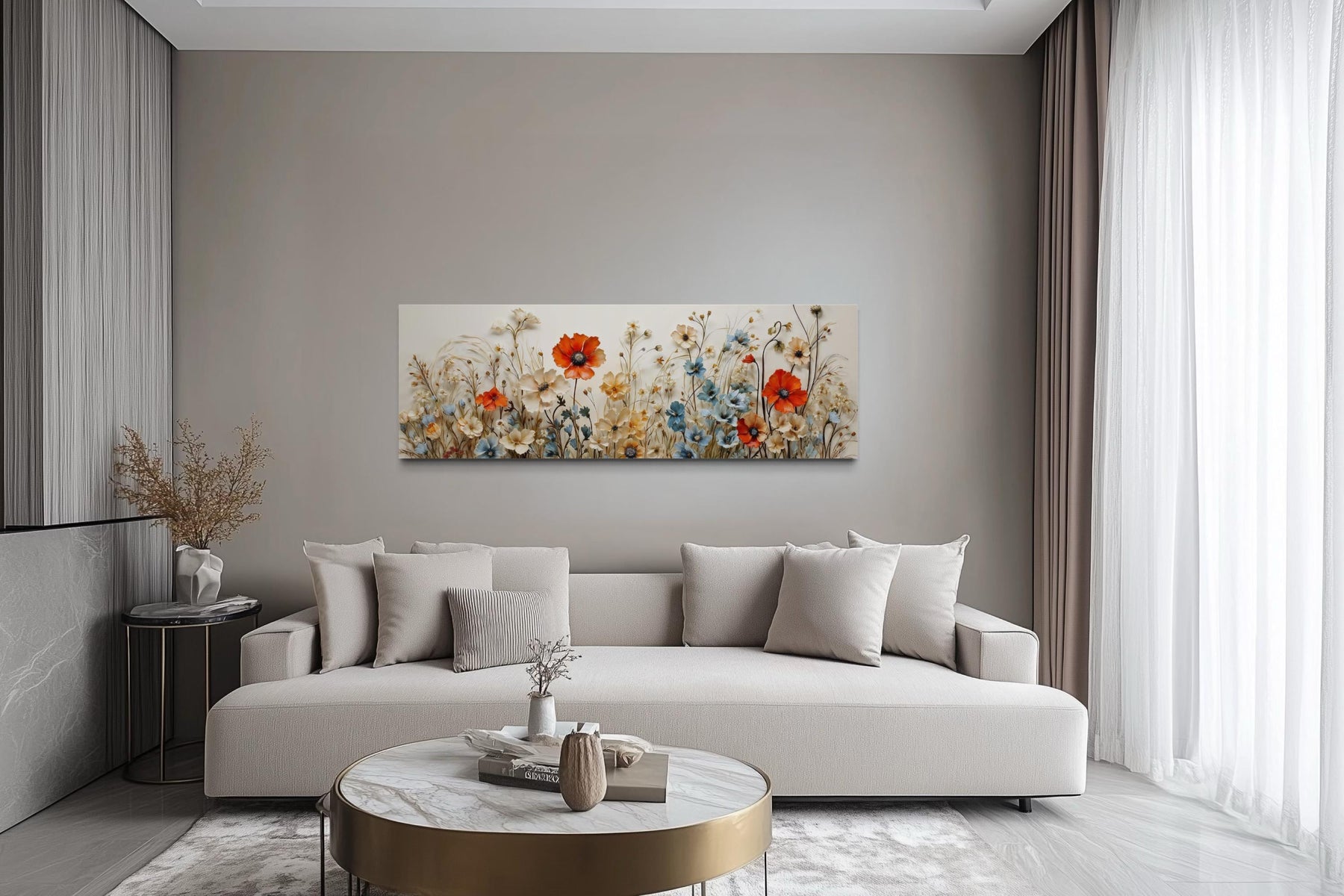This artwork fits beautifully in interiors designed with calm and inviting decorative themes. Bedrooms often benefit from floral imagery because botanical subjects bring softness and warmth into personal spaces meant for rest. Positioned above a bed, the wide composition naturally fills the wall while maintaining a light visual presence that does not overwhelm the room. Living rooms decorated with neutral furniture also benefit from floral artwork that introduces color without disrupting the surrounding palette. The garden theme works well in homes that incorporate natural materials such as wood, linen fabrics, and soft textured décor. Hallways or sitting areas can also display wide floral artwork to create a welcoming focal point along longer wall sections. Interior styles influenced by modern farmhouse or relaxed contemporary design frequently incorporate botanical imagery for its calming effect. Because the piece stretches horizontally, it works especially well on larger wall areas where balanced proportions are important. Many homeowners enjoy decorating with flower imagery because it introduces the feeling of nature inside the home. The finished piece enhances interior atmosphere through floral canvas wall art.