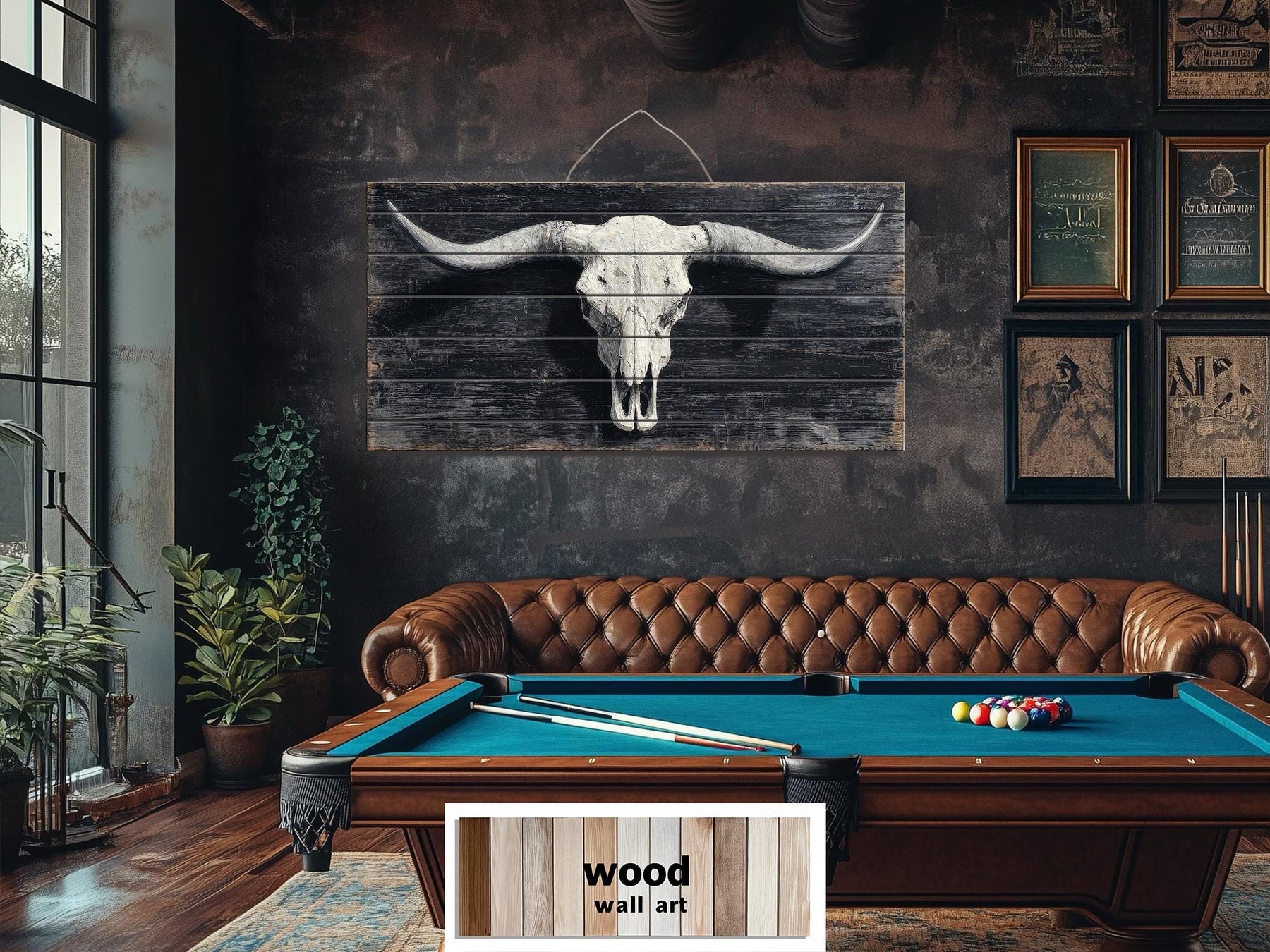 Our Longhorn Skull wood print was made for the rustic Western home and the farmhouse interior that takes its connection to American Western heritage seriously and decorates accordingly. This piece belongs above a fireplace in a living room with reclaimed wood beams, leather furniture, dark iron accents, and the warm, layered aesthetic of a space that has been built around genuine character rather than passing trend. The wide horizontal format fills a generous wall space with the full dramatic sweep of those longhorn horns, creating an instant focal point that anchors the entire room with authority and unmistakable personality. In a man cave or den built around the Western theme — leather seating, dark wood, cowhide accents, and the visual vocabulary of ranch life and the open range — this Longhorn Skull painting becomes the defining statement piece that gives the entire space its identity. Western art collectors and lovers of Southwestern and ranch-style decor will feel an immediate and deeply personal connection to this piece — the longhorn skull is one of the most iconic and most enduring symbols in the entire tradition of Western American art and culture. The real wood substrate adds a layer of authenticity that is especially meaningful in a home built around natural materials and genuine craft — this is not a reproduction of a Western artifact, it is a genuine artwork on a genuine piece of wood, and the combination of those two things gives it a presence and a weight that printed canvas simply cannot match. The distressed, vintage treatment of the artwork also makes it a natural companion to antique Western finds, vintage ranch objects, and the kind of curated, collected interior that tells a real story about real passions. Our Longhorn Skull wall art is for the home that knows exactly what it loves, knows exactly where it comes from, and has built its walls to honor both without apology.