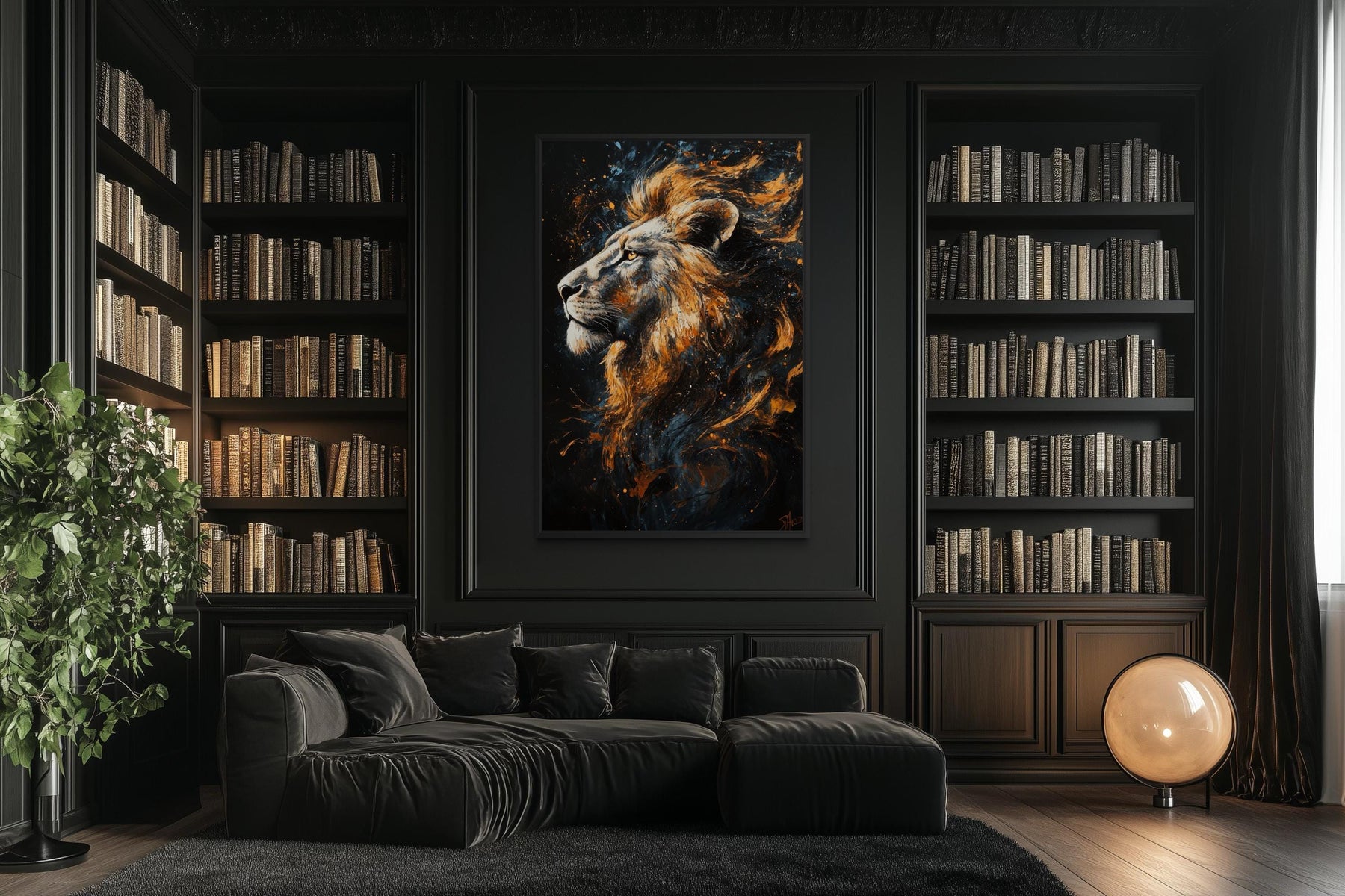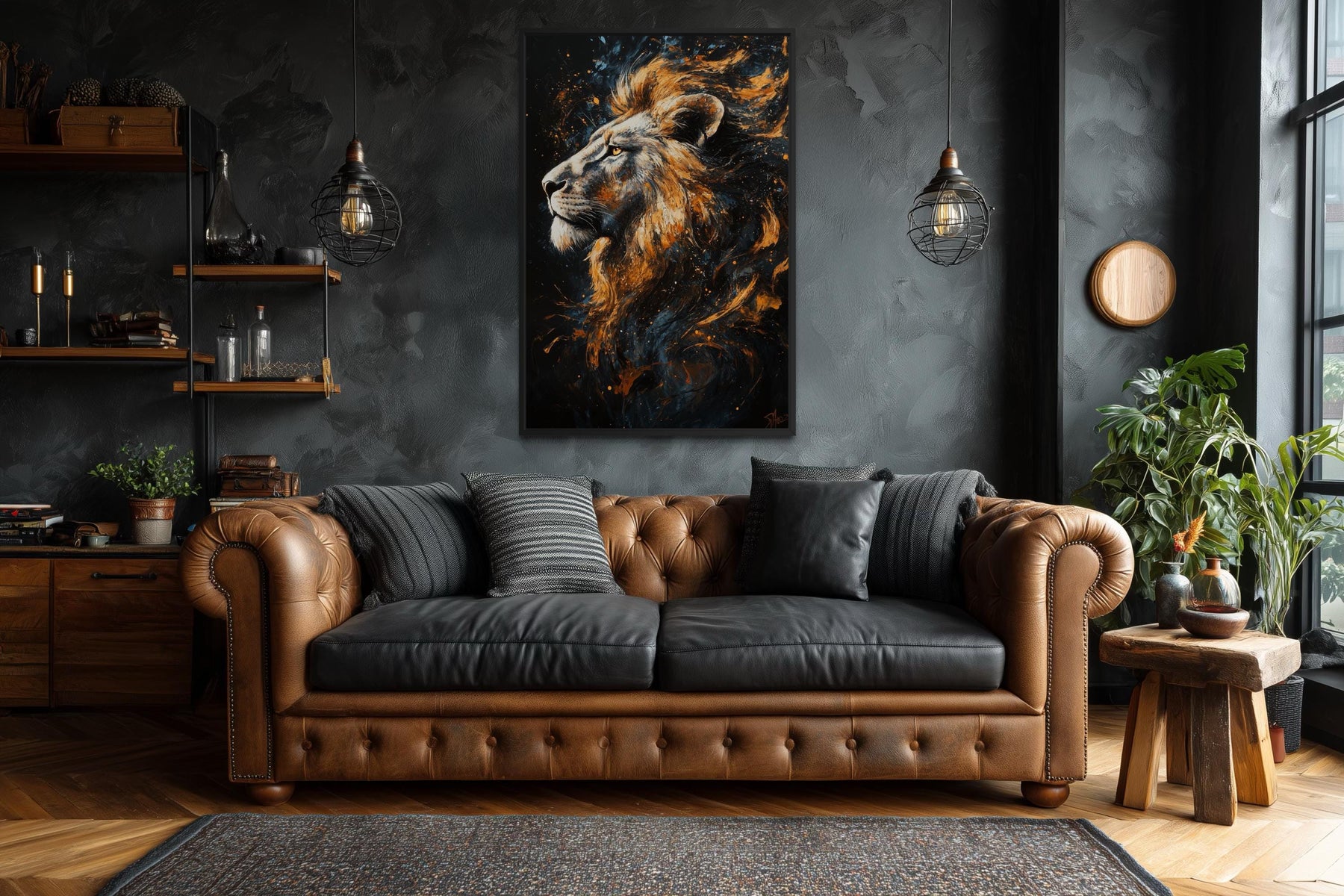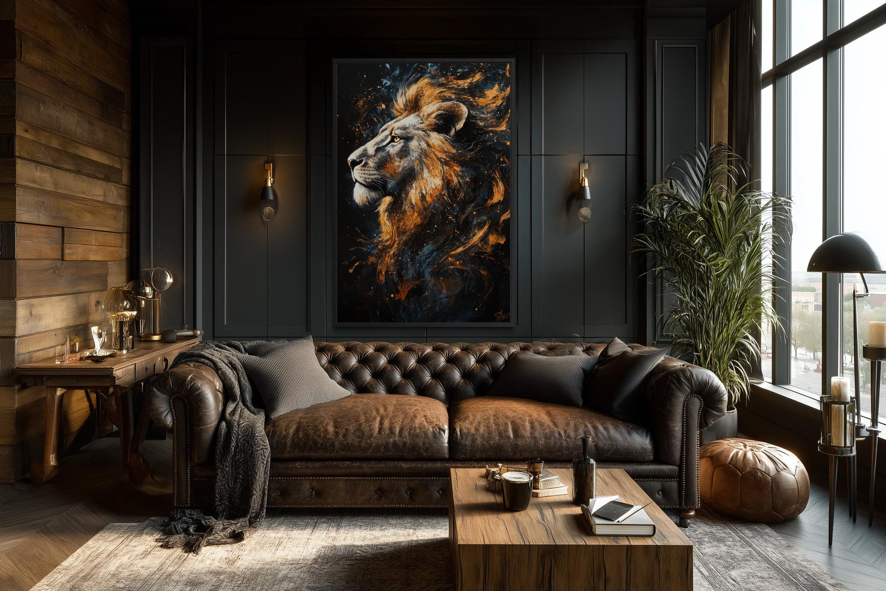 This Home Style is best suited for masculine living rooms and man cave interiors where bold imagery is meant to establish mood and identity. The commanding lion portrait naturally complements spaces with dark walls, leather seating, metal accents, and structured furniture layouts. In a masculine living room, the black and gold contrast adds depth and visual weight without requiring additional decorative elements. The artwork works especially well as a focal point above a sofa or feature wall, where it can anchor the room visually. In a man cave setting, the animal subject reinforces themes of power, confidence, and individuality. The vertical format adds presence without overwhelming the space. This piece is not intended for soft or neutral interiors, as its strength lies in its dramatic character. It pairs best with intentional lighting that highlights texture and contrast. The artwork defines the room rather than blending into it. This bold presence completes a strong interior statement as Majestic Lion wall decor.