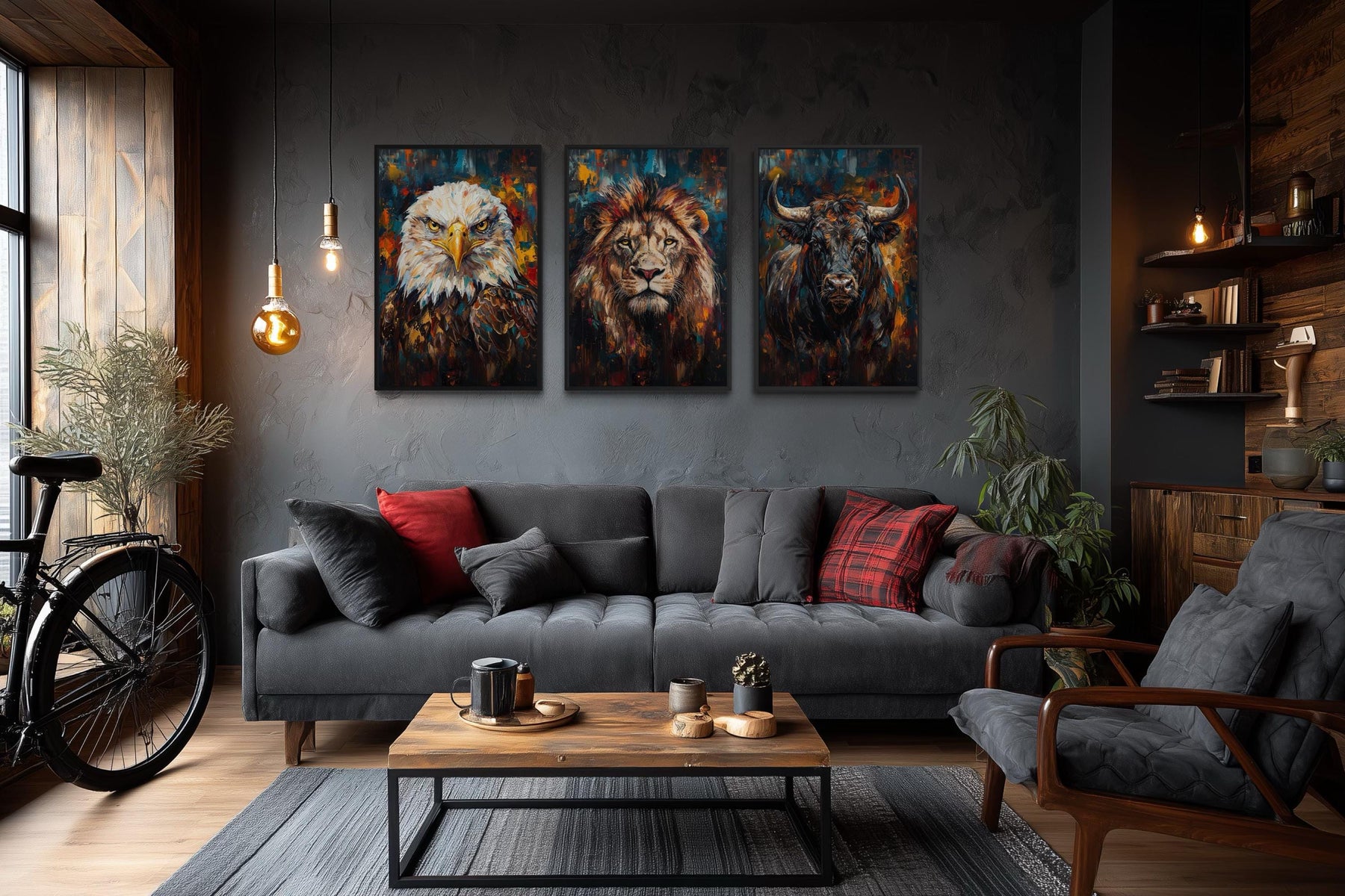 Man Cave Wall Art Set of 3 – Eagle, Lion, and Bull Canvas Prints