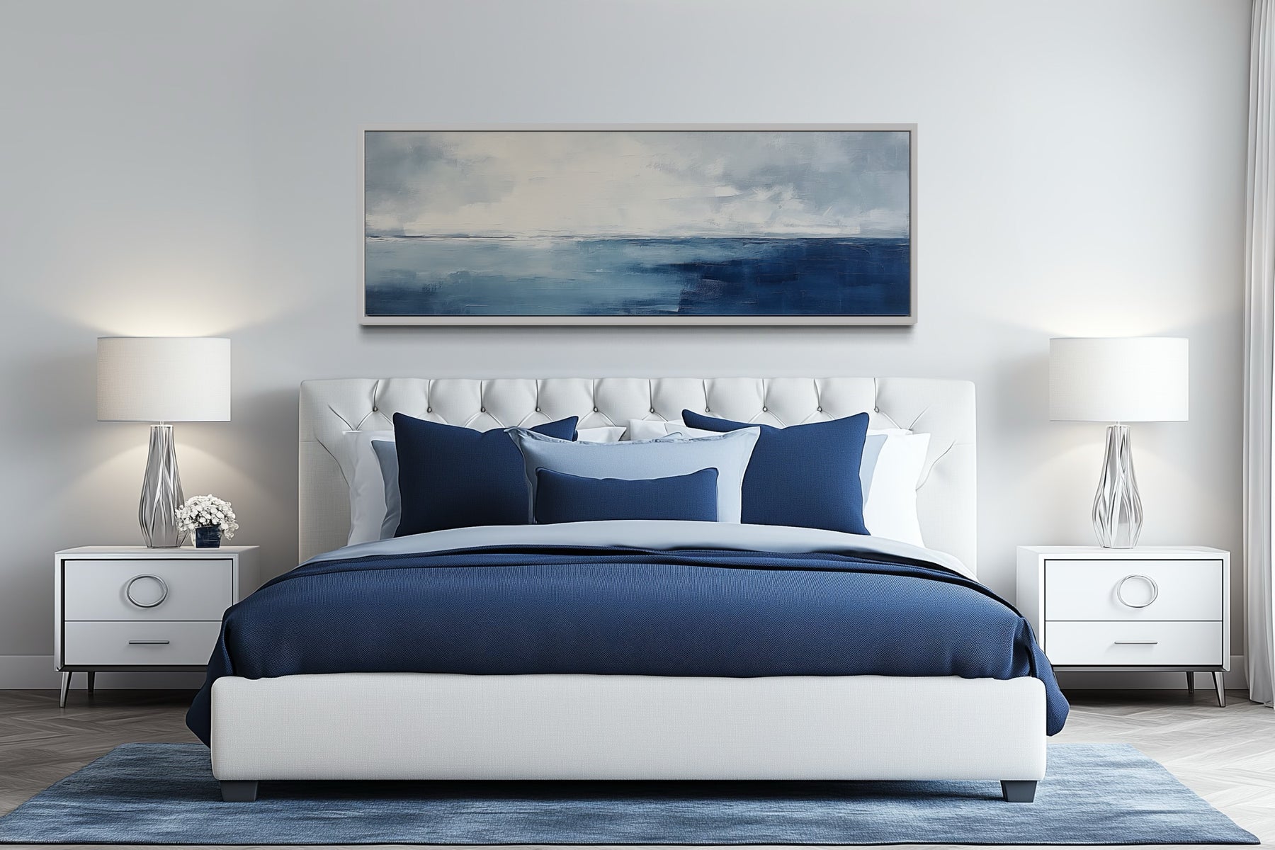 The color scheme of this minimalist ocean wall art features a refined blend of navy blues, soft grays, and gentle whites. These colors work together to evoke the peaceful and expansive nature of the sea. The deep navy blues capture the depth and mystery of the ocean, while the soft grays provide a calming balance. Gentle whites highlight the horizon and add a sense of light and space. This harmonious palette creates a tranquil and sophisticated atmosphere, making the artwork suitable for a wide range of interior styles. The minimalist approach ensures that the colors do not overwhelm but instead contribute to a serene and elegant ambiance.