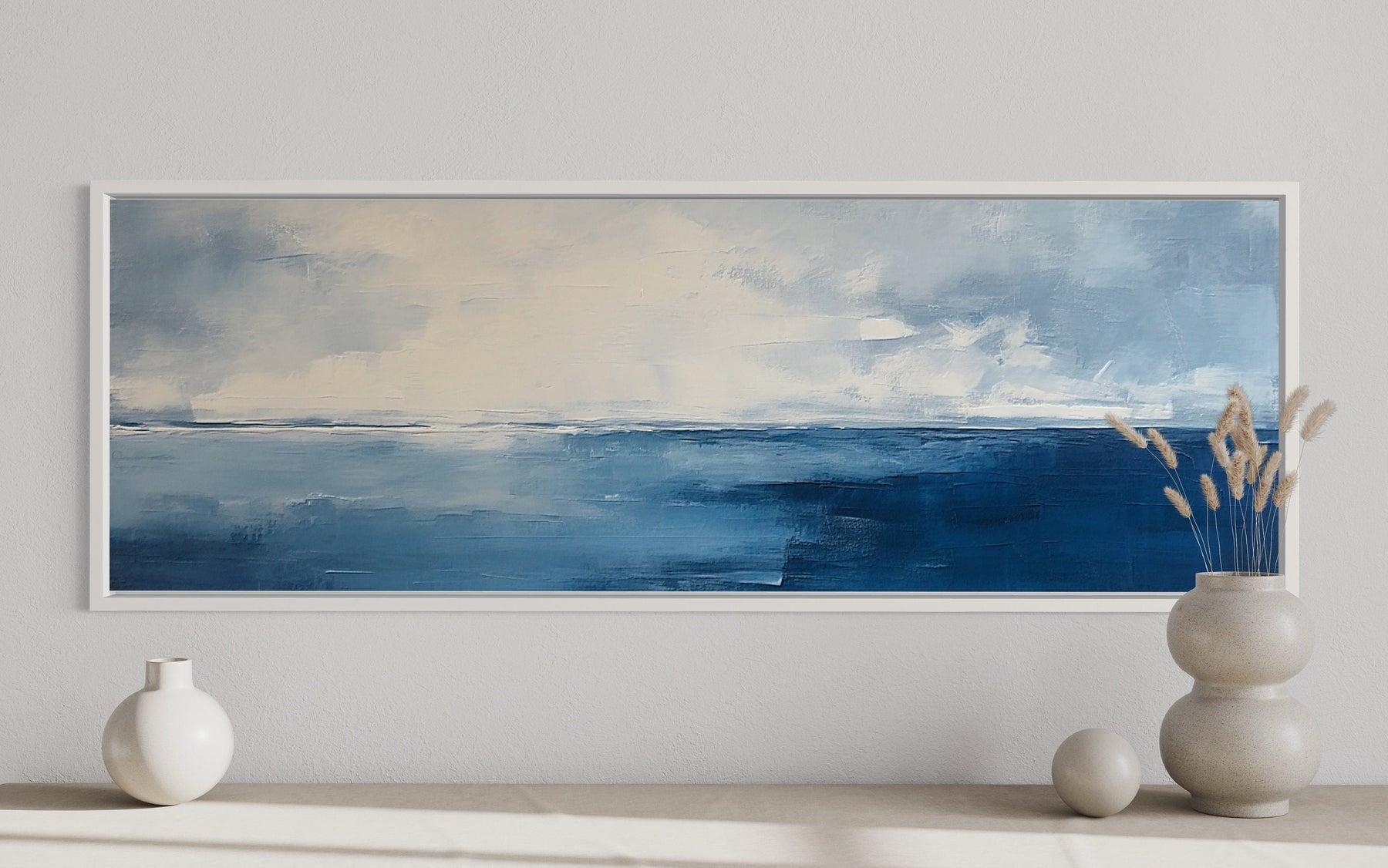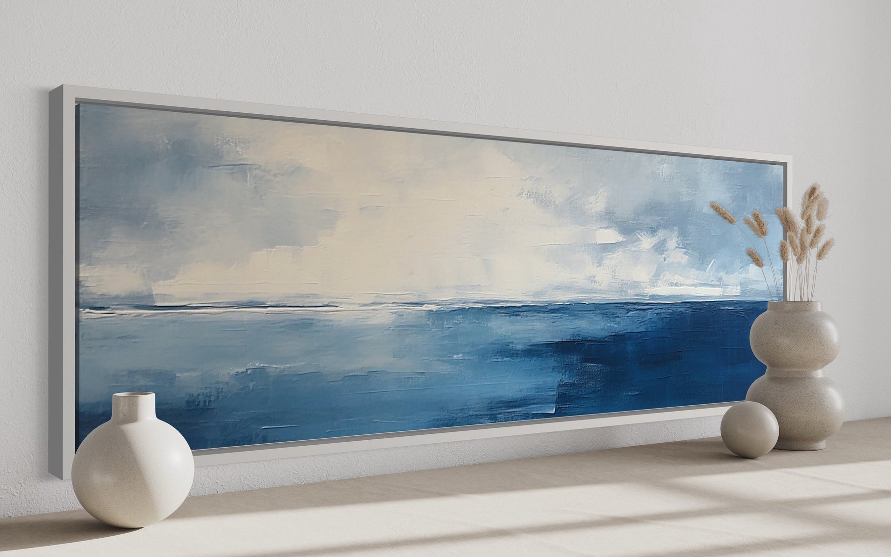 This minimalist ocean painting is perfect for coastal homes, modern apartments, and any space that seeks a touch of serene sophistication. Its clean, horizontal design makes it an ideal fit for above a bed, sofa, or mantelpiece, adding a calming focal point to the room. The minimalist style complements contemporary interiors, while the coastal theme makes it a natural choice for beach houses and nautical decor. The artwork’s versatility allows it to blend seamlessly with both rustic and modern elements, enhancing the overall aesthetic of the space. Whether you're looking to create a peaceful retreat in your bedroom or a stylish statement in your living room, this horizontal ocean wall art is an excellent choice for elevating your decor.