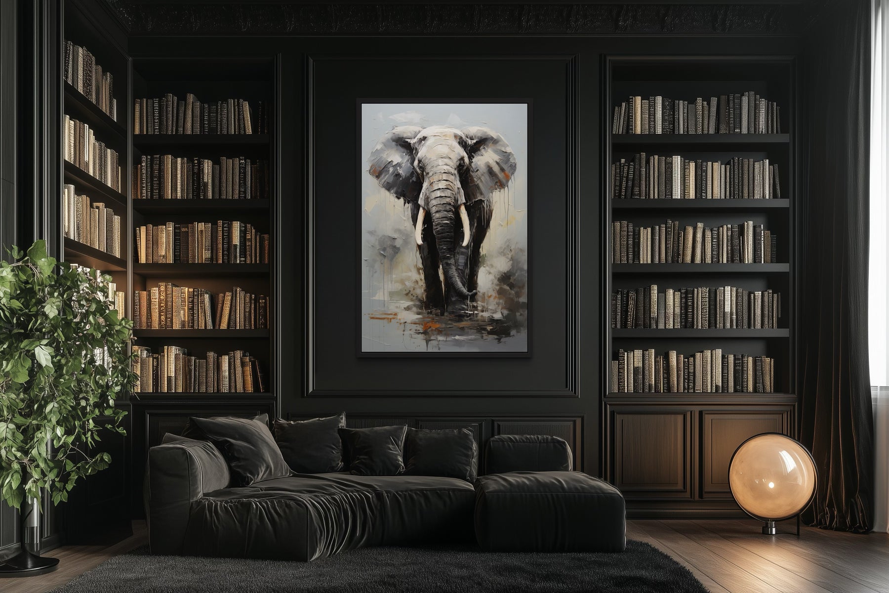 Our African elephant painting is the perfect statement piece for modern lofts, masculine offices, man caves, or industrial living rooms that call for visual strength and restraint. Its dark, dramatic tones pair well with concrete walls, dark wood, metal accents, or leather sofas—adding a touch of wildlife elegance to bold, architectural spaces. In home offices or workspaces, it lends quiet power to the room, making it a perfect fit behind a desk or beside a tall bookshelf. It also suits entryways that want to make a strong first impression or private rooms designed for thought and reflection. The vertical format makes it ideal for narrow wall spaces where height matters more than width. The portrait feels grounded and meditative, creating focus without distraction. In bachelor pads or refined minimalist homes, it complements clean design and adds emotional weight to neutral interiors. It’s not decorative fluff—it’s visual presence. Our elephant painting is a modern centerpiece for interiors that value focus, bold design, and the quiet strength of nature. Our elephant wall decor is made to anchor strong interiors with confidence and calm.