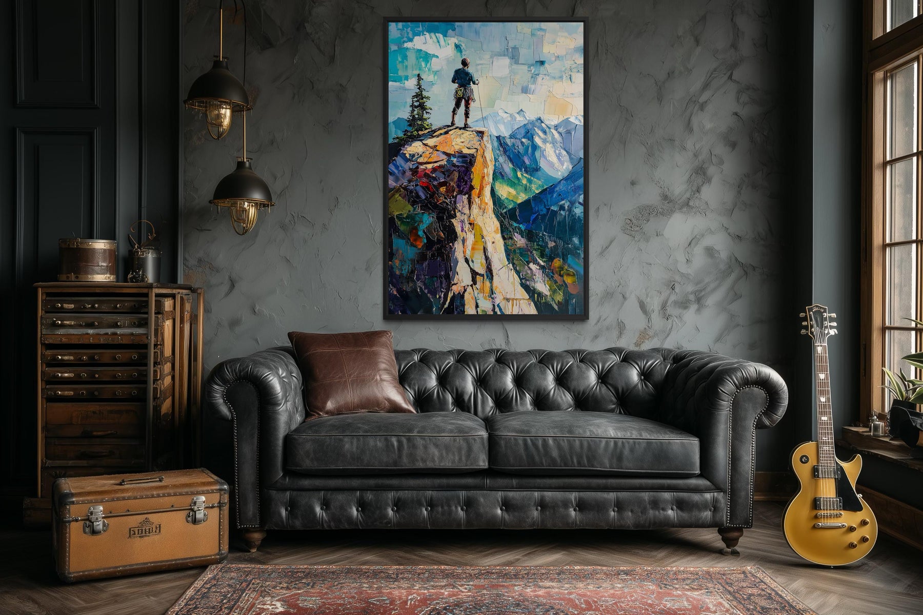 This vertical piece is ideal for homes and offices that value quiet confidence, modern masculinity, or nature-rooted decor with a strong personal story. Its tall, narrow shape makes it especially useful in spaces where horizontal artwork feels static—this layout adds height, movement, and momentum. Hang it beside a bookshelf, between windows, or as a standalone piece above a chair or entry bench to create a focused statement. In a study, it becomes a visual mantra—reminding viewers of perspective, grit, and the beauty of detachment. For cabins or mountain homes, it bridges fine art and adventure narrative, appealing to those who hike, climb, or seek clarity outdoors. The subject matter also works well in minimalist or industrial interiors that lean on earthy materials and grounded color schemes. Framed or unframed, it stands out in spaces with darker walls or modern design elements like metal, leather, and stone. The story it tells—of solitude, scale, and resilience—resonates with creatives, thinkers, and explorers alike. It’s the kind of piece that invites you to pause on your way through the room, if only for a second. Add power and atmosphere to your space with this unforgettable cliff landscape artwork.