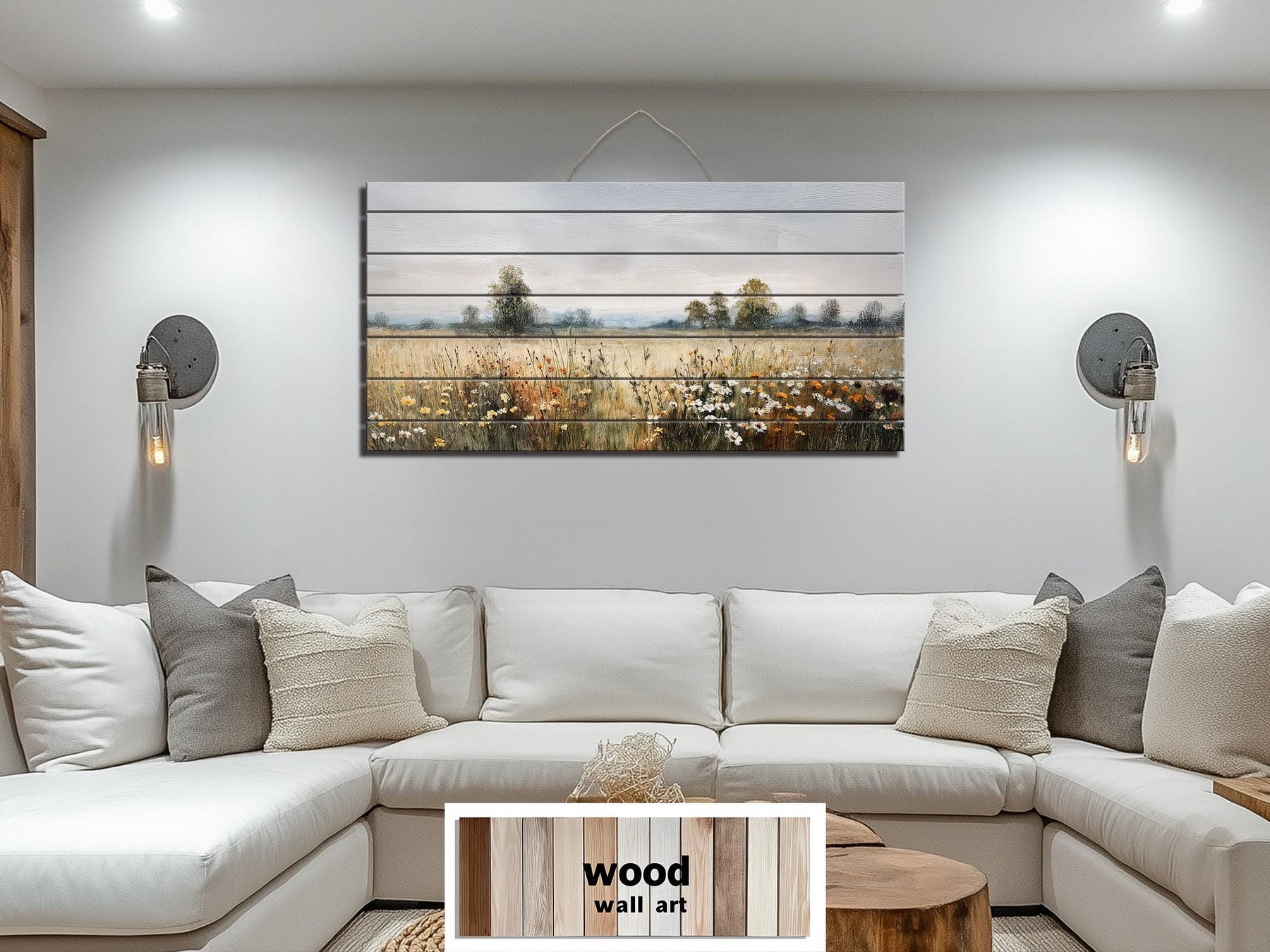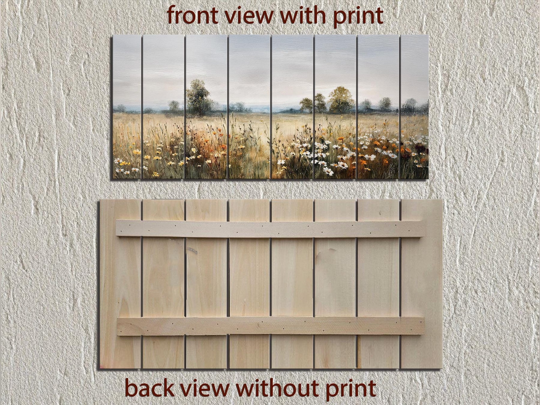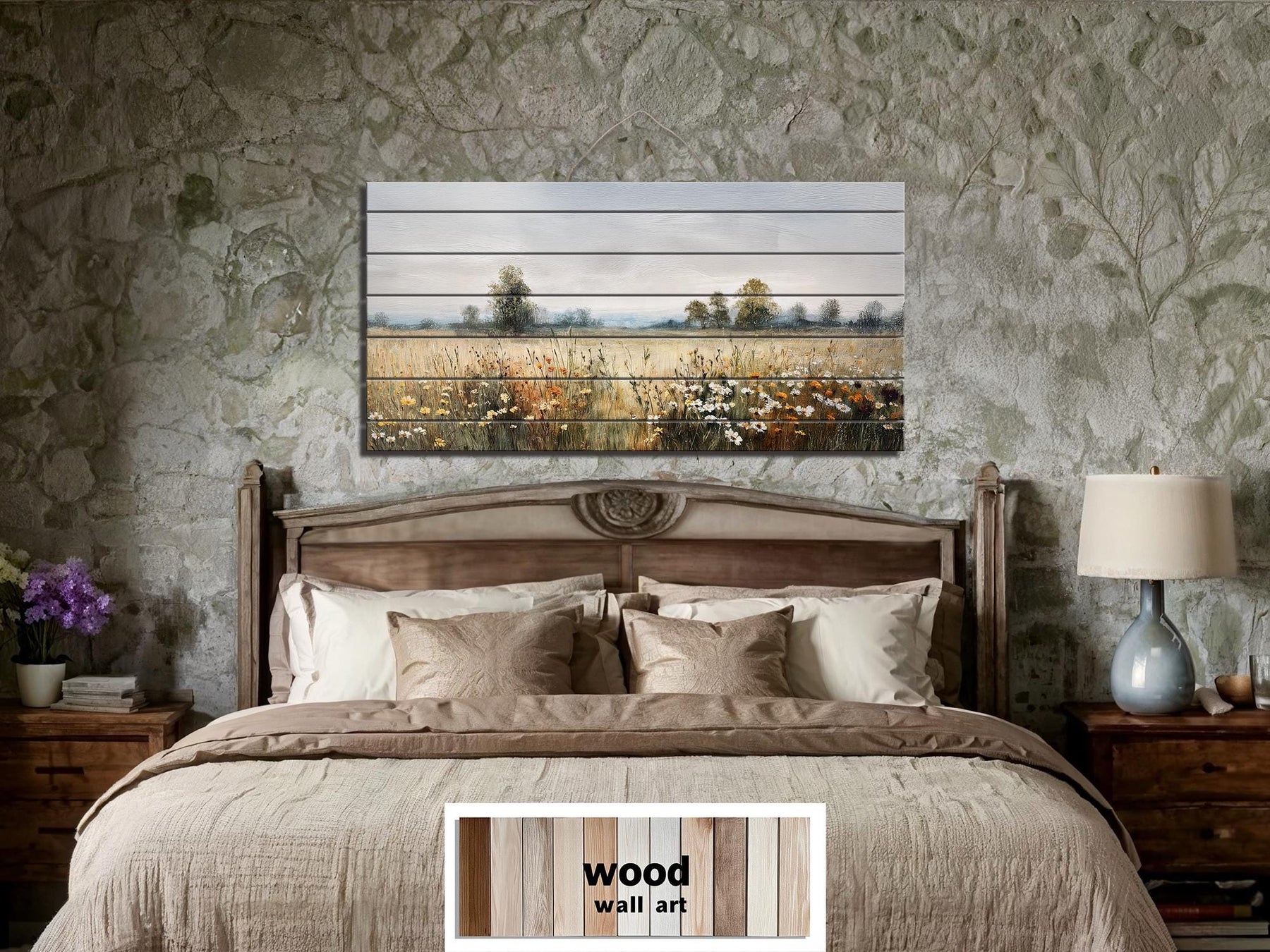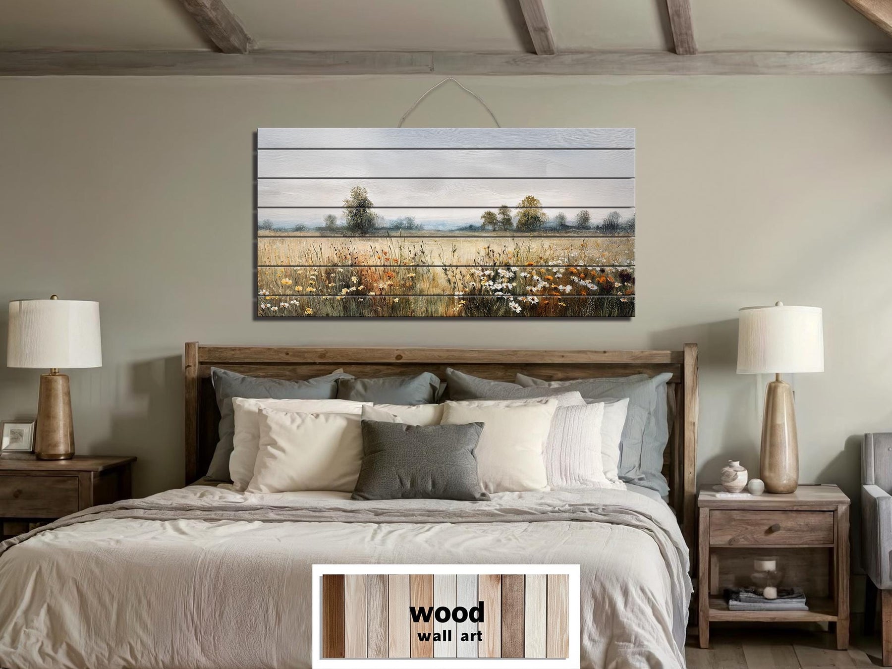 The Muted Rustic Wildflower Meadow Distressed Wood Wall Art is the perfect centerpiece for homes that embrace organic textures and understated charm. Its soft tones and weathered surface make it ideal for farmhouse, rustic, or modern country interiors, blending harmoniously with linen fabrics, reclaimed wood furniture, and earthy materials. In a bedroom, it adds a sense of tranquility when placed above the bed, reflecting calm mornings and open fields. In living rooms or dining areas, it serves as a serene focal point that softens the space with natural warmth. Its distressed finish and gentle imagery allow it to pair beautifully with both neutral and warm color schemes, making it a flexible addition to any decor. The horizontal format makes it particularly suited for wide wall spaces such as over sofas, mantels, or sideboards. Whether displayed in a cozy cottage, lakehouse, or open farmhouse setting, it evokes feelings of simplicity, authenticity, and comfort. The detailed printing on new wood ensures long-lasting quality while preserving the illusion of vintage character. The Muted Rustic Wildflower Meadow Distressed Wood Wall Art embodies the calm, timeless spirit of nature and the handcrafted soul of rustic artistry.