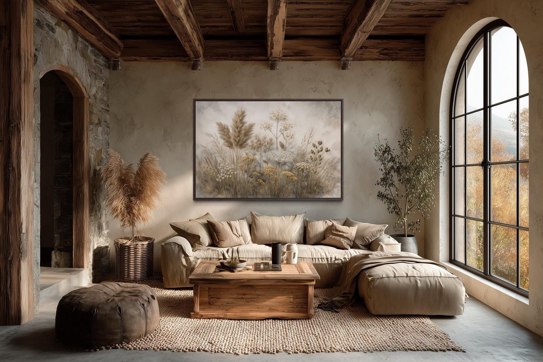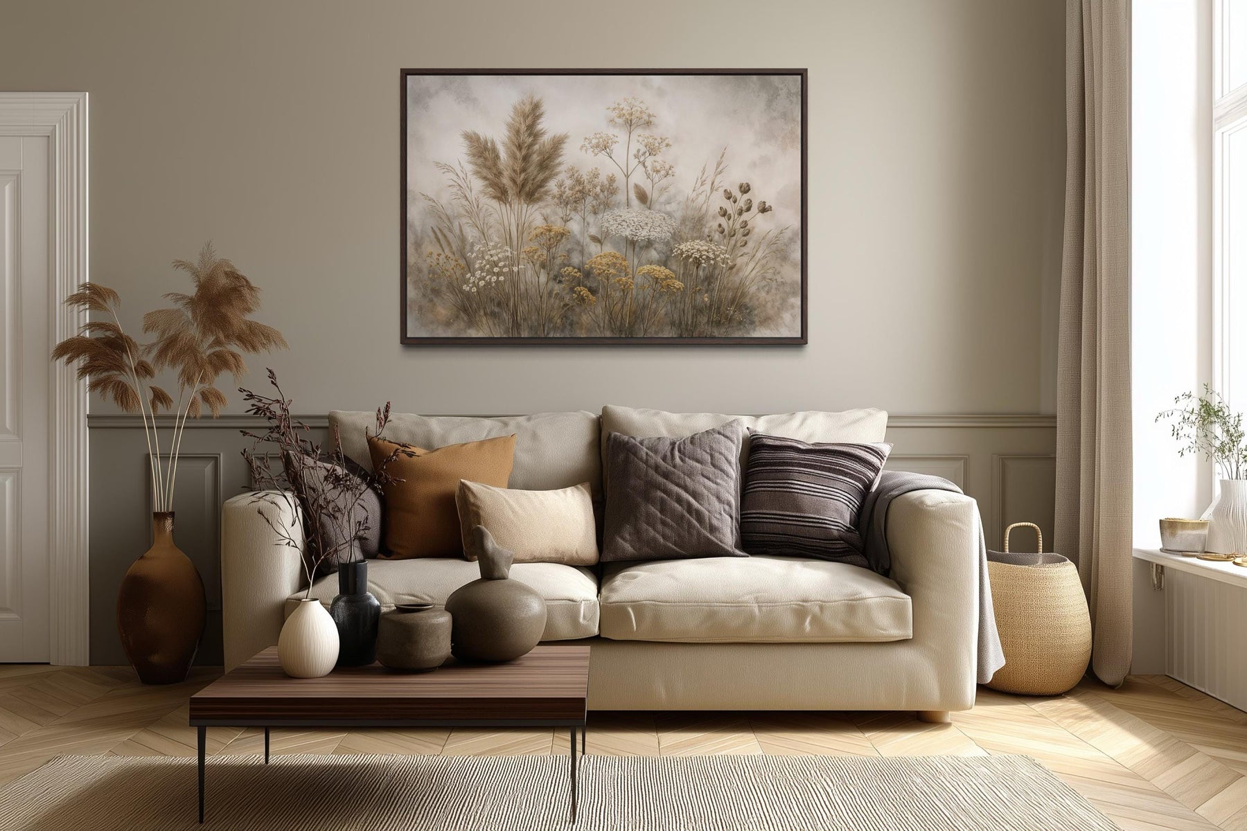 This canvas print is designed for homes that favor quiet earth tones, organic textures, and carefully curated minimalism with a natural twist. It fits beautifully into modern farmhouse spaces with soft woods, jute rugs, and ceramic accents, where it brings an airy focal point without demanding contrast. In boho interiors, it pairs seamlessly with macrame, pampas grass, and layered linens, echoing the natural fibers and dried florals common in that style. Its horizontal layout makes it perfect above a sofa, headboard, or entry console—places where it can stretch out and anchor the room gently. It also feels right at home in neutral bedrooms, home offices, or sunrooms styled with muted palettes and layered decor. Because the subject matter is wild yet controlled, it suits those who want their walls to evoke nature without becoming overly busy or literal. Even in more contemporary spaces with clean lines and minimal ornamentation, this artwork adds warmth and visual interest through texture alone. The neutral tone makes it an easy match with beige walls, clay paint finishes, or soft gray trim. It’s also perfect for transitional homes that mix rustic charm with more updated elements like boucle seating or abstract ceramics. This neutral wildflowers wall art is the finishing touch for interiors rooted in calm, comfort, and effortless style.