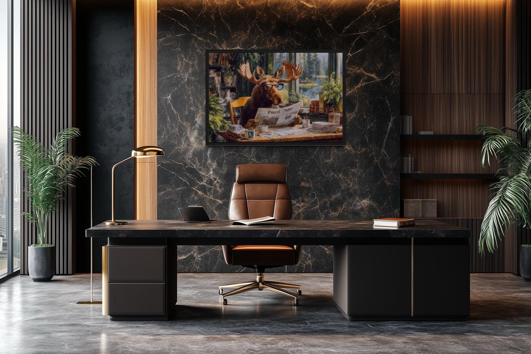 The color palette of this moose artwork is warm, refined, and full of character, reflecting both rustic coziness and modern polish. Rich browns and chestnut tones define the moose’s fur, accented by soft golden highlights that give his form depth and realism. The surrounding office scene incorporates muted shades of gray, tan, and ivory that create an inviting and balanced backdrop. Touches of green from the potted plant, the subtle orange glow from the lamp, and deep wood hues in the furniture bring the space to life. These earthy tones are harmonized with soft shadow and light gradients that mimic the quiet warmth of an afternoon office. The golden undertones add sophistication, while the cool neutrals keep the piece grounded and versatile. The palette feels natural yet artistic, lending a sense of realism without losing painterly charm. The careful play of light and color enhances the humor of the moose’s calm concentration as he reads Forest News, elevating it from novelty to fine art. The overall tone is tranquil, clever, and timeless — a composition that complements any decor, from modern lodge to urban office retreat.