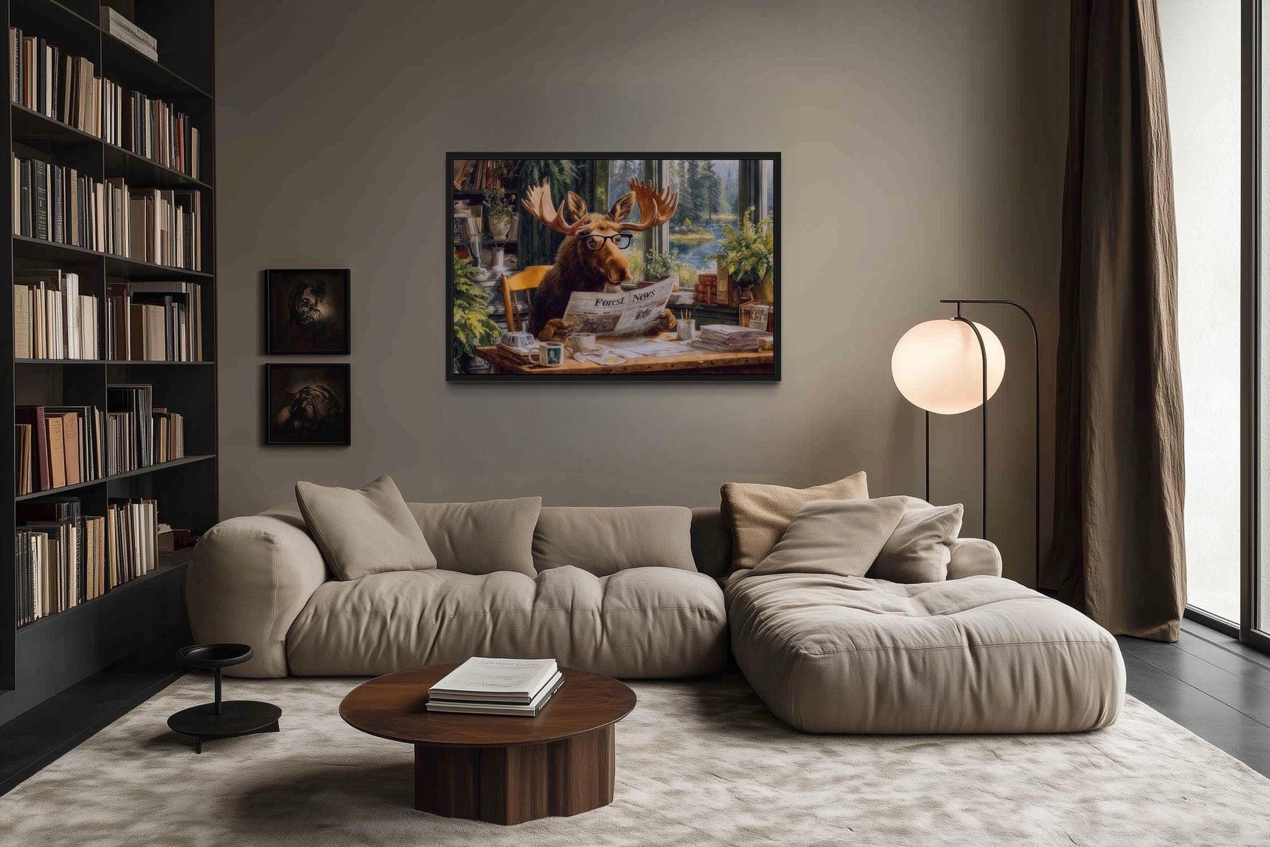 Our Office Moose Reading Newspaper wall art brings wit, sophistication, and rustic charm together in one brilliantly imaginative design. The artwork features a distinguished moose seated comfortably in an office-style setting, completely absorbed in reading his morning paper — humorously titled “Forest News.” The scene is crafted with meticulous detail: the moose sits upright like a professional at his desk, his antlers gracefully towering above him as he scans the latest woodland headlines. Around him, a warm and cozy office environment unfolds — shelves stacked with books, framed photos, and soft lamp light casting a golden glow across the room. The combination of human mannerisms and wild majesty gives the artwork its irresistible charm, striking a perfect balance between humor and elegance. Every brushstroke captures personality, from the glint in the moose’s thoughtful eye to the rich fur texture illuminated by natural light. Printed on premium canvas and beautifully framed, this piece turns everyday decor into a scene of clever storytelling. It’s a conversation starter, a smile-maker, and a stylish nod to the art of blending wilderness with refinement. Perfect for anyone who appreciates imaginative wildlife art, this framed canvas wall art brings a sense of humor and quiet intelligence to any space.