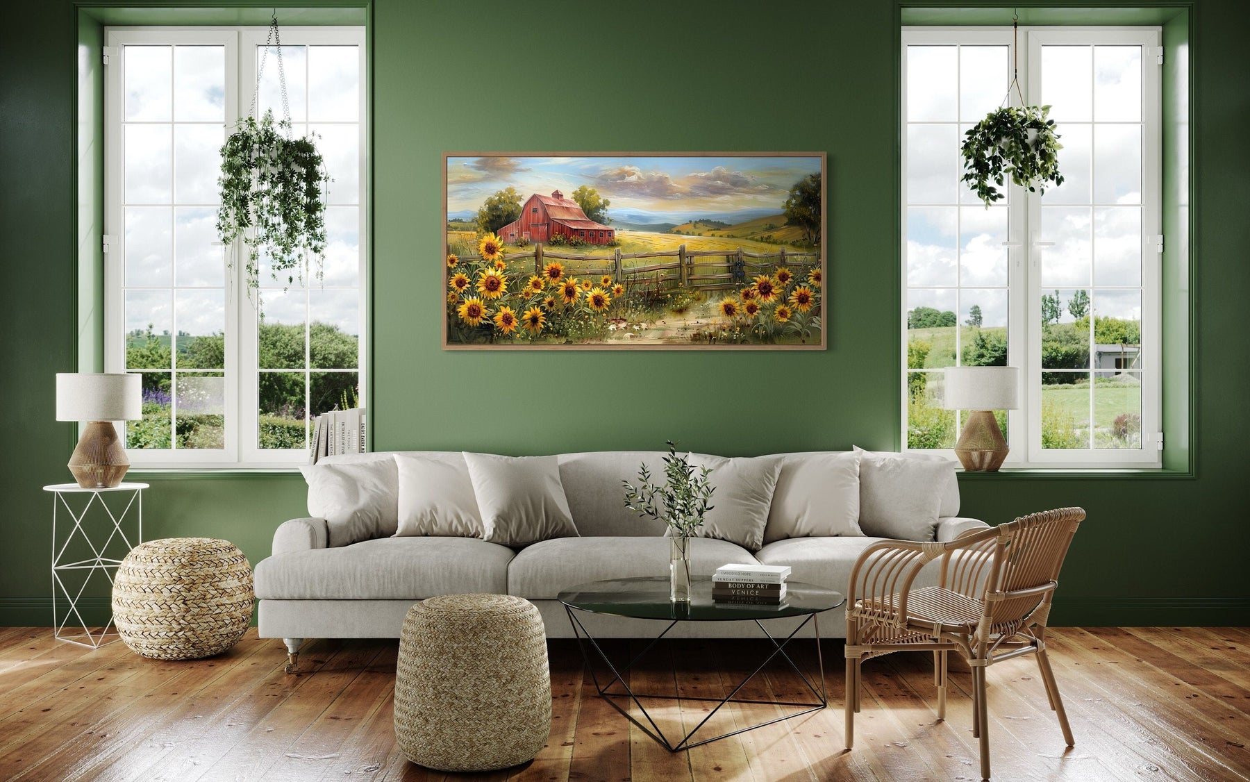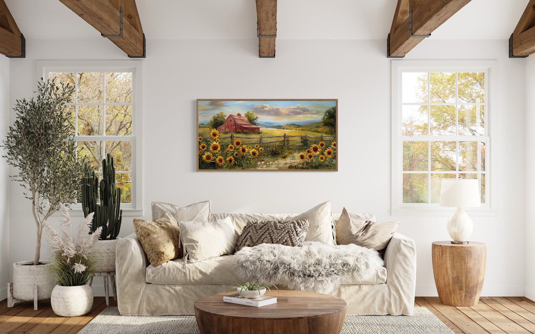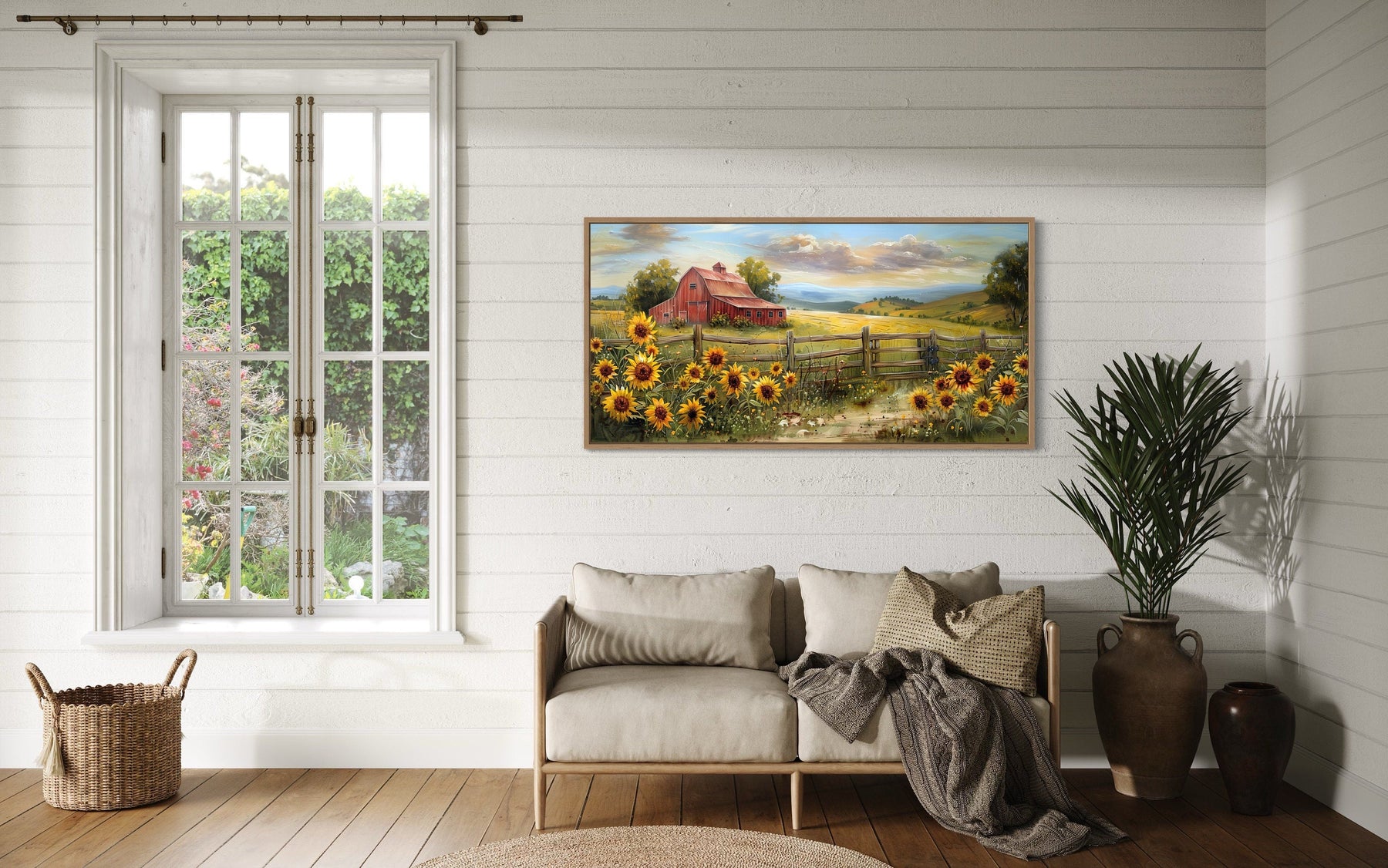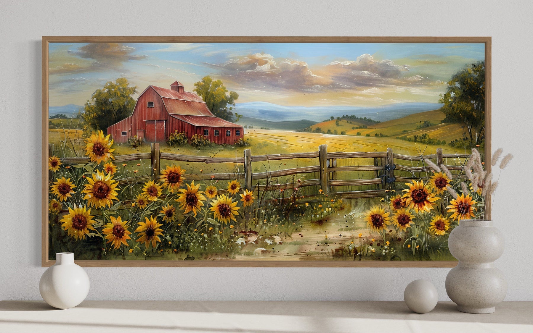 Ideal for a farmhouse-style home, the panoramic old red barn on the farm wall decor fits seamlessly into a rustic or country-inspired setting. Its charming depiction of rural life makes it a perfect choice for those who love nature and pastoral scenes. This artwork is also suitable for modern interiors, where it can add a touch of warmth and character. The long, horizontal format of the canvas print makes it an excellent option for displaying above a bed, where it can serve as a focal point in the bedroom. It also works well in living rooms, dining areas, and even entryways, providing a welcoming and cozy atmosphere. Animal lovers and those who appreciate vintage aesthetics will find this piece particularly appealing. Enhance your home's ambiance with the timeless beauty of the old red barn with sunflowers canvas print, a versatile and charming addition to any wall.