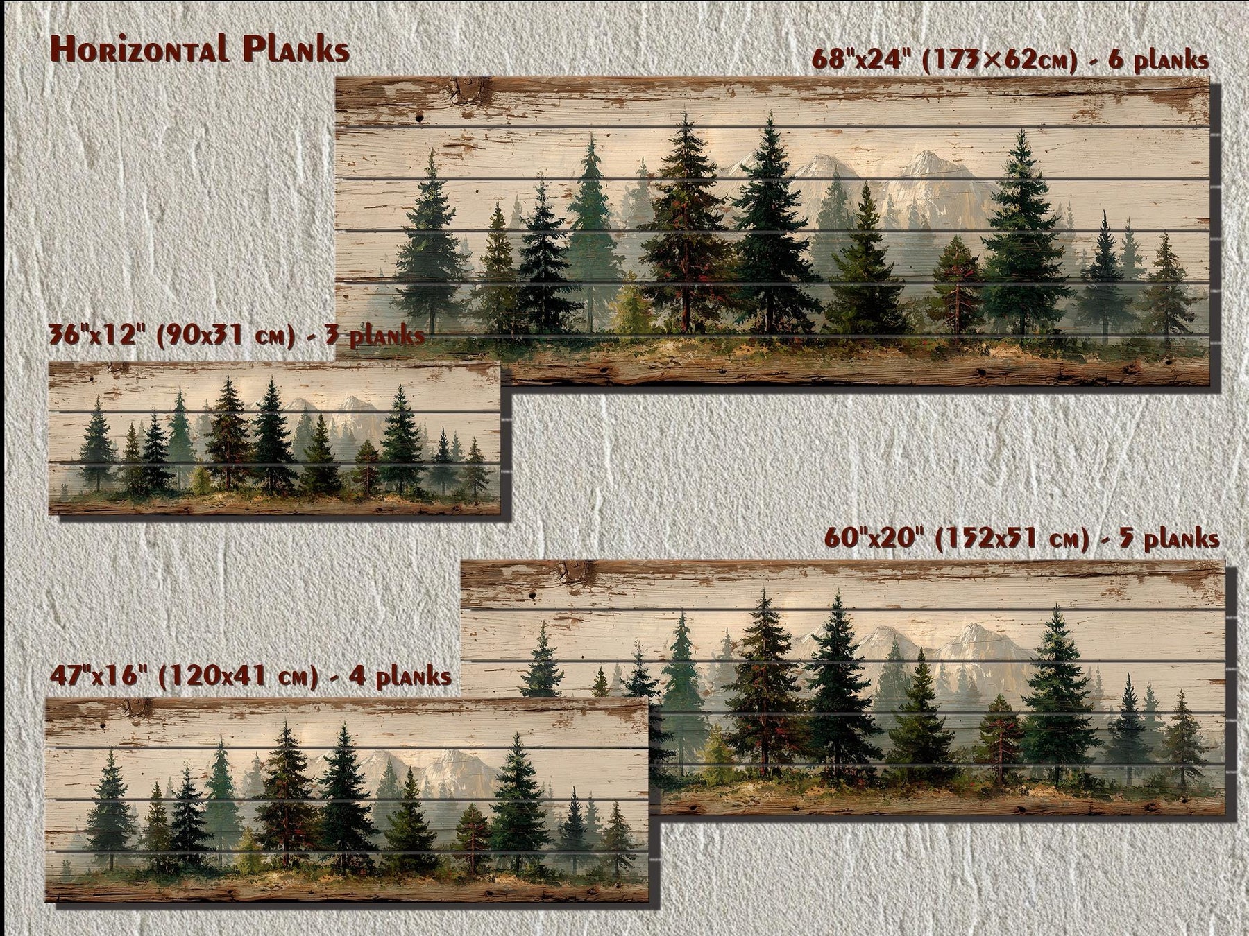 Rustic wood wall art featuring a pine forest mountain landscape in four horizontal plank sizes.