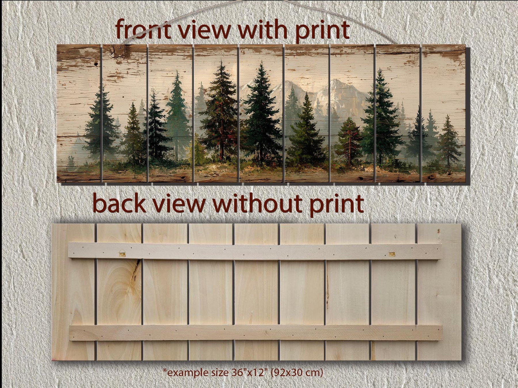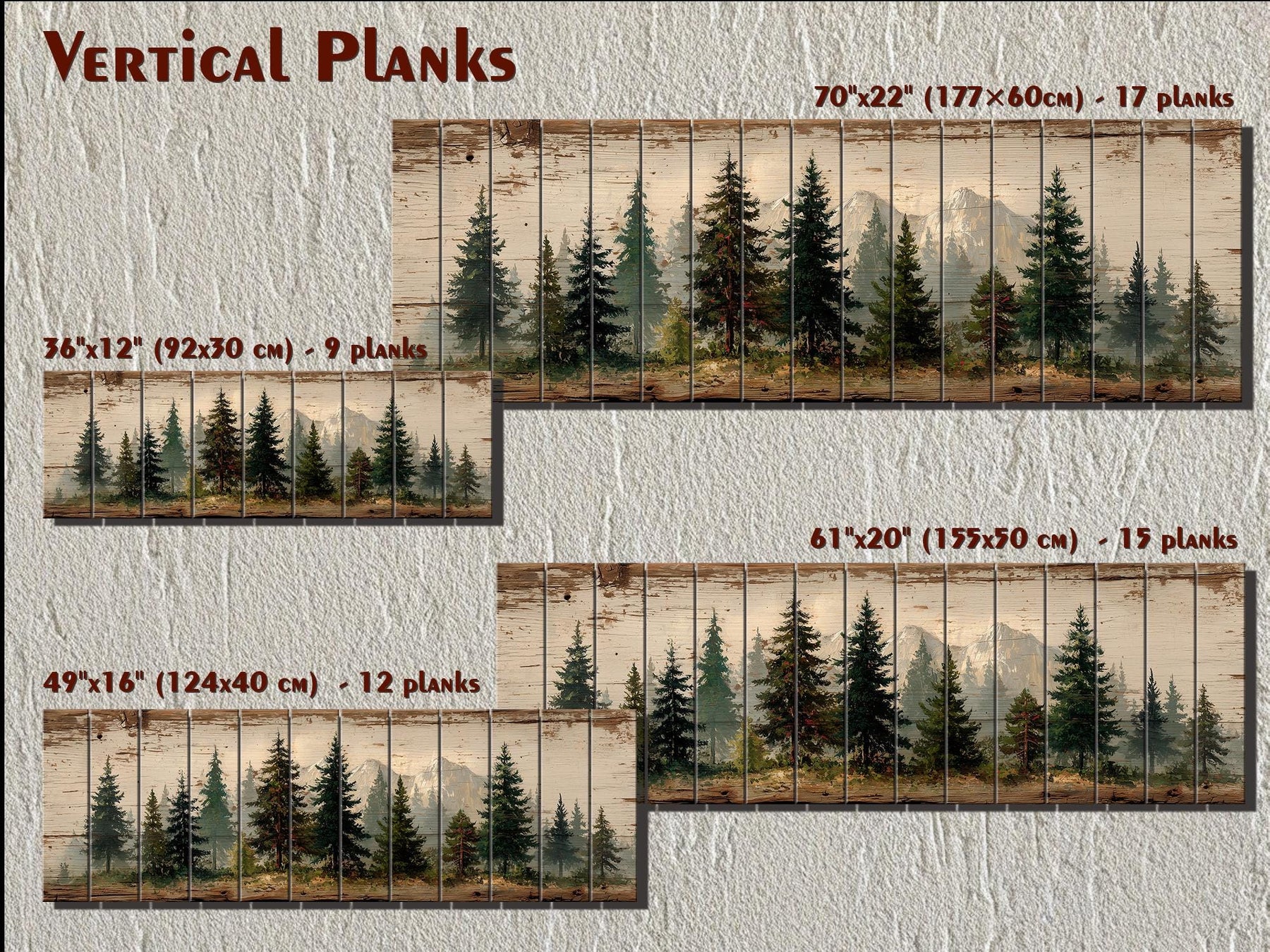 Rustic pine forest mountain landscape wall art printed on vertical wood planks in four sizes.