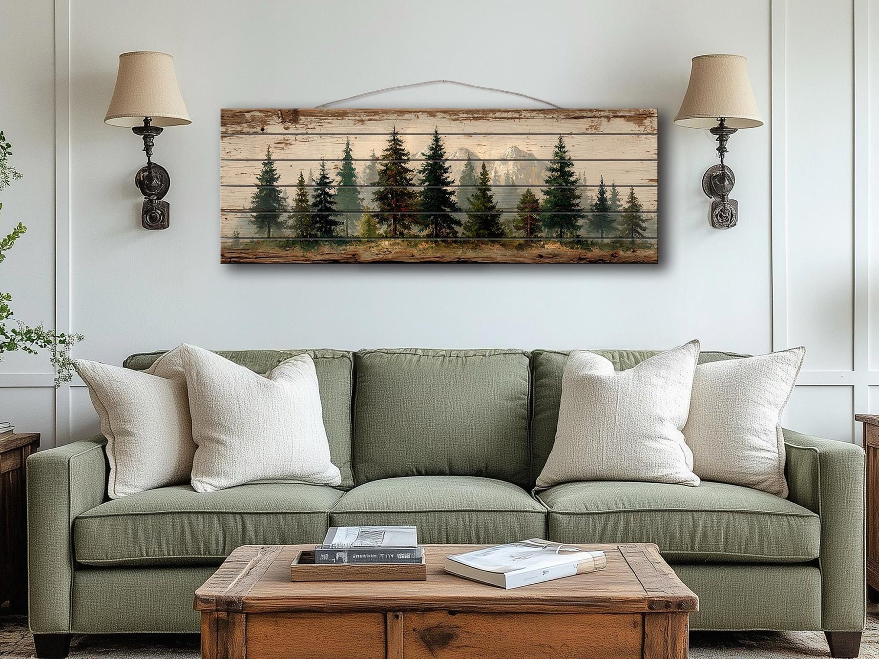 Rustic wood wall art featuring a distressed pine forest and mountain landscape over a tan sofa.