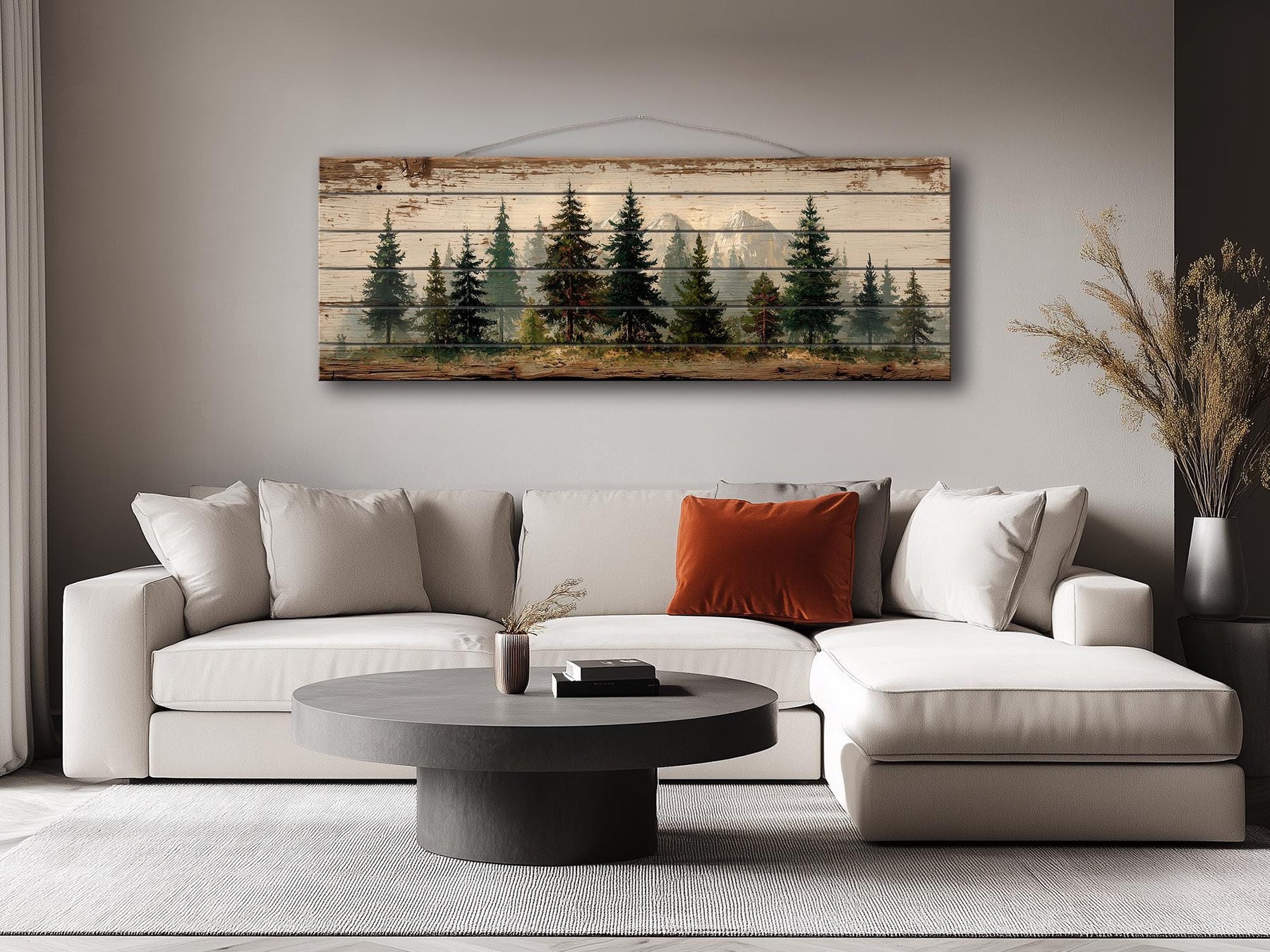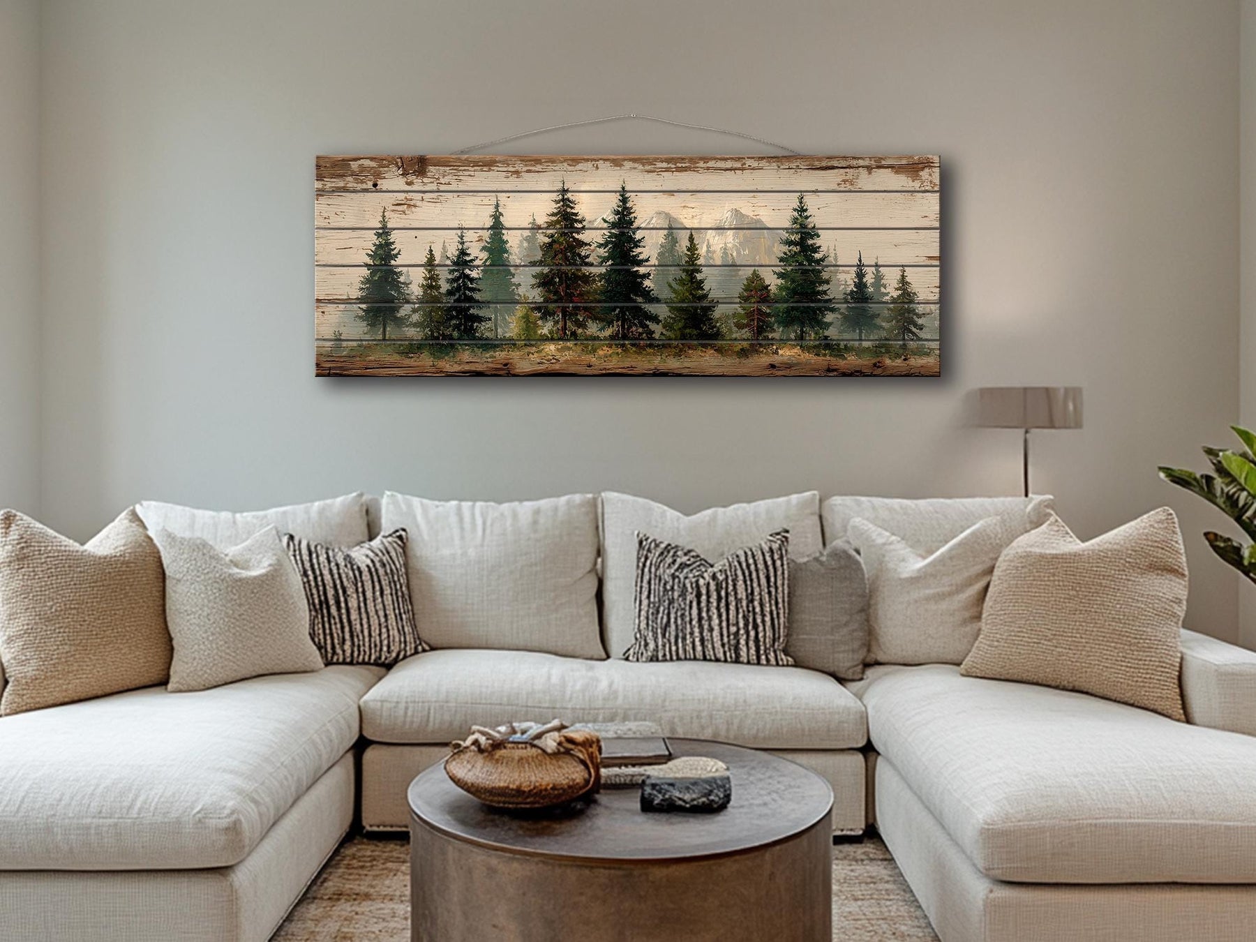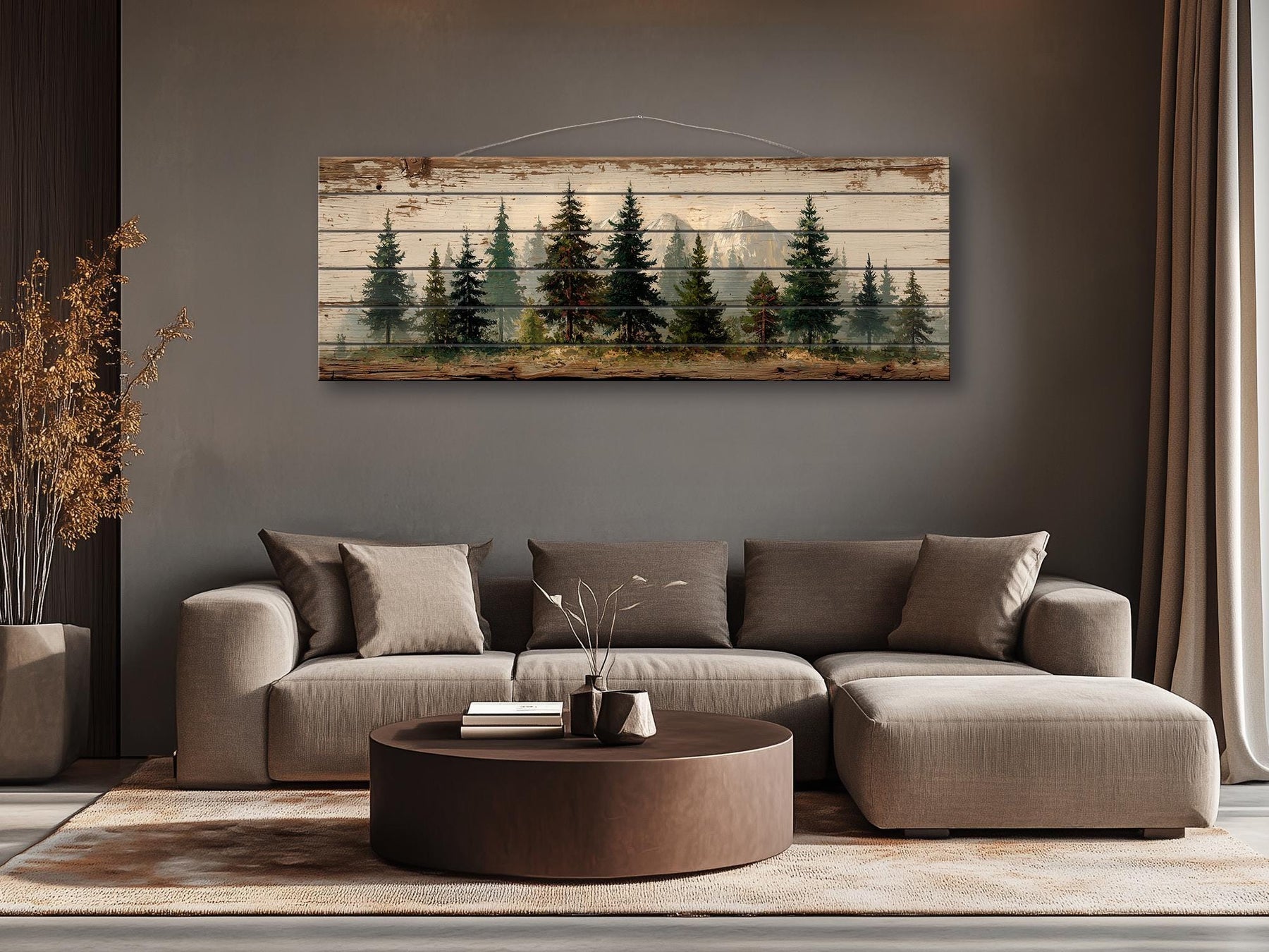 This pine forest wall decor is ideal for rustic interiors, cabin-style spaces, or any home designed to evoke the outdoors. Its long horizontal format fits beautifully above sofas, beds, or long entryway benches, offering visual width and grounding presence. For a mountain cabin or lodge-style home, it reinforces the feeling of being surrounded by nature, adding to the immersive tranquility of the space. In homes that feature leather, linen, jute, or reclaimed wood, this piece resonates deeply thanks to its neutral palette and organic composition. It also works beautifully in minimalist homes that include natural elements—think pale stone fireplaces, wood-beamed ceilings, or linen-covered seating. For lovers of Scandinavian hygge or modern farmhouse aesthetics, this piece bridges cozy comfort and visual simplicity. Because the art is printed on real wood with a distressed finish, it brings authentic texture that canvas and paper can’t replicate. In living rooms, dens, or reading nooks, it establishes a sense of quiet permanence and escape. With its calm energy and forested subject, this pine forest mountain wall art complements homes where nature and stillness matter most.
