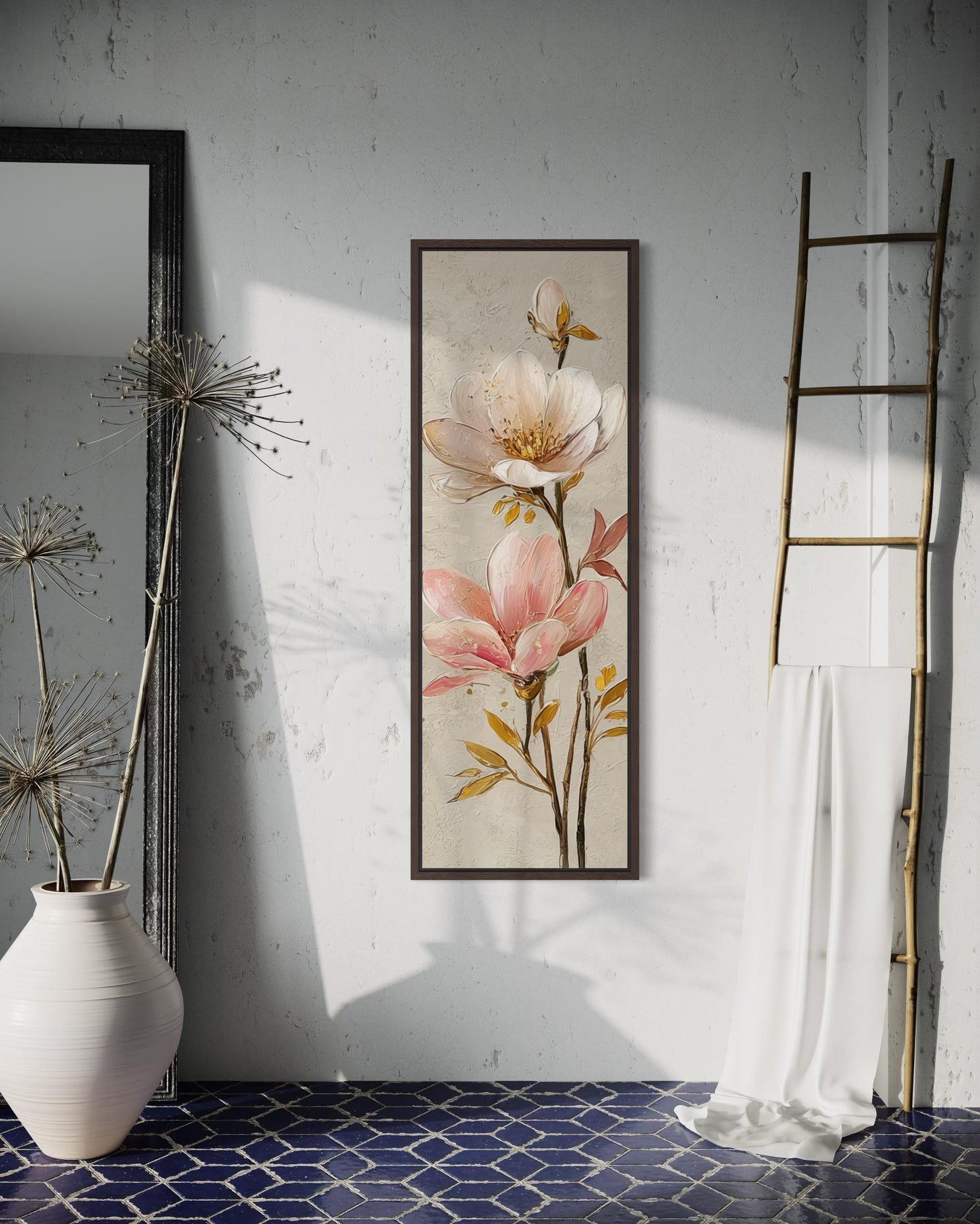 The palette of this floral vertical wall decor unfolds in a harmonious blend of warm pinks, muted neutrals, and natural greens, creating a visual atmosphere that is both calming and sophisticated. The magnolia petals display varying tones of blush, soft rose, and pastel coral, layered with subtle highlights that mimic sunlight filtering through thin, velvety petals. Accents of sage and olive green introduce organic depth to the stems and leaves, grounding the composition and complementing the soft florals. The background features a delicate mixture of beige, taupe, and ivory, designed to enhance the artwork’s luminosity while maintaining a neutral base that adapts effortlessly to surrounding decor. These colors evoke a natural balance—warmth from the blossoms, serenity from the neutrals, and freshness from the greens. Soft shadowing and blended textures add a painterly dimension, giving the piece the tactile warmth of hand-rendered art. The overall tone is gentle and inviting, making it ideal for spaces that favor light, warmth, and airiness. This pink magnolia painting harmonizes beautifully with wooden accents, neutral fabrics, and metallic tones, blending effortlessly with modern, transitional, or nature-inspired interiors. The palette exudes refinement without excess, offering an atmosphere of peace and beauty that feels as natural as it looks intentional. Every shade and brushstroke contributes to a composition that feels soft yet strong, making the artwork timelessly elegant.