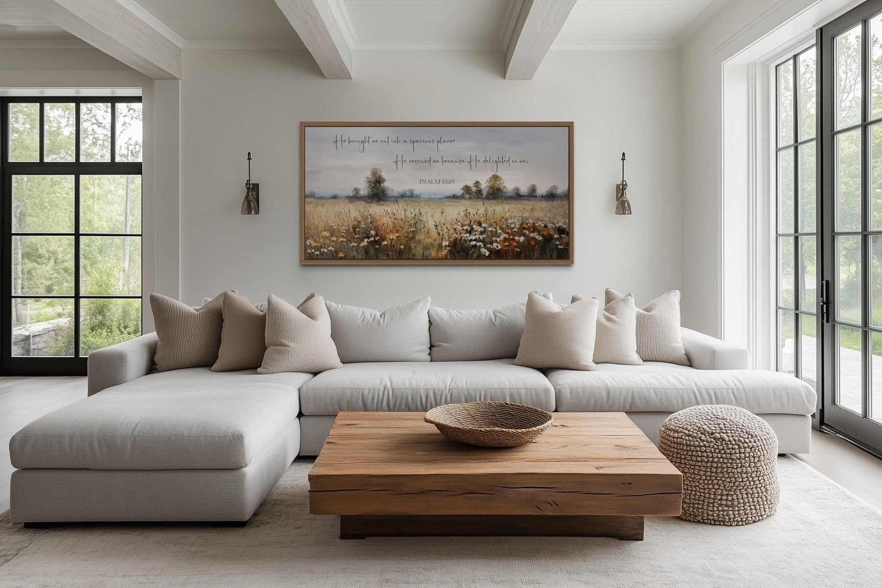 Psalm 18:19 Wall Art, He Brought Me Out Into a Spacious Place Scripture On Wildflowers Field Framed Canvas Wall Art