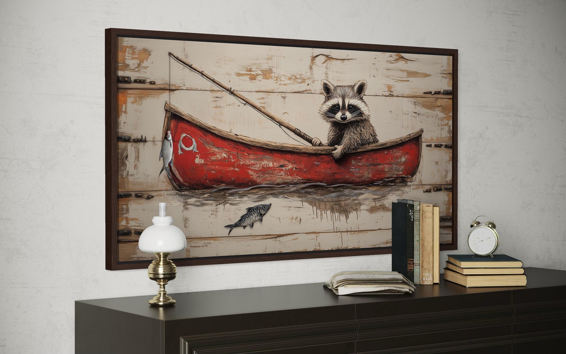 Whimsical wall art of a raccoon in a red canoe fishing, displayed in a rustic living room.