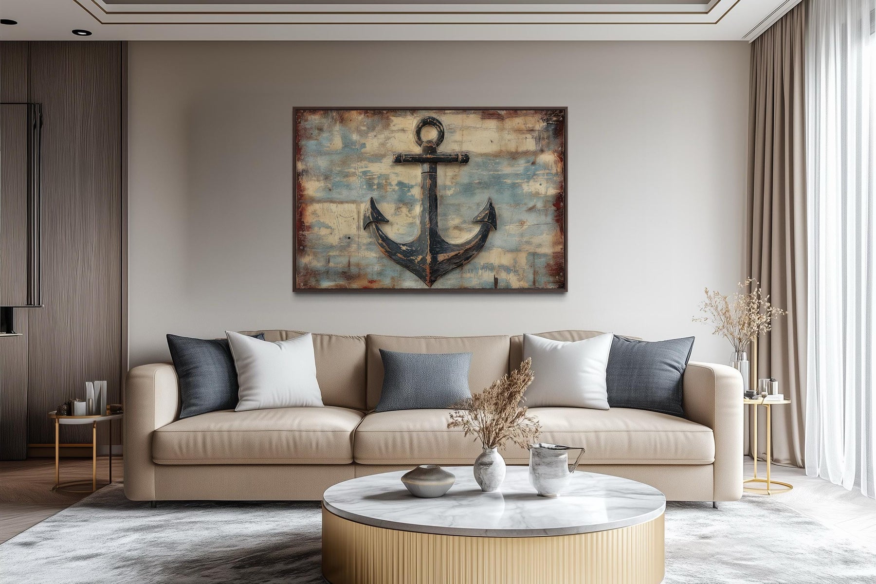 Rustic anchor wall art with a weathered nautical design on canvas in a modern living room.