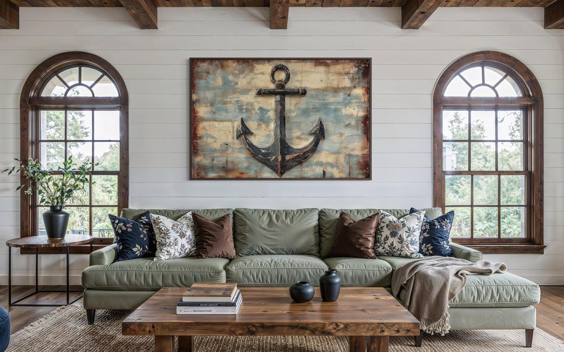 Rustic anchor wall art on a weathered wood-style canvas hangs above a green sofa in a coastal room.