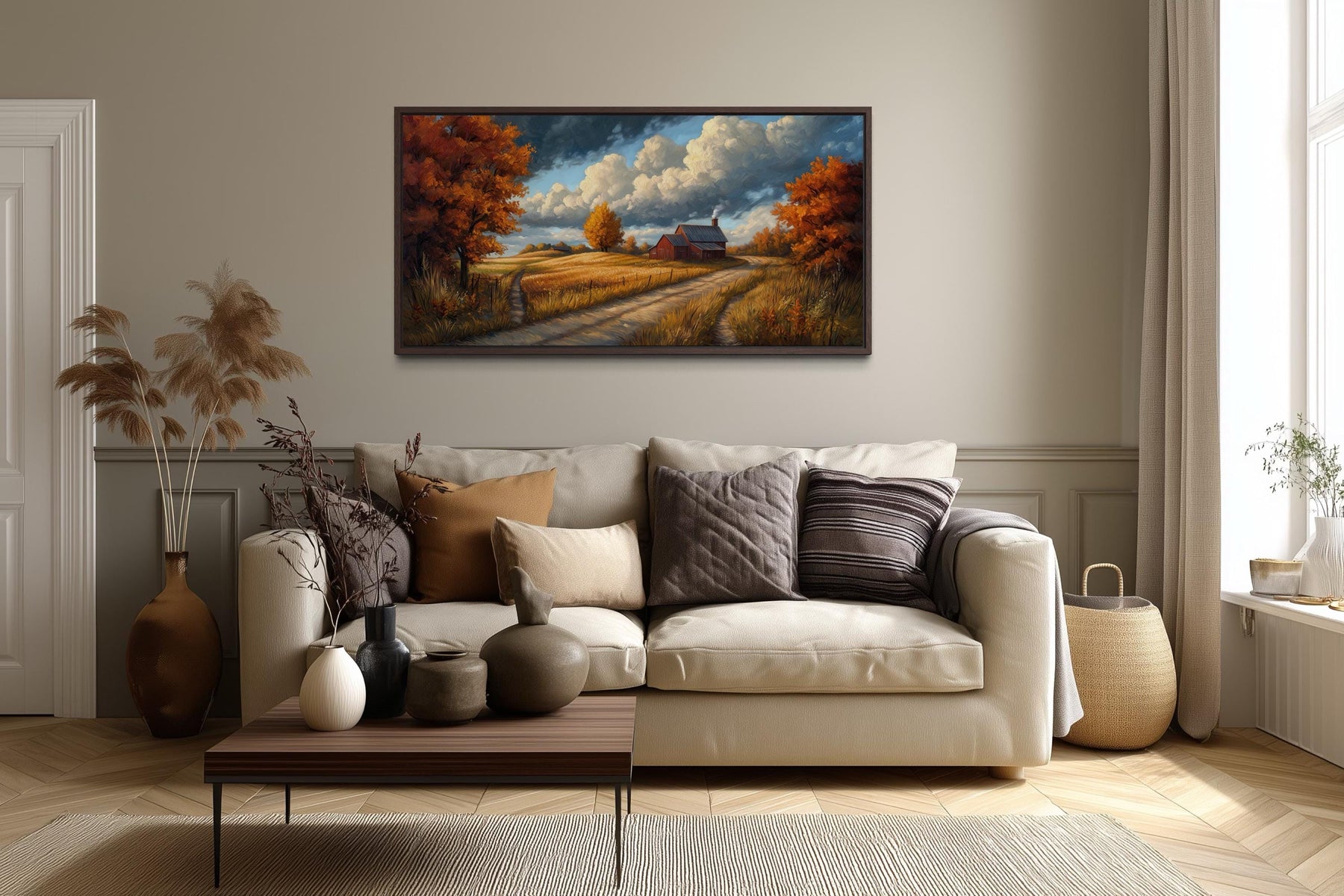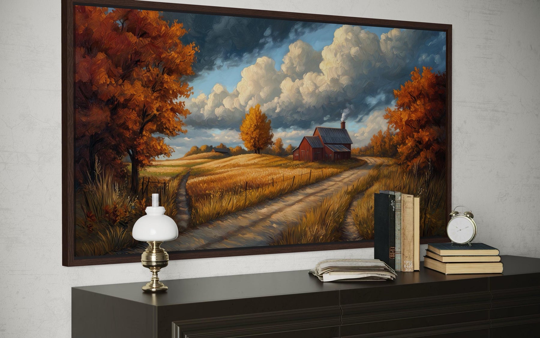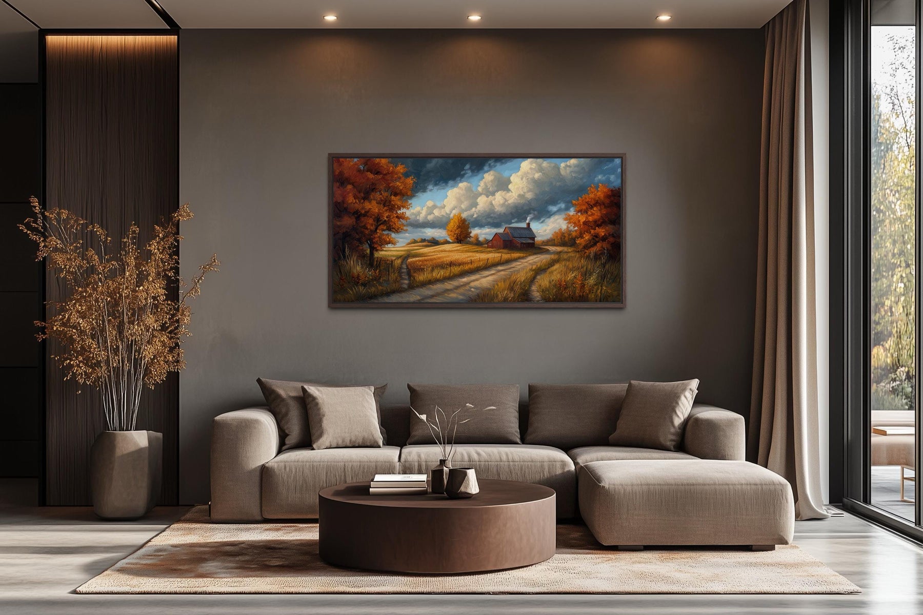 This rustic autumn barn landscape wall art is designed for homes that celebrate warmth, texture, and the spirit of the countryside. Perfect for farmhouse, rustic, cabin, or country-style interiors, it enhances spaces that value natural materials like wood, stone, and linen. When placed above a sofa, mantel, or dining area, it becomes a statement piece that radiates comfort and nostalgia. The warm colors pair beautifully with neutral walls, creating a striking focal point without overwhelming the room’s balance. In modern farmhouse décor, its earthy tones complement weathered finishes, woven fabrics, and soft lighting, making it ideal for both cozy cottages and refined contemporary spaces. In lodges or mountain homes, the piece connects perfectly with log beams, leather furniture, and autumn-themed accents, tying together the essence of nature and craftsmanship. Its timeless subject matter—the barn, the trees, and the road—creates an atmosphere of grounded tranquility that appeals across generations. Even in minimalist spaces, it introduces organic warmth and visual interest without clutter. Every detail of this autumn canvas print invites a sense of belonging, turning any wall into a window to the peaceful countryside. This rustic barn painting captures the enduring magic of the season and transforms your interior into a haven of comfort, beauty, and timeless rural grace.