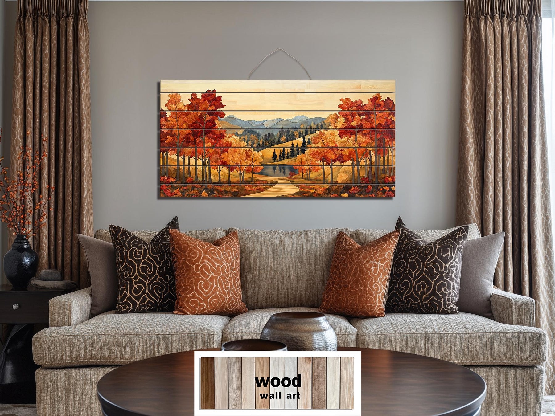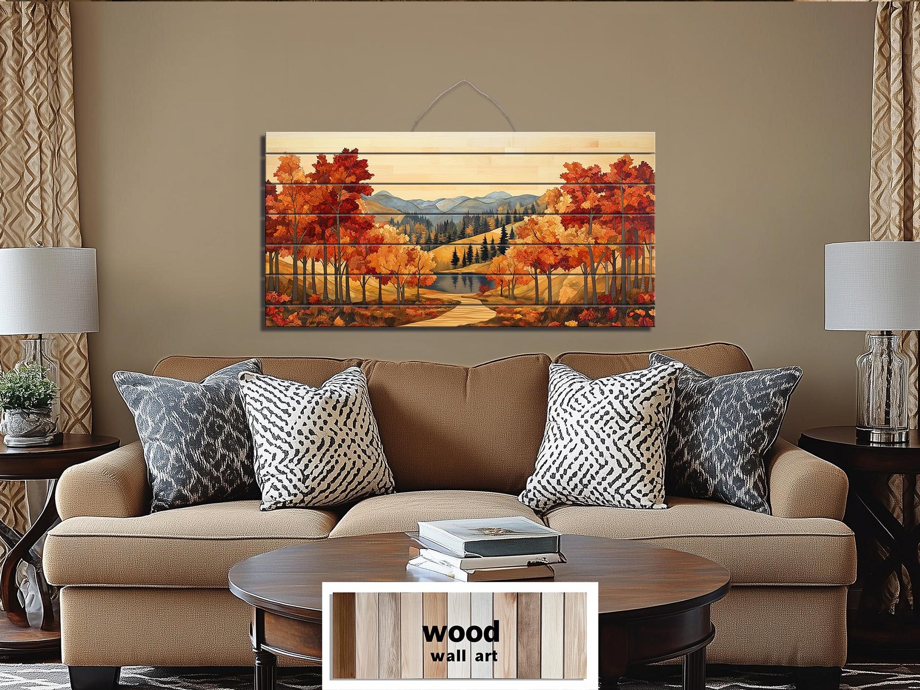 The Rustic Autumn Forest Mountain Lake wall art is ideal for rustic cabins or farmhouse living rooms that embrace the warmth of the season. In a cabin, it pairs naturally with exposed wood beams, stone fireplaces, and cozy textiles, creating an inviting retreat that echoes the world outside. In a farmhouse-inspired space, it complements reclaimed wood furniture, neutral walls, and natural fiber rugs, infusing the room with rich autumn energy. The long horizontal format fits beautifully over a fireplace, sofa, or dining room sideboard, adding breadth and visual interest. Its distressed finish suggests a cherished heirloom while the new wood construction ensures lasting strength and stability. This combination of old-world charm and fresh durability makes it a versatile accent that will remain a centerpiece through many fall seasons. Whether used to welcome guests in a family room or to bring seasonal warmth to a gathering space, the Rustic Autumn Forest Mountain Lake canvas-like wall decor offers an enduring touch of natural beauty. Designed for easy installation and year-round enjoyment, it adds authentic seasonal color and rustic character. Ending with quiet elegance, this Rustic Autumn Forest Mountain Lake distressed wood wall art completes your home with the lasting glow of autumn.