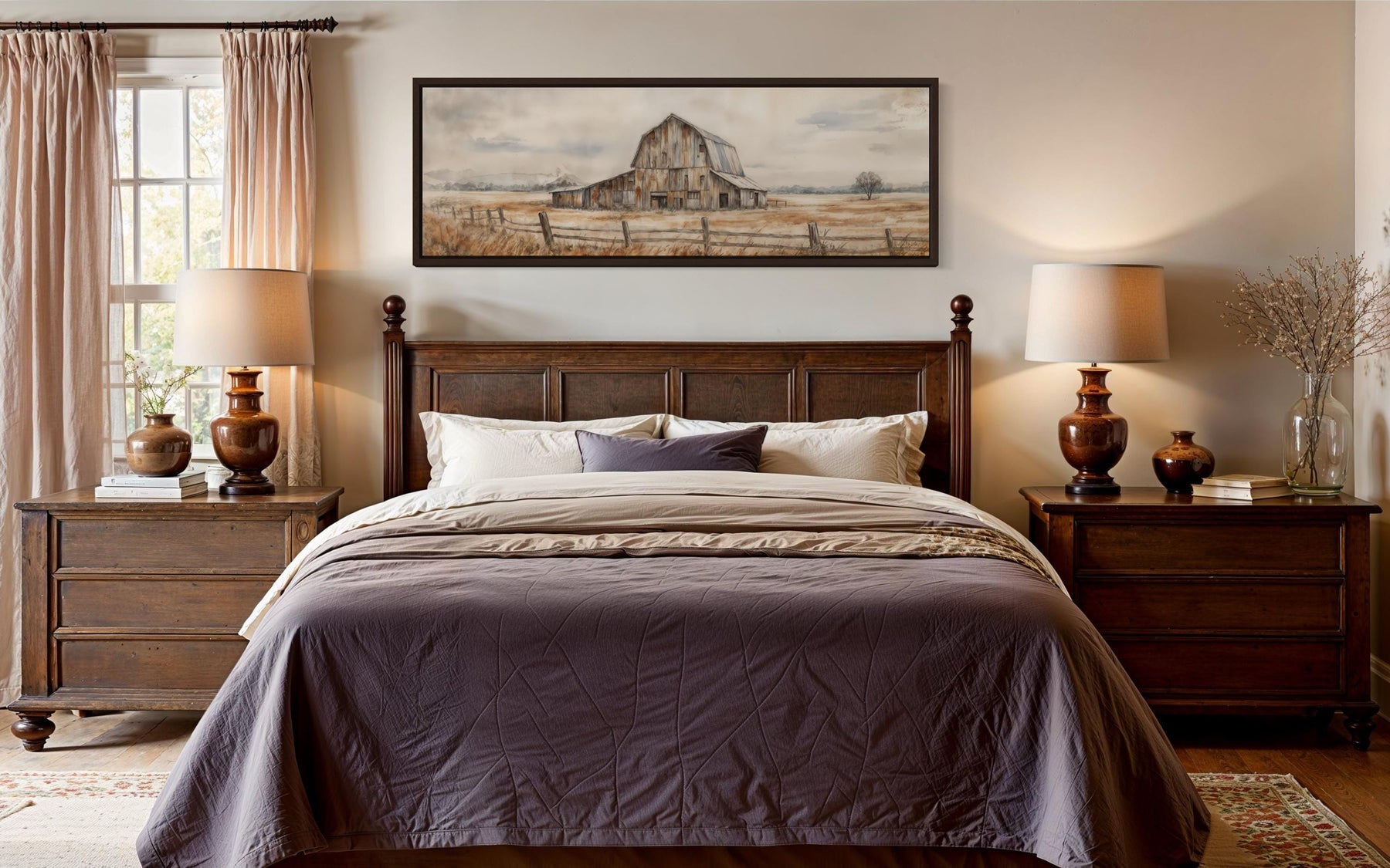 This long horizontal barn canvas print is made for modern farmhouse homes, neutral interiors, or rustic transitional rooms that benefit from calm, horizontal balance. It looks especially striking above a long couch or behind a king or queen bed, where its stretched proportion matches the width of furniture and provides anchoring visual symmetry. In a dining room, hallway, or large entry wall, it adds rustic character while keeping the space feeling open and uncluttered. This piece fits seamlessly into rooms with wood, wicker, linen, or jute textures and is equally complementary to whitewashed, charcoal, or reclaimed wood accents. With its elongated design, it offers more breathing room between other decor elements while still tying the space together. It also works well in gallery wall layouts, where its panoramic shape breaks up square or vertical frames. This barn wall decor is not seasonal—it’s the type of piece that remains timeless and welcoming throughout the year. The artwork’s subject, style, and subdued tones make it endlessly versatile, and its dimensions give visual flow to both small and large spaces. As a printed canvas, this artwork is ready to complete your neutral farmhouse decor.