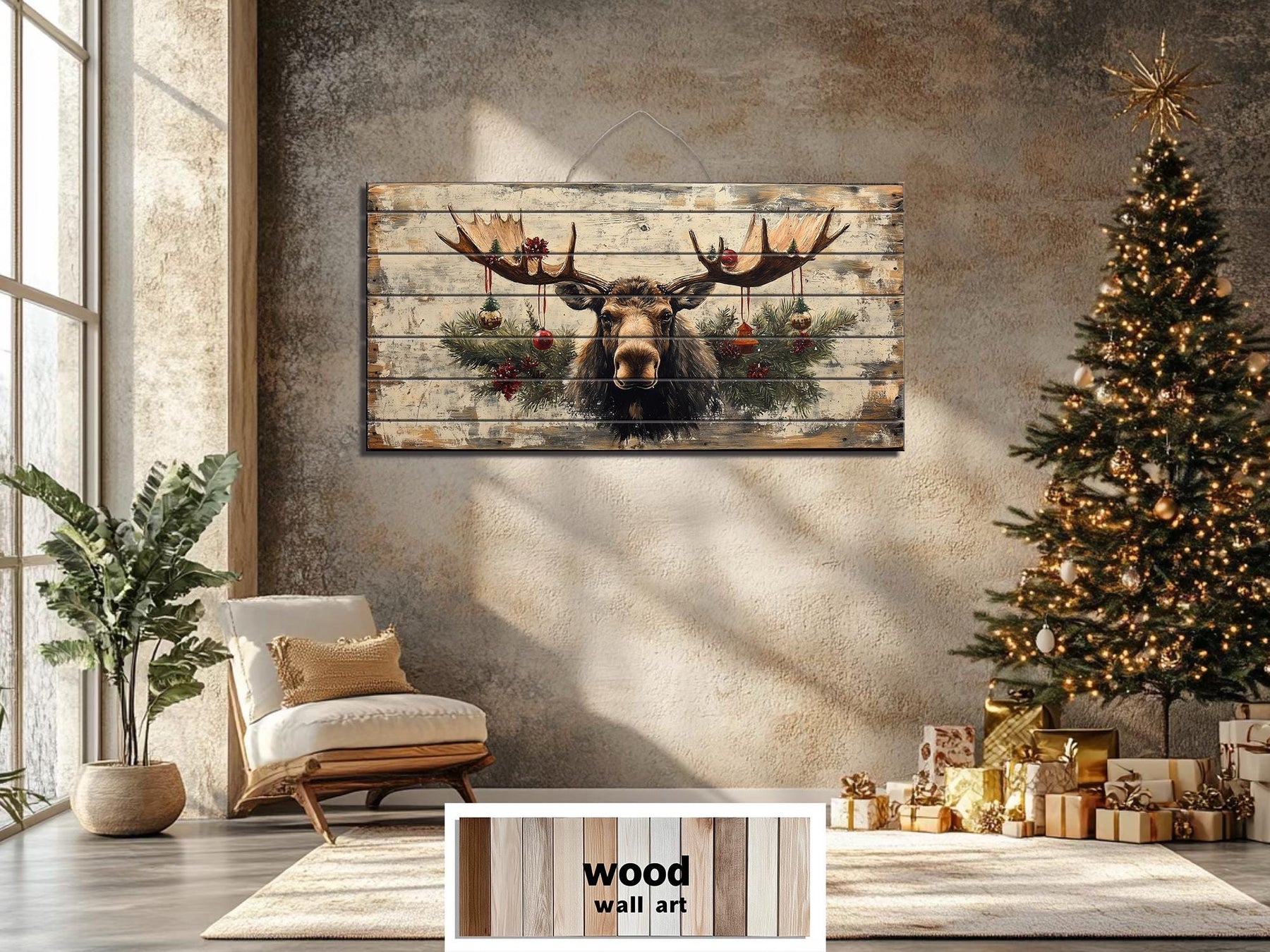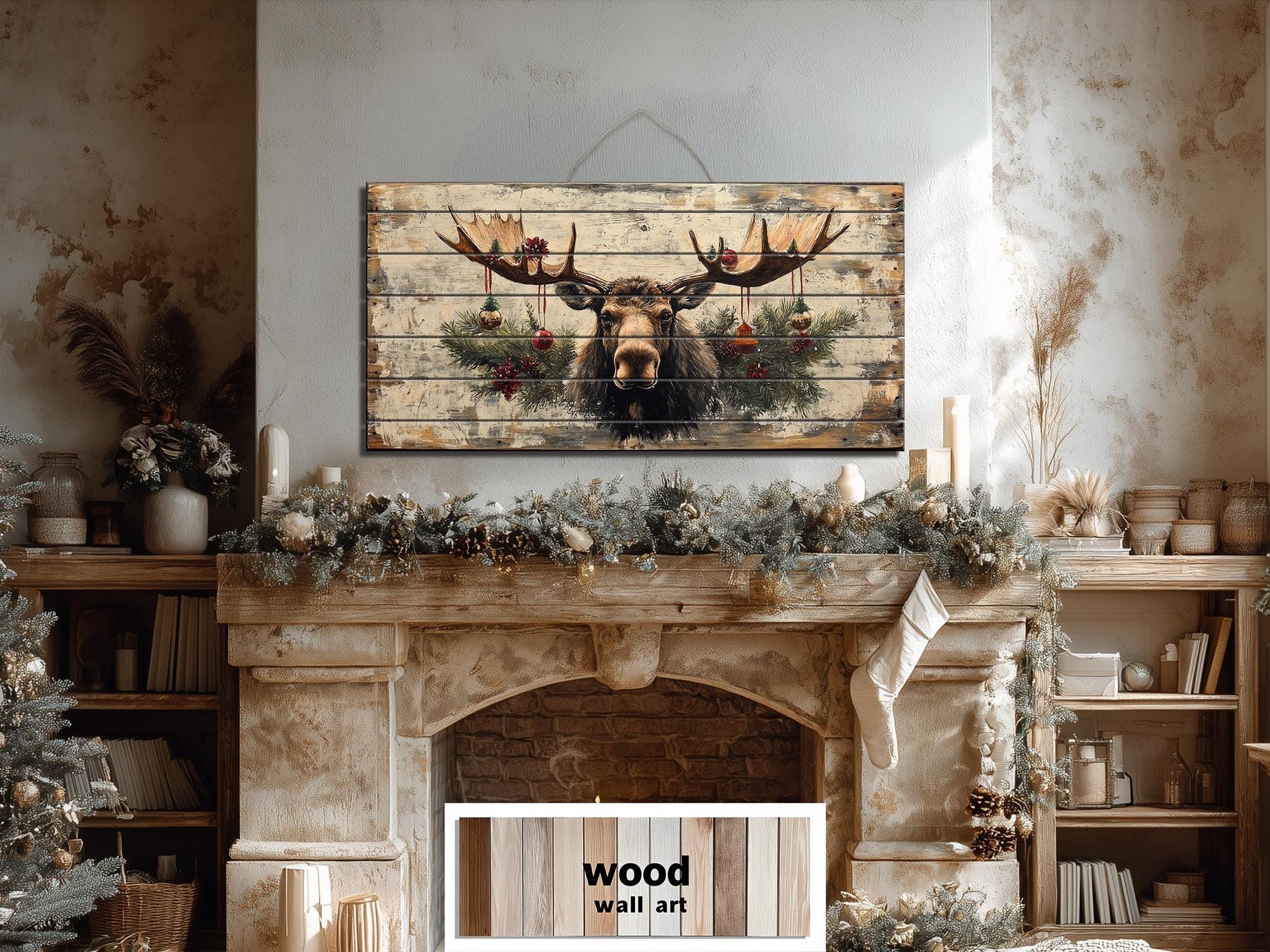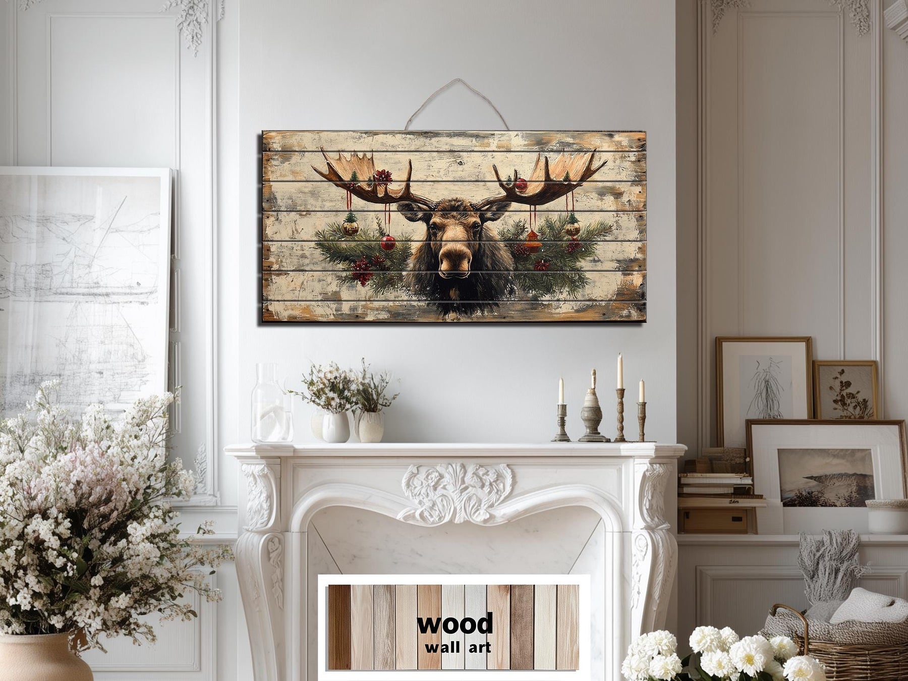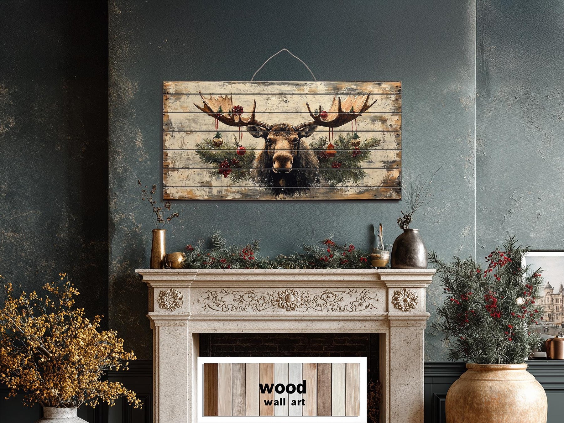 The color scheme of this Rustic Christmas Moose With Ornaments distressed wood wall art beautifully combines natural forest tones with festive holiday accents. Deep browns and soft tans define the moose, highlighting its strength and lifelike texture. Crisp whites and silvery grays capture freshly fallen snow and frosty air, bringing cool brightness to the composition. Hints of evergreen green peek through branches and garlands, adding a natural sense of life amid the winter stillness. Bright reds and subtle golds sparkle in the ornaments, offering cheerful contrast that recalls traditional Christmas decorations. Gentle beiges and warm creams in the background soften the palette, ensuring a cozy and inviting mood. The distressed wood finish enhances every hue, giving the scene a weathered charm that feels timeless and rich. Subtle shadows in charcoal and deep forest tones create depth and draw the viewer into the landscape. Whether viewed by daylight or the warm glow of evening lights, the colors stay vivid and balanced, highlighting both the festive ornaments and the majestic wildlife. This thoughtful palette brings together the best of winter wilderness and holiday celebration. The result is a Rustic Christmas Moose With Ornaments painting that keeps its seasonal magic alive year after year, finishing with the classic beauty of Rustic Christmas Moose With Ornaments wall decor.