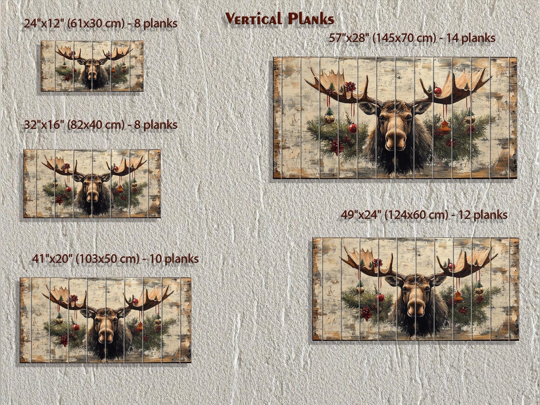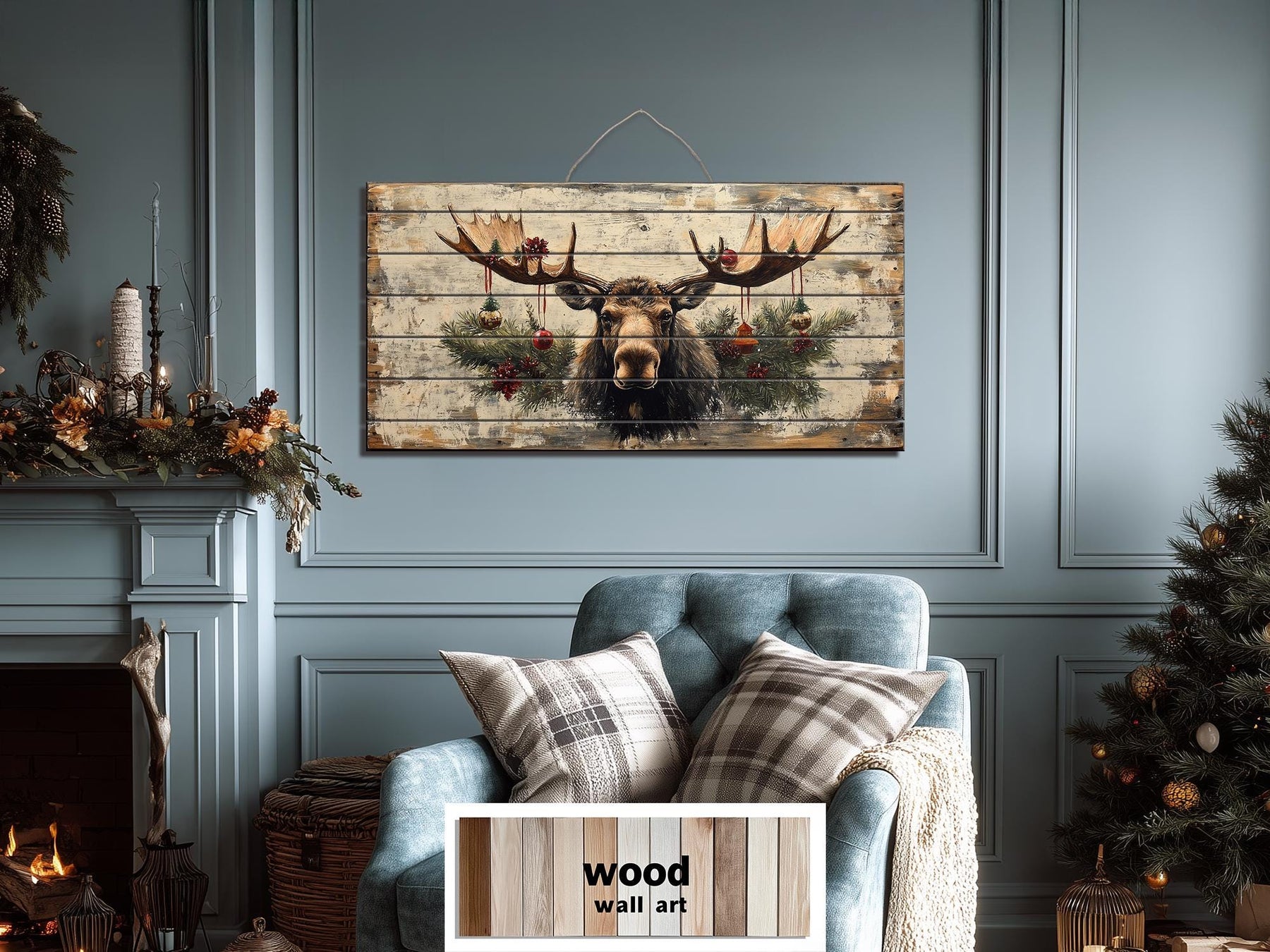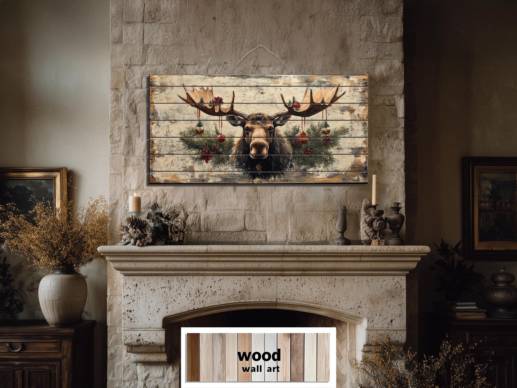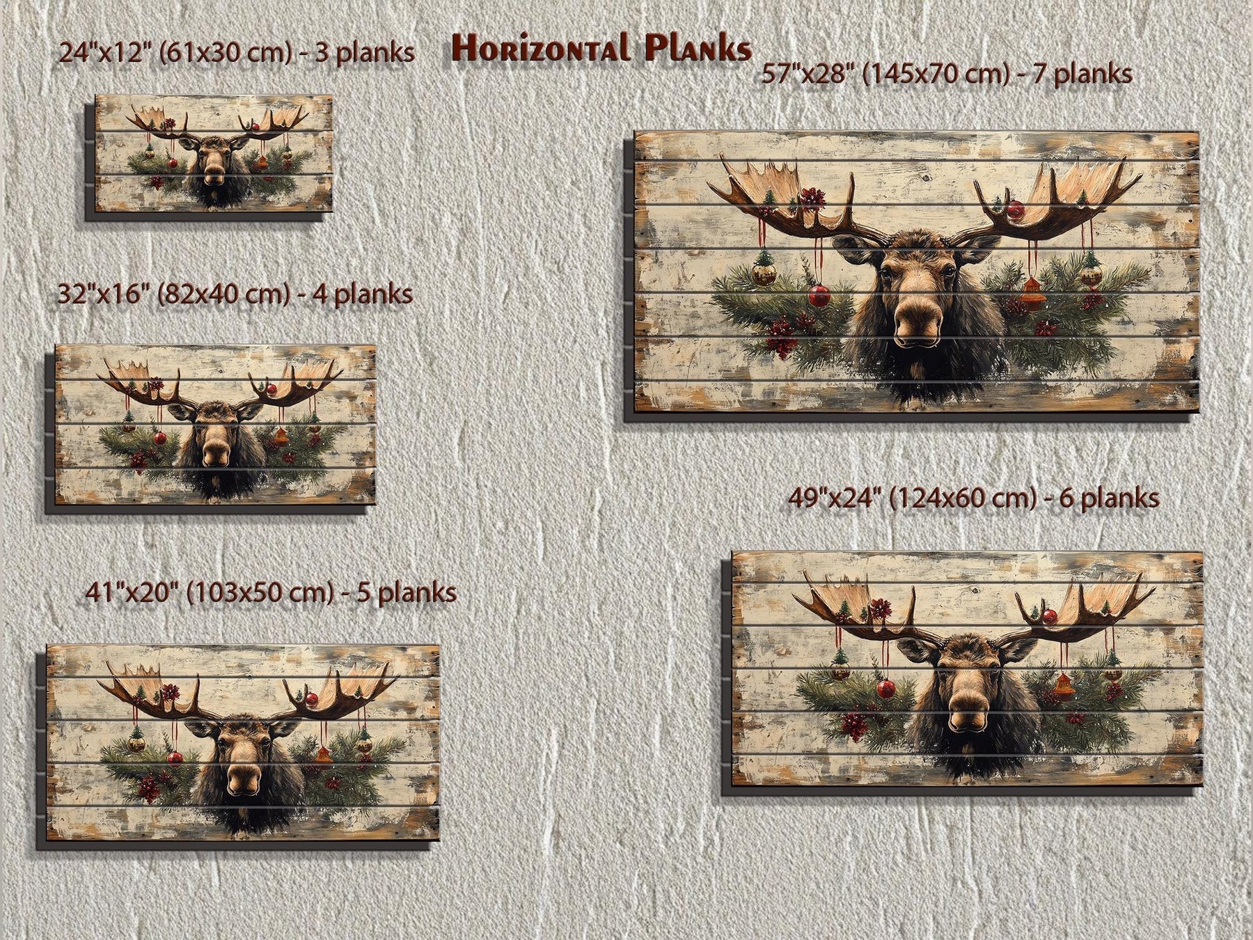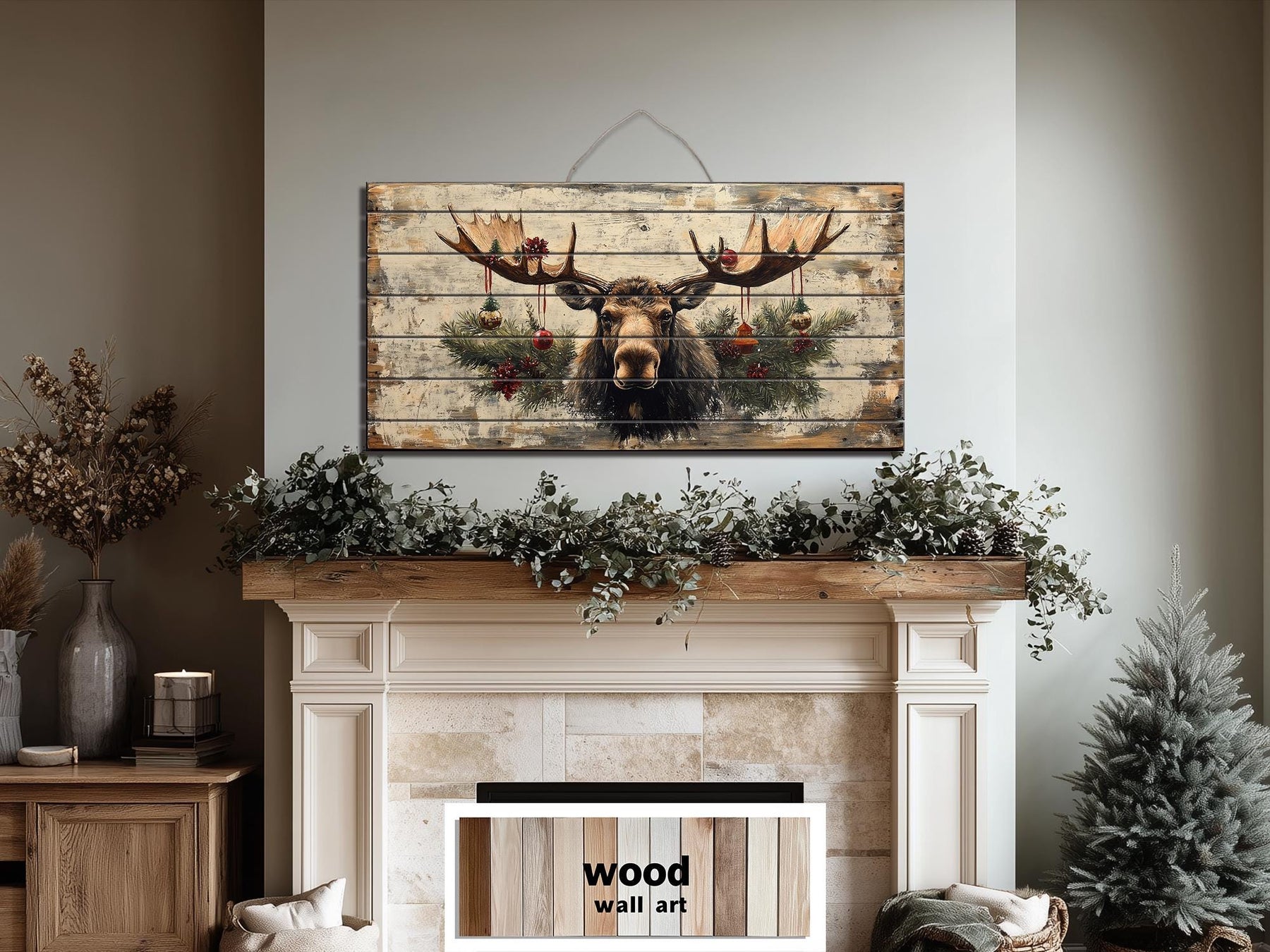 The color scheme of this Rustic Christmas Moose With Ornaments distressed wood wall art beautifully combines natural forest tones with festive holiday accents. Deep browns and soft tans define the moose, highlighting its strength and lifelike texture. Crisp whites and silvery grays capture freshly fallen snow and frosty air, bringing cool brightness to the composition. Hints of evergreen green peek through branches and garlands, adding a natural sense of life amid the winter stillness. Bright reds and subtle golds sparkle in the ornaments, offering cheerful contrast that recalls traditional Christmas decorations. Gentle beiges and warm creams in the background soften the palette, ensuring a cozy and inviting mood. The distressed wood finish enhances every hue, giving the scene a weathered charm that feels timeless and rich. Subtle shadows in charcoal and deep forest tones create depth and draw the viewer into the landscape. Whether viewed by daylight or the warm glow of evening lights, the colors stay vivid and balanced, highlighting both the festive ornaments and the majestic wildlife. This thoughtful palette brings together the best of winter wilderness and holiday celebration. The result is a Rustic Christmas Moose With Ornaments painting that keeps its seasonal magic alive year after year, finishing with the classic beauty of Rustic Christmas Moose With Ornaments wall decor.