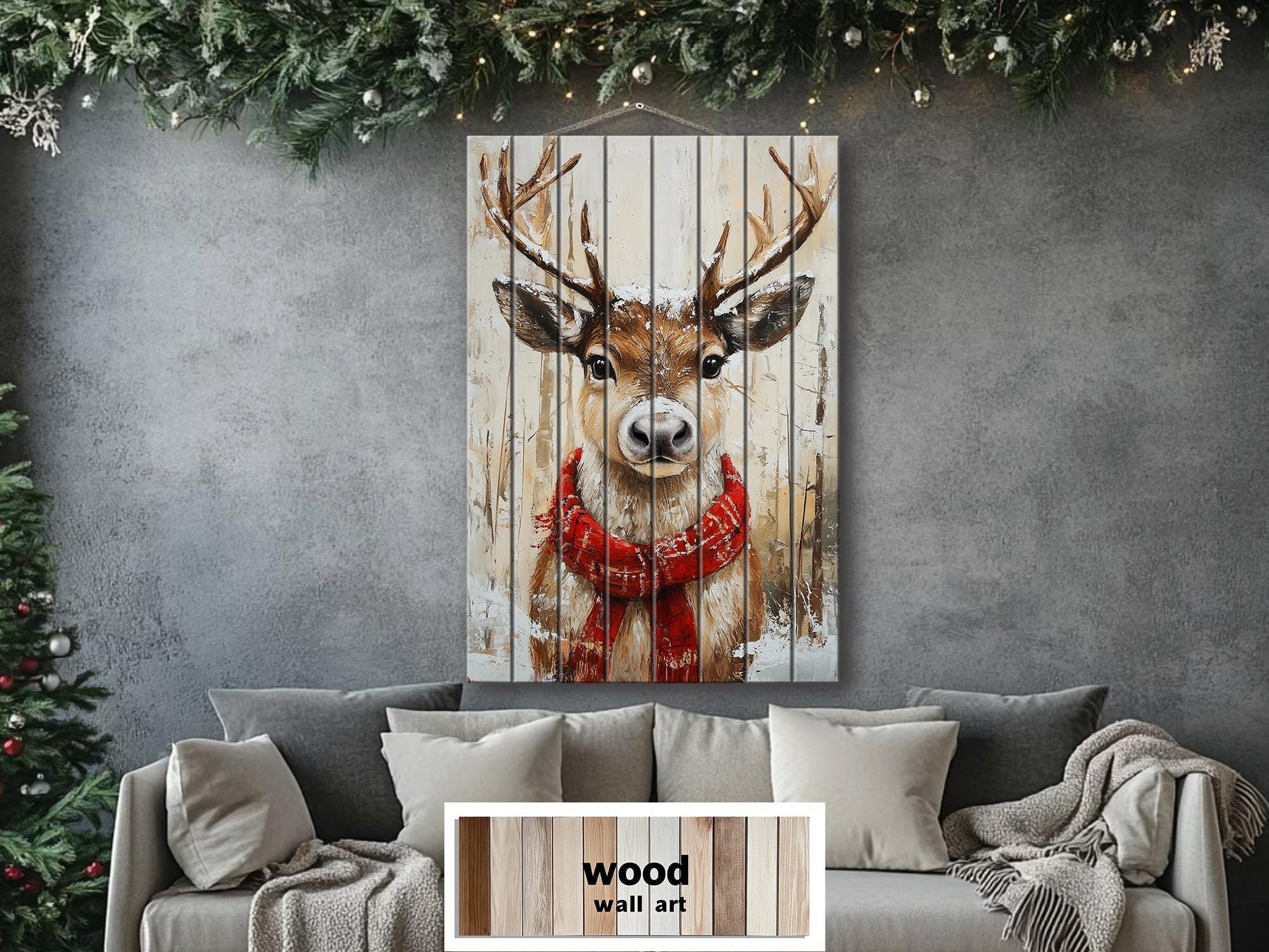Our rustic Christmas reindeer wall art on distressed wood wall decor brings festive charm and woodland spirit together in one joyful design. The artwork features a beautifully illustrated reindeer with tall antlers adorned in strings of red and gold Christmas ornaments, cranberries, and subtle snowflakes. The reindeer’s expression is calm and inviting, making it feel like a guest straight from a forested winter wonderland. Printed directly on vertical wooden planks, the artwork highlights the texture and grain of the wood underneath, allowing the natural surface to add warmth and authenticity to the holiday scene. The painting is intentionally distressed with faded paint effects, soft edges, and a slightly weathered tone that feels handcrafted and cozy. Hints of flannel pattern peek from the scarf around the reindeer’s neck, and muted brushwork gives the fur a textured, wooly look. The antlers stretch tall into the upper portion of the artwork, balancing the vertical format and adding graceful motion to the composition. With its woodsy animal subject and festive touches, this print feels both nostalgic and playful—perfect for adding a rustic accent to winter spaces. It evokes the look of traditional lodge signage or holiday decor made from salvaged materials, but with a refined illustrative style. This reindeer Christmas painting on wood adds instant character to your seasonal decorating.