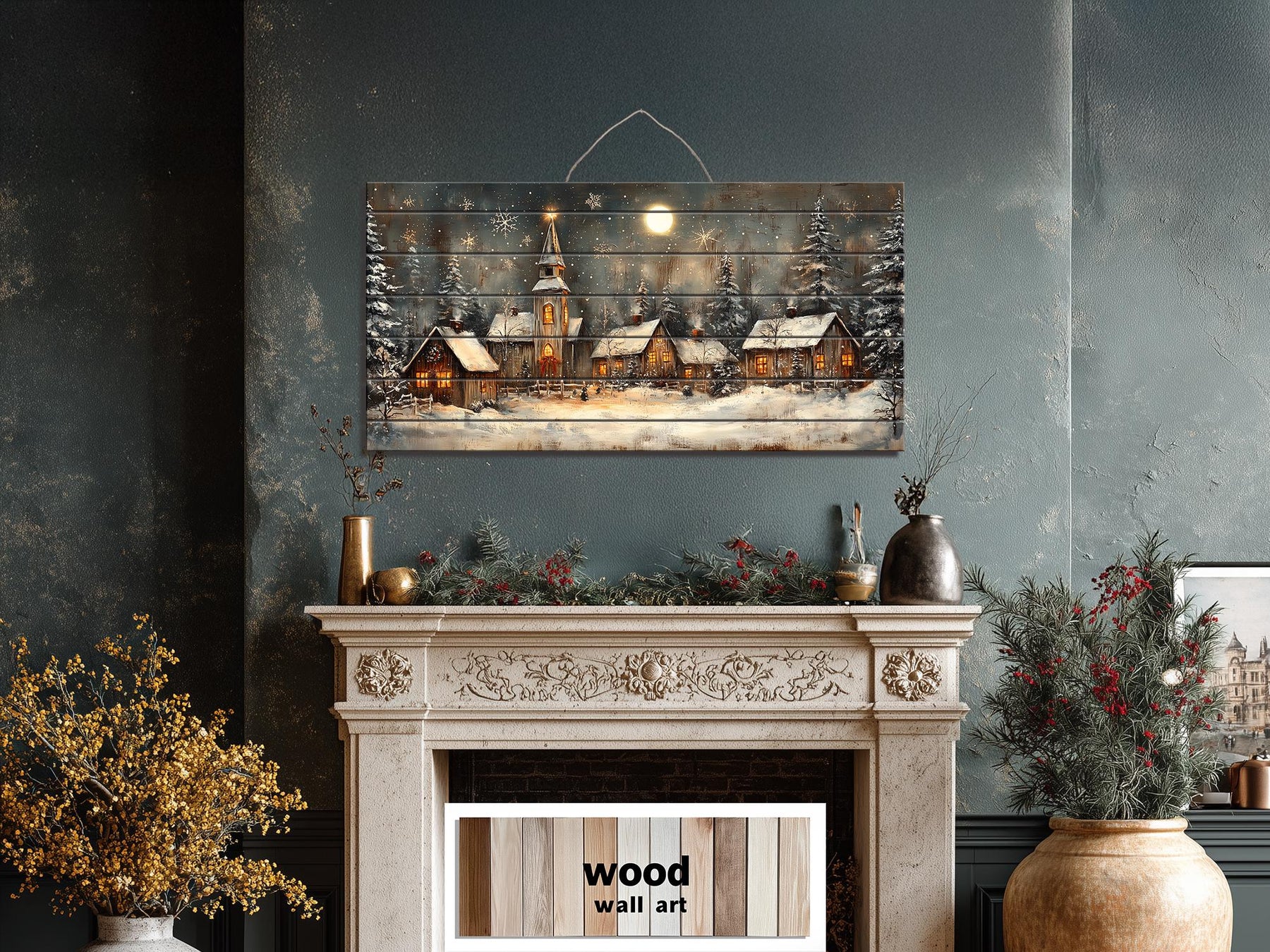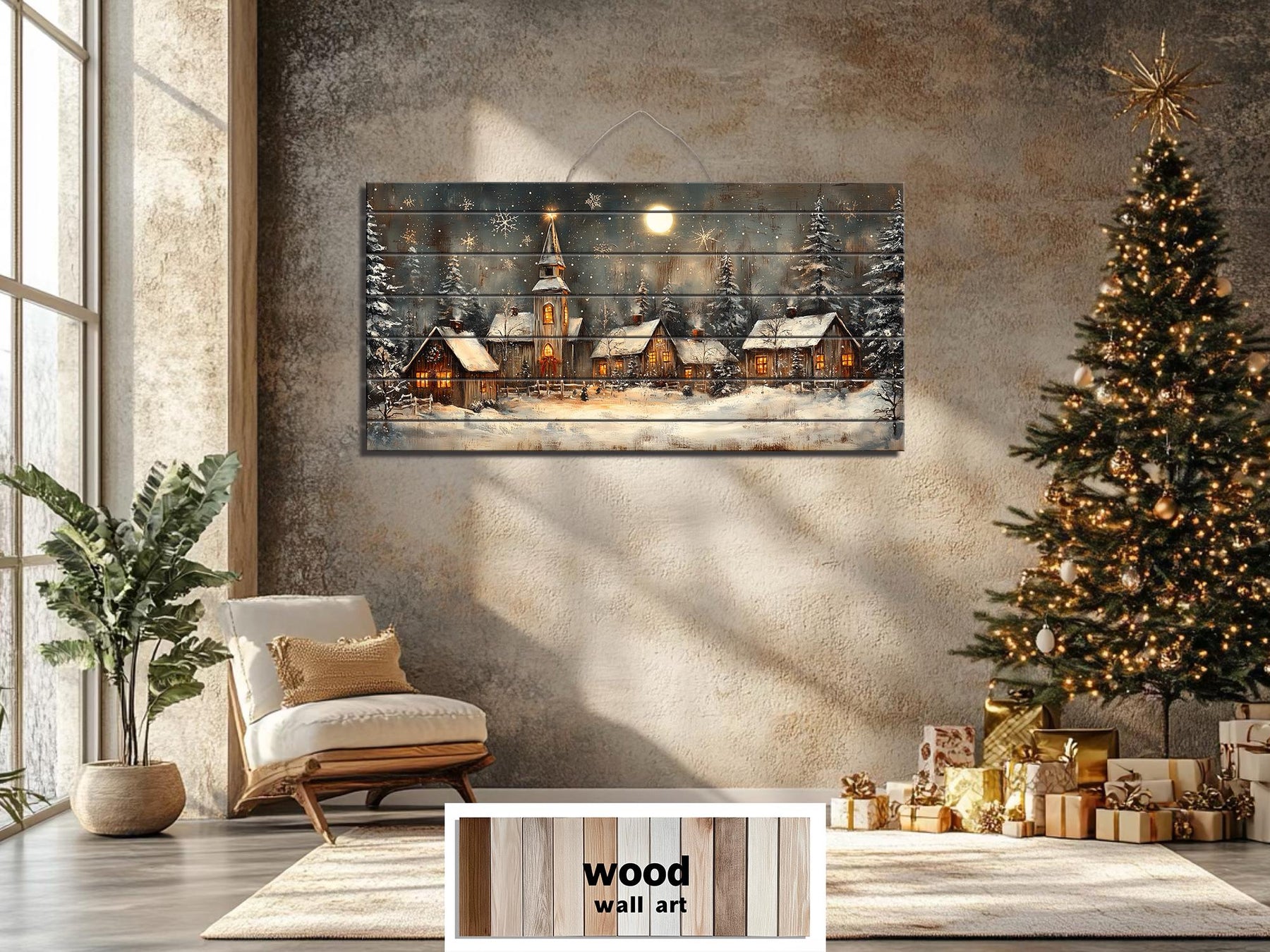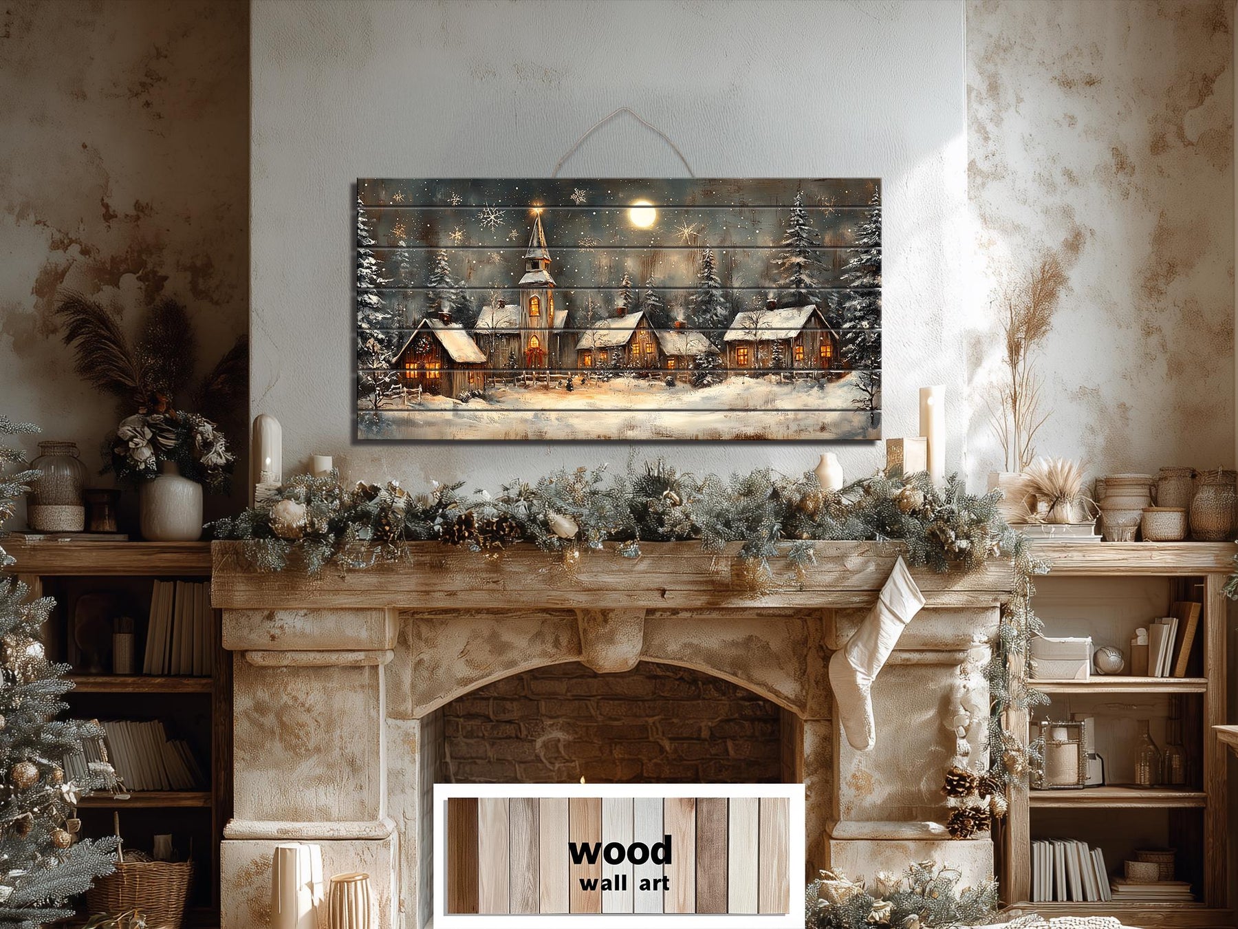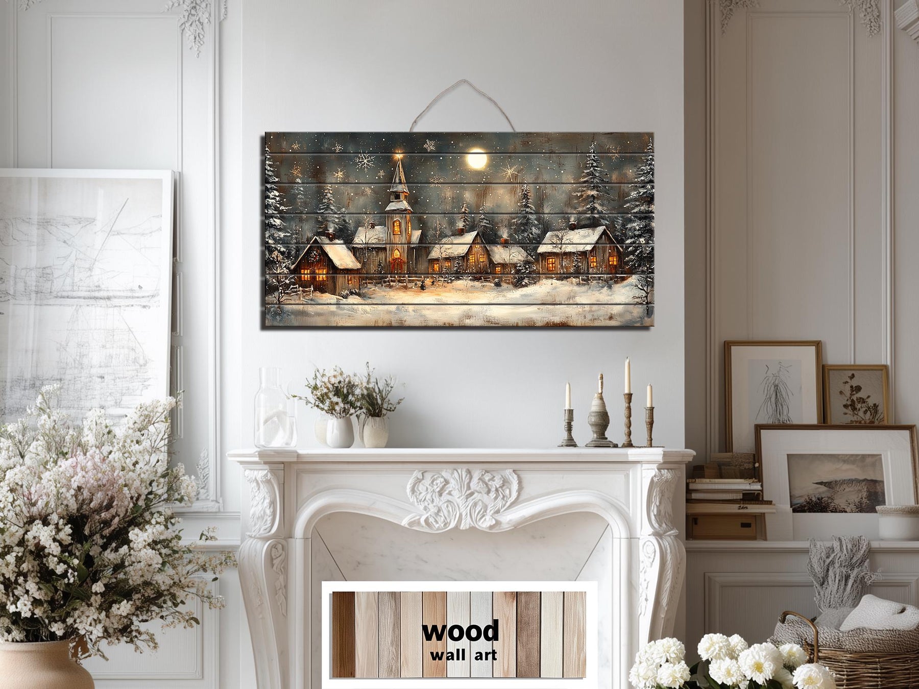 This Rustic Christmas Snowy Village distressed wood wall art is perfectly suited for farmhouse holiday interiors and cozy rustic cabins. Its snowy village scene harmonizes beautifully with natural materials like reclaimed wood, stone fireplaces, and soft woven textiles. In a farmhouse living room, it becomes a captivating centerpiece above the mantel, pairing effortlessly with evergreen garlands, plaid blankets, and candlelit decorations. In a mountain retreat or country cabin, it reflects the serene landscapes just outside, creating a seamless connection between indoor comfort and outdoor beauty. The gently weathered wood adds authentic vintage character, making the piece feel like a beloved heirloom passed down through generations. Its wide horizontal layout is ideal for prominent display in dining areas, family gathering spaces, or welcoming entryways. The crisp winter tones and golden highlights make it a natural match for traditional Christmas decor, from classic red and green to more neutral seasonal palettes. As a single statement piece or part of a larger holiday display, this Rustic Christmas Snowy Village painting infuses warmth and nostalgia into every room. Its combination of rustic charm and timeless holiday spirit ensures it will be treasured year after year. Complete your festive setting with the enduring beauty of Rustic Christmas Snowy Village wall art.