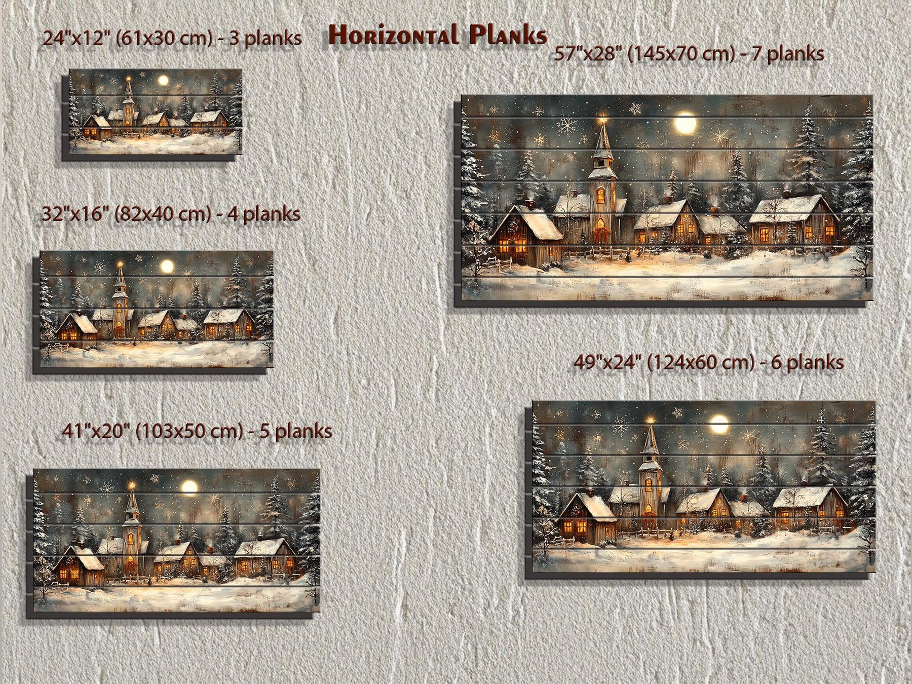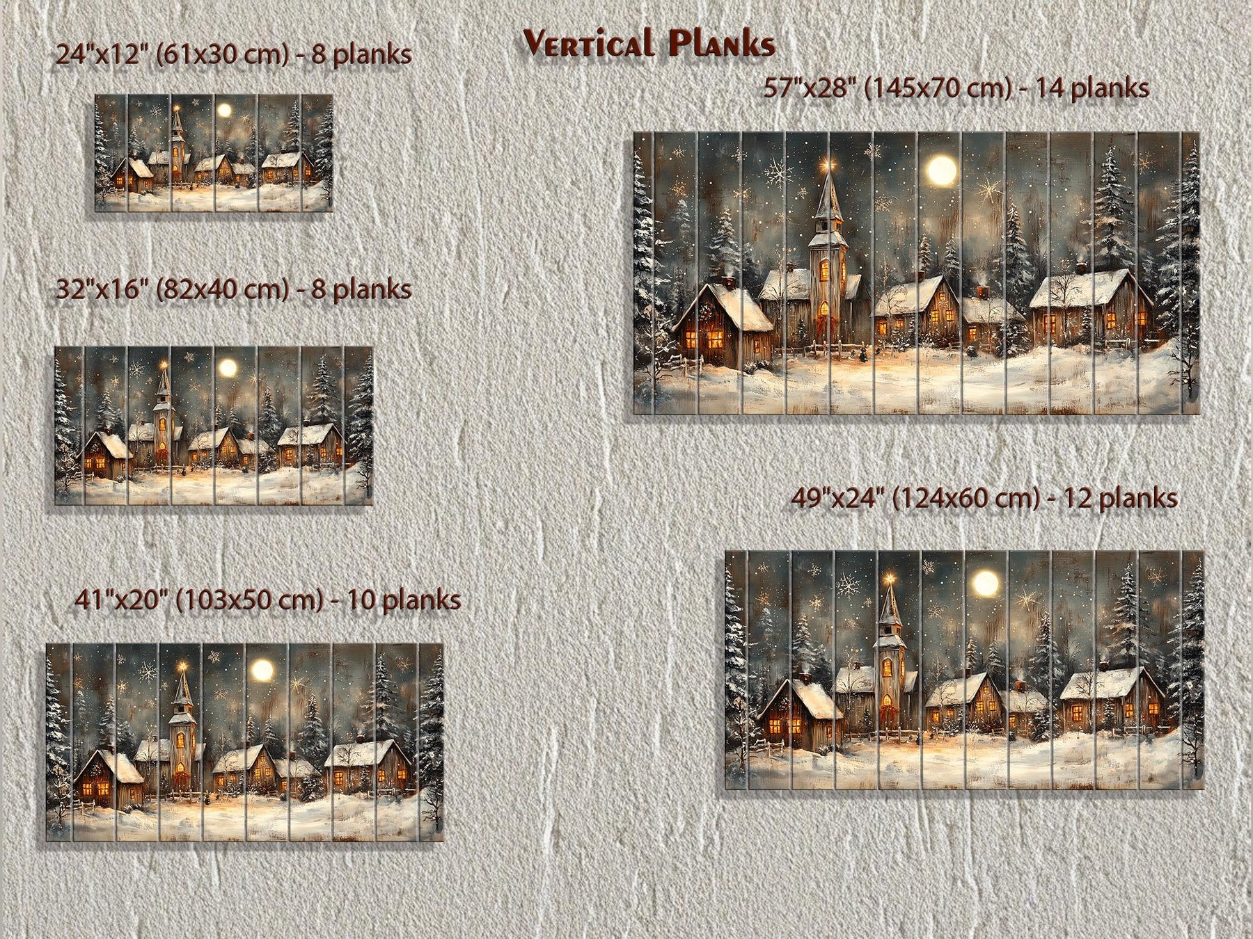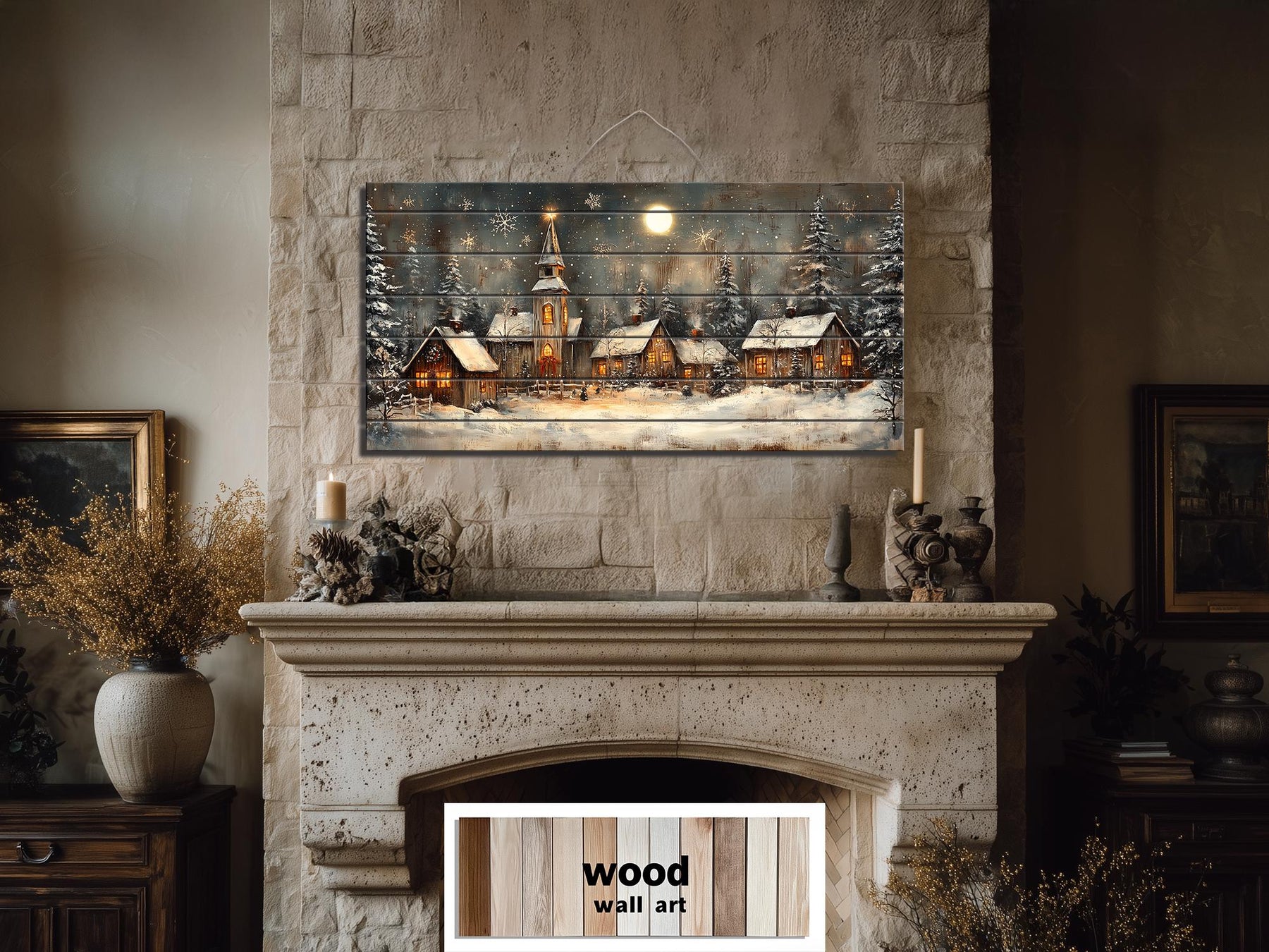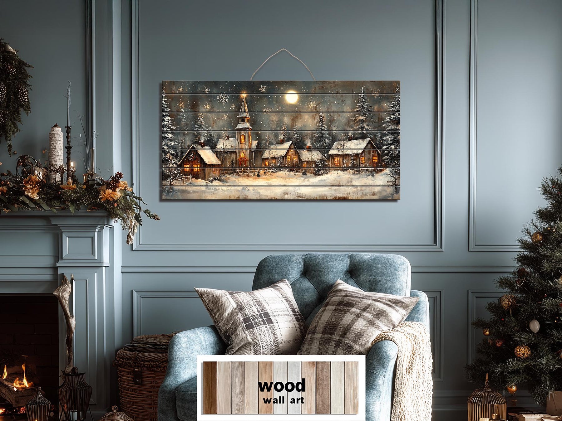 This Rustic Christmas Snowy Village distressed wood wall art is perfectly suited for farmhouse holiday interiors and cozy rustic cabins. Its snowy village scene harmonizes beautifully with natural materials like reclaimed wood, stone fireplaces, and soft woven textiles. In a farmhouse living room, it becomes a captivating centerpiece above the mantel, pairing effortlessly with evergreen garlands, plaid blankets, and candlelit decorations. In a mountain retreat or country cabin, it reflects the serene landscapes just outside, creating a seamless connection between indoor comfort and outdoor beauty. The gently weathered wood adds authentic vintage character, making the piece feel like a beloved heirloom passed down through generations. Its wide horizontal layout is ideal for prominent display in dining areas, family gathering spaces, or welcoming entryways. The crisp winter tones and golden highlights make it a natural match for traditional Christmas decor, from classic red and green to more neutral seasonal palettes. As a single statement piece or part of a larger holiday display, this Rustic Christmas Snowy Village painting infuses warmth and nostalgia into every room. Its combination of rustic charm and timeless holiday spirit ensures it will be treasured year after year. Complete your festive setting with the enduring beauty of Rustic Christmas Snowy Village wall art.