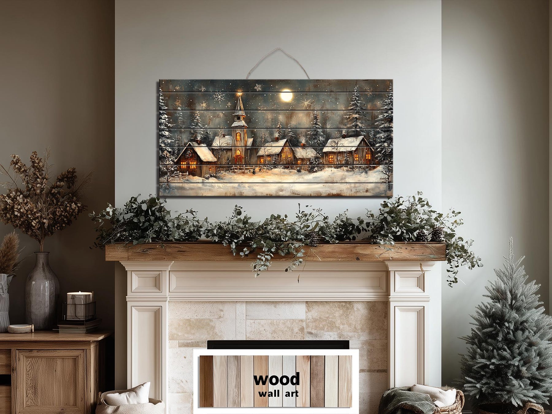 Rustic Christmas Snowy Village Distressed Wood Wall Art