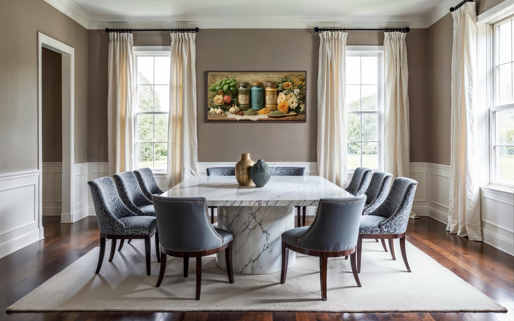 Rustic kitchen wall art featuring herbs and spices in jars displayed in a formal dining room.