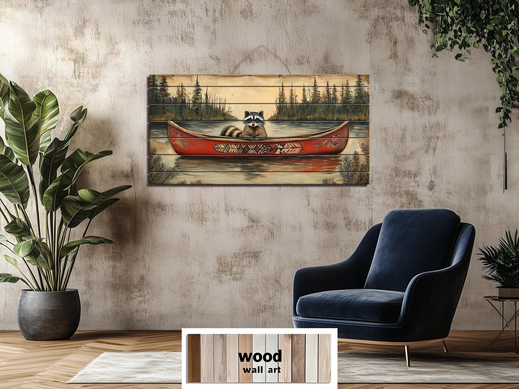 This Rustic Raccoon in Canoe distressed wood wall art tells a charming story of nature, humor, and rustic adventure captured in a single handcrafted piece. The scene centers on a mischievous raccoon sitting proudly in a red canoe, floating along a calm, glassy lake surrounded by pine trees and gentle reflections. The painting embodies the perfect balance between wilderness tranquility and playful storytelling, making it a one-of-a-kind piece that blends warmth, nostalgia, and whimsy. Every stroke of color feels intentional, from the textured shadows that give depth to the forest to the faint shimmer of light across the raccoon’s fur. The distressed wood background enhances its authentic, rustic quality, creating the illusion of a weathered heirloom passed down through generations of outdoor enthusiasts. Subtle imperfections and grain details add tactile charm, transforming what could be a simple illustration into a piece that feels handmade and alive. The raccoon, expressive and full of personality, looks ready to embark on a journey downriver, a whimsical stand-in for anyone who loves lakeside living and quiet adventure. With its vintage appeal and humorous tone, this wall art evokes the feeling of a crisp morning on the water, paddles creaking softly against the canoe, and the scent of pine drifting in the air. The rustic artistry of this piece makes it more than decoration—it’s a reminder of the peace and joy found in nature’s simplicity. Hanging this Rustic Raccoon in Canoe distressed wood wall art in any room immediately fills the space with warmth, curiosity, and the storytelling soul of the outdoors.