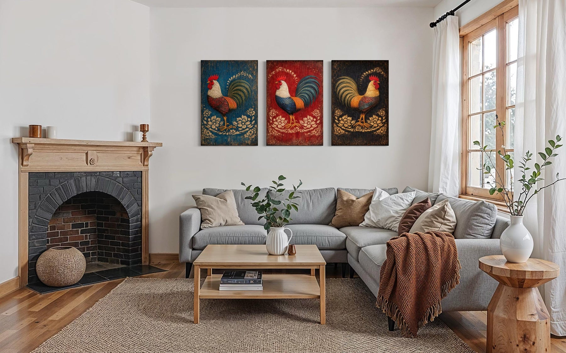 This vivid canvas print set is an ideal match for traditional farmhouse-style living rooms where charm, comfort, and heritage take center stage. With its barn-inspired textures and classic rooster theme, it resonates with homes that feature shiplap walls, distressed wood furnishings, and cozy plaid textiles. Hung above a worn leather sofa or a linen-upholstered couch with burlap and cotton pillows, the piece enhances the layered, welcoming warmth of a lived-in country home. It also complements vintage kitchen nooks or breakfast spaces with warm wood cabinetry and copper accents, especially those styled around a country or French farmhouse theme. This artwork can act as a focal point above a mantelpiece, sideboard, or large central wall in spaces that emphasize nostalgic decor. It fits right into interiors decorated with antiques, enamel cookware, or galvanized metal fixtures. In homes with chicken wire baskets, reclaimed wood frames, and heirloom quilts, this print feels like it’s always belonged. Its theme and visual impact lend themselves to spaces where the personality of rural life is lovingly preserved. Bold yet comforting, it contributes to an aesthetic that values both authenticity and joyful storytelling. Add lasting country character to your space with this rustic rooster wall art.