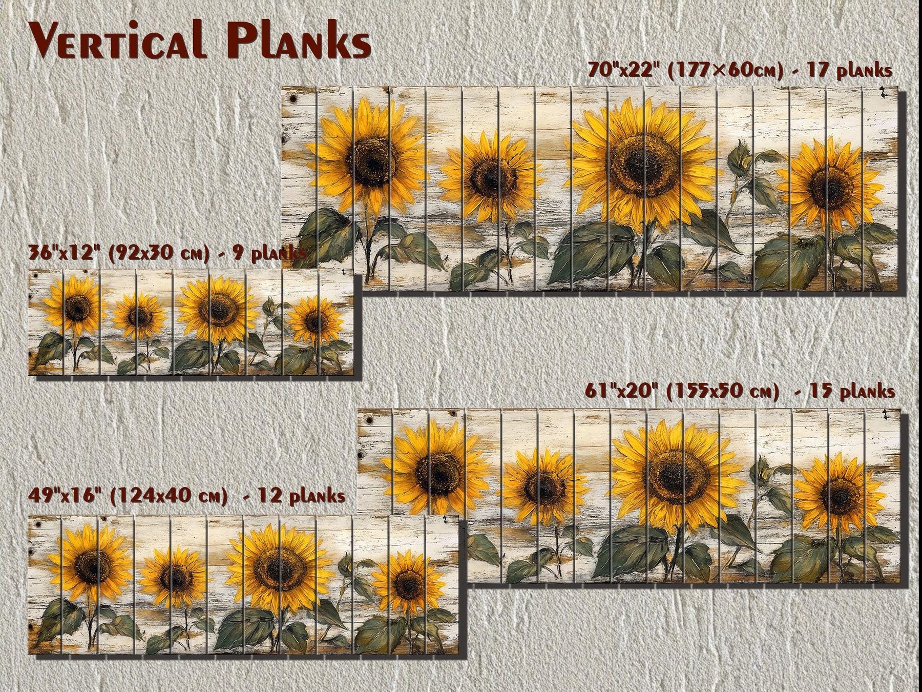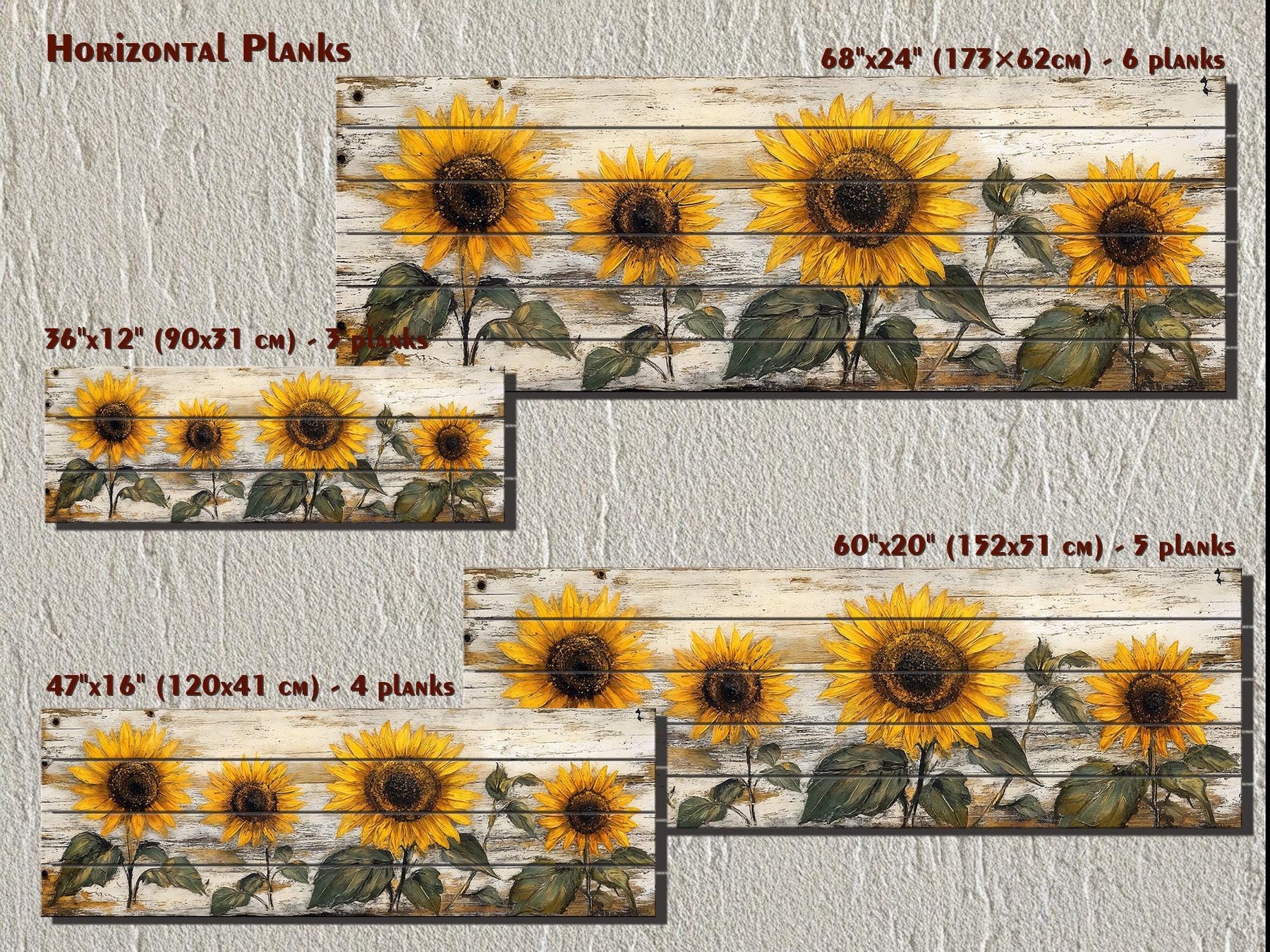 A soft white and warm cream base forms the background, echoing the look of sun-faded paint and creating an airy foundation that keeps the piece light and open. The petals move through rich golden yellow, muted amber, and touches of honeyed orange that give each flower a natural glow without appearing overly bright. Deep brown centers introduce strong contrast and visually anchor the composition along the length of the panel. Gentle gray undertones within the plank texture add depth and prevent the whitewashed surface from appearing flat. Hints of beige and pale taupe blend through the distressed areas and help the artwork pair effortlessly with neutral bedding and natural fabrics. The printed weathering introduces subtle tonal shifts that mimic the irregular character of aged boards while keeping the finish clean and smooth. Soft shadowing around the blooms gives them separation from the background and enhances the dimensional effect. These tones allow the sunflower painting to harmonize with linen textiles, woven throws, and lightly stained wood furniture. The warmth in the yellows prevents the palette from feeling cool and instead creates a cheerful, sunlit atmosphere. This balanced color story gives the rustic sunflower wood wall art a gentle brightness that enhances farmhouse interiors without overpowering them.