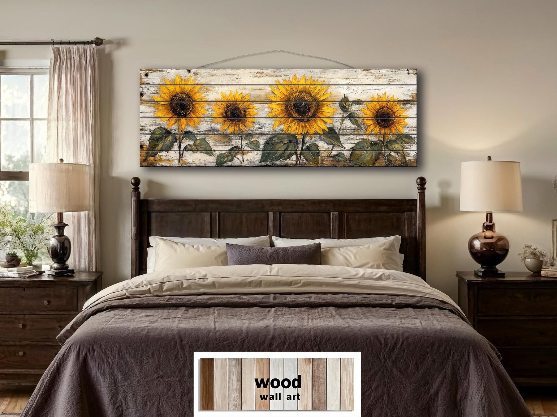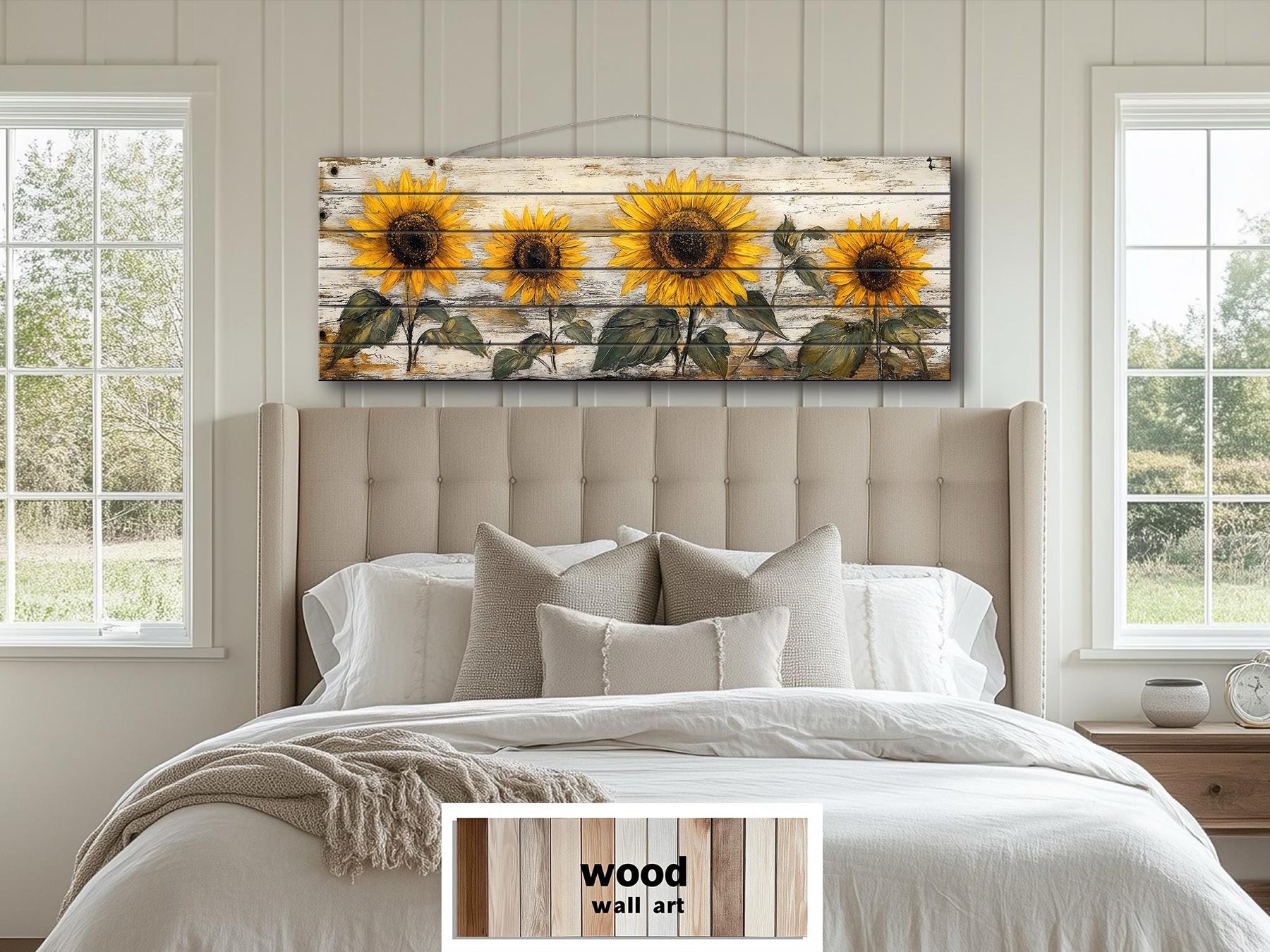 This piece is created specifically for farmhouse bedrooms where the space above the bed becomes the visual center and the sunflower row introduces a sense of warmth and relaxed country character. Hung above a wooden or upholstered headboard, the long narrow format mirrors the width of the bed and immediately completes the wall without the need for additional decor. The real wood panel gives it the visual weight needed to sit naturally against shiplap, painted plank walls, or softly textured plaster. Surrounded by layered quilts, knit throws, and vintage-style nightstands, the sunflower design reinforces the feeling of a comfortable and lived-in retreat. Its calm, repeating composition makes it ideal for spaces meant for rest and slow mornings rather than high activity. The whitewashed background blends seamlessly with light neutral bedding while the golden blooms introduce a warm focal line across the room. The extended horizontal shape visually lowers the height of the wall and creates a more intimate sleeping area. In a rustic master bedroom, the floral subject softens heavier furniture and adds a welcoming touch without becoming overly decorative. This rustic sunflower on whitewashed wood panel wood wall art belongs in interiors that celebrate natural textures, soft color palettes, and the timeless character of farmhouse style.