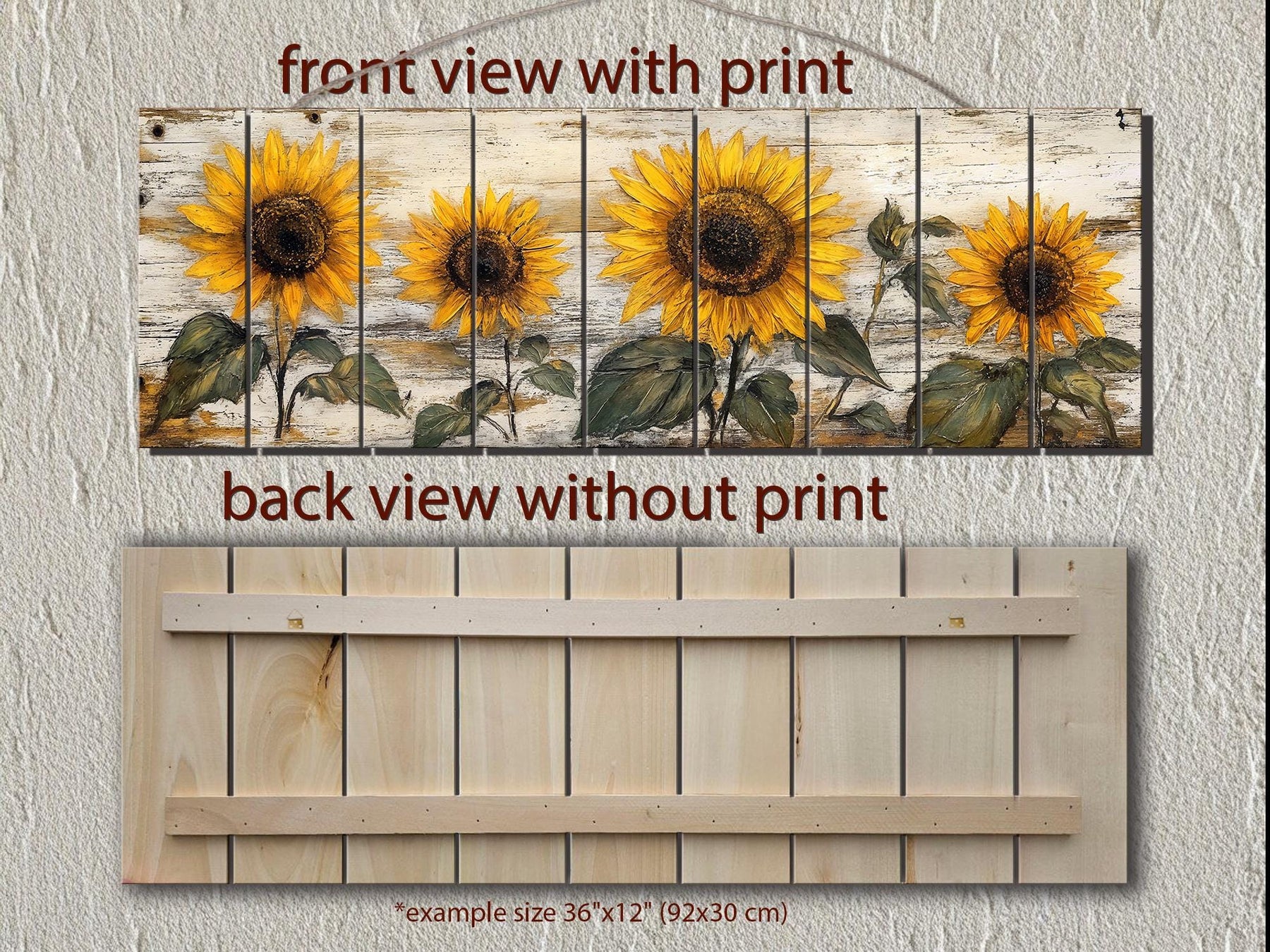 Our rustic sunflower on whitewashed wood panel wood wall art is printed on new solid wood and presents a long narrow composition where a row of fully opened sunflowers stretches across softly weathered white planks, the bright petals standing forward against the faded surface and creating a warm farmhouse focal point. Each bloom is detailed with layered golden tones and deep textured centers that bring depth and natural character, while the horizontal layout follows the width of a headboard and visually completes the wall above it. The whitewashed background carries a gently distressed appearance that suggests aged painted boards, yet the real wood beneath the print remains smooth, strong, and refined. Subtle shadowing beneath the flowers gives dimension and prevents the design from feeling flat, allowing the entire piece to feel handcrafted and substantial. The repetition of the blossoms creates rhythm and balance, turning a simple floral subject into a structured decorative element. This long narrow farmhouse floral wall decor blends rustic charm with clean presentation, making it feel like a collected piece rather than a newly produced print. Fine tonal variation across the plank lines enhances the illusion of time-softened wood and reinforces the antique aesthetic. The elongated format draws the eye naturally across the arrangement and makes the sunflowers feel connected as a single continuous scene. The overall mood of this sunflower artwork is warm, welcoming, and rooted in the comfort of farmhouse living.