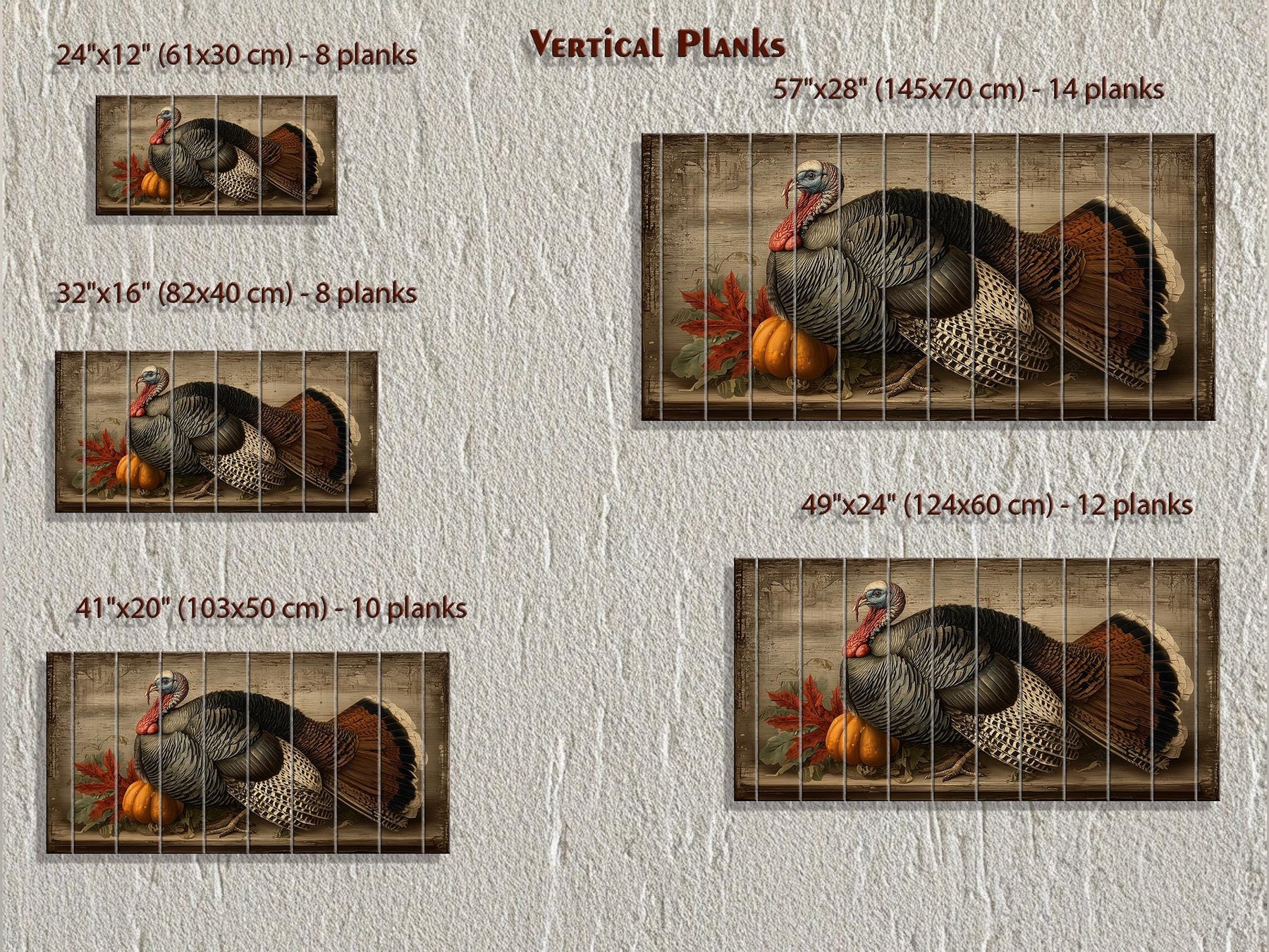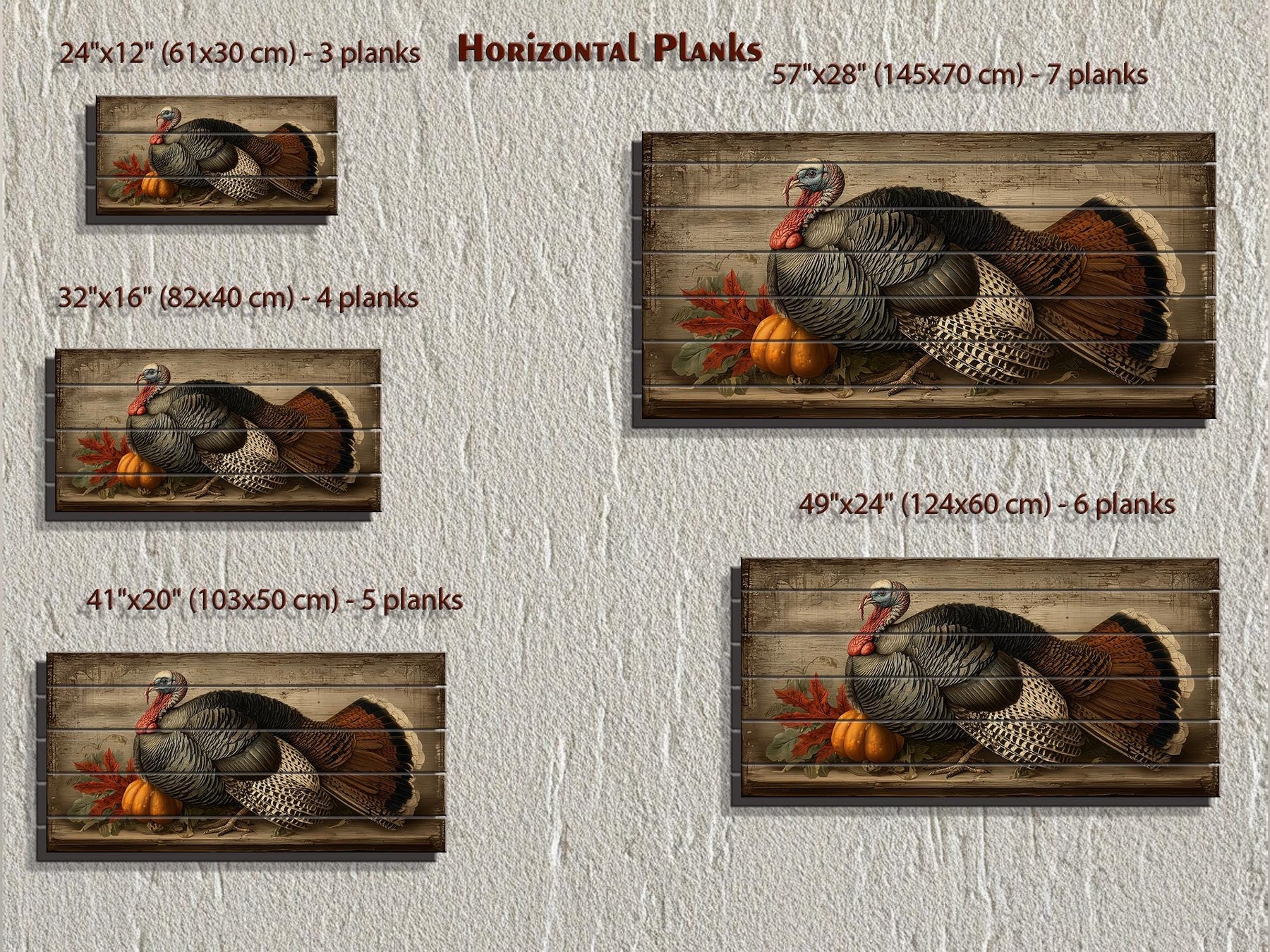The color scheme of this Rustic Thanksgiving Turkey With Pumpkins distressed wood wall art is a warm and inviting palette inspired by the heart of autumn. Deep chestnut browns and soft tans bring out the natural detail in the turkey’s feathers, adding depth and realism. Rich pumpkin oranges and gentle amber tones highlight the festive gourds, while golden yellows suggest late-afternoon sunlight. Olive greens and muted forest hues appear in the surrounding leaves and stems, providing balance and natural contrast. Soft cream and warm beige accents brighten the composition, ensuring that each element remains distinct and visually appealing. Subtle hints of burgundy and rust add richness and warmth, echoing the colors of falling leaves and Thanksgiving feasts. The distressed wood background filters these tones, giving the entire piece a gentle weathered effect that feels timeless and rustic. Whether illuminated by daylight or candlelight, the colors maintain their vibrancy and depth, enhancing the festive atmosphere. This thoughtful blend of warm harvest shades and soft neutrals makes the Rustic Thanksgiving Turkey With Pumpkins painting a natural complement to seasonal decor. The harmonious palette perfectly completes the welcoming charm of Rustic Thanksgiving Turkey With Pumpkins wall decor.