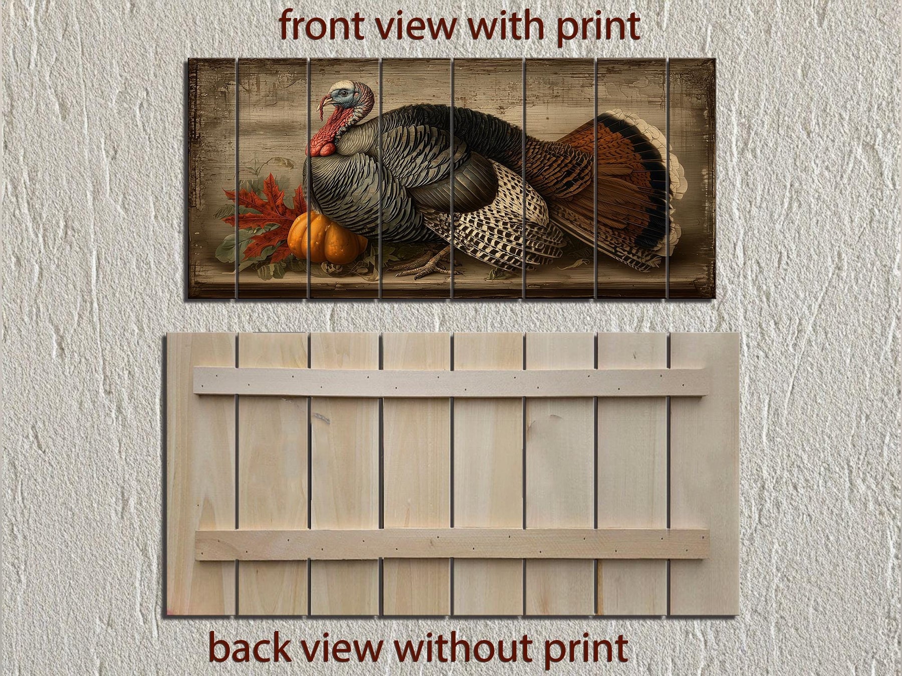Our Rustic Thanksgiving Turkey With Pumpkins distressed wood wall art celebrates the warmth and abundance of harvest season with rich detail and timeless style. This striking painting presents a proud turkey surrounded by plump pumpkins and autumn foliage, capturing the spirit of Thanksgiving in one beautiful composition. Each feather is finely detailed, with subtle highlights and shadows that make the bird appear almost lifelike. The pumpkins glow in soft oranges and deep golds, set against a background of rustic branches and fallen leaves that emphasize the season’s natural beauty. Though the painting is printed on new wood, the carefully distressed finish gives it the look of an heirloom piece treasured through generations. The horizontal layout and vivid textures make it an ideal focal point for festive gatherings and family meals. Its classic imagery blends traditional Americana with artful sophistication, creating a welcoming atmosphere for Thanksgiving celebrations. Whether admired for its craftsmanship or its symbolic meaning, this Rustic Thanksgiving Turkey With Pumpkins painting enriches any dining area or farmhouse setting. With its rich seasonal theme and elegant design, the Rustic Thanksgiving Turkey With Pumpkins wall art becomes an enduring part of your holiday tradition.
